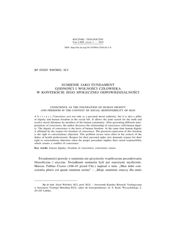 ROCZNIKI TEOLOGICZNE Tom LXIII, zeszyt 3 − 2016 DOI: http://dx.do.org/10.18290/rt.2016.63.3-8 BP JÓZEF WRÓBEL SCJ SUMIENIE JAKO FUNDAMENT GODNOŚCI I WOLNOŚCI CZŁOWIEKA W KONTEKŚCIE JEGO SPOŁECZNEJ ODPOWIEDZIALNOŚCI CONSCIENCE AS THE FOUNDATION OF HUMAN DIGNITY AND FREEDOM IN THE CONTEXT OF SOCIAL RESPONSIBILITY OF MAN A b s t r a c t. Conscience acts not only as a personal moral authority, but it is also a pillar of dignity and human freedom in the social life. It allows the joint search for the truth and resolve moral dilemmas by members of the human community. After presenting different interpretations of conscience, the author discusses the relationship of conscience with human dignity. The dignity of conscience is the basis of human freedom. At the same time human dignity is affirmed by the respect for freedom of conscience. The practical expression of this freedom is the right to conscientious objection. This problem occurs most often in the context of the duties of health professionals. Respect for their personal rights also demands respect for their right to conscientious objection when the proper procedure implies their moral responsibility which creates a conflict of conscience. Key words: human dignity; freedom of conscience; conscience clause. Świadomości prawdy o sumieniu nie przyniosły współczesne poszukiwania filozoficzne i etyczne. Świadkami sumienia byli już starożytni myśliciele. Marcus Tullius Cicero (106-43 przed Chr.) napisał o nim: „Mea mihi conscientia pluris est quam omnium sermo” – „Moje sumienie znaczy dla mnie Bp dr hab. Józef WRÓBEL SCJ, prof. KUL − kierownik Katedry Bioetyki Teologicznej w Instytucie Teologii Moralnej KUL; adres do korespondencji: ul. S. Kard. Wyszyńskiego 2, 20-105 Lublin. 90 BP JÓZEF WRÓBEL SCJ wie˛ cej niż wszystkie mowy [tzn. powszechna opinia]”1. Sumienie nie tylko cieszy sie˛ autorytetem moralnym. Ono jest również gwarantem wewne˛ trznej wolności człowieka, „wie˛ ź bowiem mie˛ dzy wolnościa˛ człowieka a prawem Bożym ma swa˛ żywa˛ siedzibe˛ w «sercu» osoby, czyli w sumieniu”2. Dzie˛ ki niemu człowiek jest też bezpośrednio odpowiedzialny za swoje czyny. Stad ˛ ponadto wynika odpowiedzialność człowieka za formacje˛ swojego sumienia. Nie wystarczy bowiem je mieć. Trzeba również chcieć usłyszeć jego głos i przyjać ˛ płynace ˛ z niego wezwanie. Odpowiedzialność za kształt sumienia i uległość wobec niego nie jest – jak sie˛ cze˛ sto sadzi ˛ – wyłacznie ˛ kwestia˛ indywidualnego poste˛ powania człowieka. Sobór Watykański II zwraca uwage˛ również na jego społeczna˛ role˛ : „Przez wierność sumieniu chrześcijanie łacz ˛ a˛ sie˛ z innymi ludźmi w celu poszukiwania prawdy i rozwiazywania ˛ w prawdzie tak wielu problemów moralnych, które powstaja˛ zarówno w życiu jednostek, jak i we wspólnym życiu społecznym. Im bardziej wie˛ c bierze góre˛ prawe sumienie, tym bardziej osoby i grupy odste˛ puja˛ od ślepej samowoli i staraja˛ sie˛ dostosować do obiektywnych norm moralnych”3. Powyższa prawda odgrywa istotna˛ role˛ w dyskusji nad wolnościa˛ sumienia w kontekście pełnienia partykularnych funkcji społecznych, które implikuja˛ indywidualna˛ odpowiedzialność moralna. ˛ 1. PYTANIE O ISTOTE˛ SUMIENIA Swoja˛ wymowe˛ maja˛ odkrycia etnologiczne stwierdzajace, ˛ że prawie wszystkie ludy pierwotne praktykowały dosyć wysoki ideał moralny oraz były przekonane, że człowiek posiada zdolność do rozróżnienia moralnego czynów oraz wyczucia moralnego dobra, jakkolwiek zdolność ta jest różnie określana4. Sytuacja zmienia sie˛ stopniowo w kre˛ gu grecko-rzymskiej refleksji etycznej, gdzie sumienie otrzymuje po raz pierwszy techniczne określenie. W je˛ zyku greckim jest nazywane syneidesis i poje˛ cie to pochodzi od syn-ioda 1 Ad Atticum epistularum, Appleberg: Northwestern University 1916, 12, 28. JAN PAWEŁ II, Encyklika Veritatis splendor, Watykan 1993, nr 54 (dalej VS). 3 Konstytucja duszpasterska o Kościele w świecie współczesnym Gaudium et spes, Rzym 1965, nr 16 (w: Sobór Watykański II, Konstytucje, Dekrety, Deklaracje, Poznań: Pallottinum 20022) (dalej KDK). 4 Por. M. VIDAL, Manuale di etica teologia, t. 1: Morale fondamentale, Assisi: Cittadella Editrice 1994, s. 525 (Autor ten wylicza jeszcze inne cechy sumienia w rozumieniu ludów pierwotnych). 2 SUMIENIE JAKO FUNDAMENT GODNOŚCI I WOLNOŚCI CZŁOWIEKA 91 (bezokolicznik: syneidenai; dowiedzieć sie˛ naocznie lub intuitywnie, dowiedzieć sie˛ wewne˛ trznie, z przekonaniem rozsadzać). ˛ Oznacza wie˛ c intuicyjna˛ wiedze˛ moralna˛ lub wewne˛ trzne poznanie moralne. W je˛ zyku łacińskim jest ono nazywane conscientia i oznacza „wspólna˛ z kimś wiedze˛ o czymś”, „świadomość własnej wartości moralnej i zasług”, „popełnionych win i wyste˛ pków” oraz „wyrzuty sumienia”5. Systematyczne opracowanie zagadnienia sumienia pojawia sie˛ już w średniowieczu w kre˛ gu filozofii i teologii scholastycznej. Role˛ wiodac ˛ a˛ pełnia˛ tutaj dwa nurty: franciszkański i tomistyczny. Szkoła franciszkańska kładzie nacisk na wymiar woluntarystyczny. Sumienie jest wie˛ c kojarzone z aktem woli ukierunkowanej na czynienie dobra. Z kolei św. Tomasz z Akwinu i jego zwolennicy łacz ˛ a˛ właściwości sumienia z ludzkim intelektem, co oznacza, że sumienie jest zasadniczo aktem rozumu. Niezależnie od powyższych szkół powszechnie uważano, że osad ˛ sumienia jest dokonywany w kontekście prawa moralnego naturalnego. Przez naste˛ pne wieki te dwie szkoły w pewnym zakresie konkurowały ze soba. ˛ Pozycje˛ dominujac ˛ a˛ zyskało jednak uje˛ cie tomistyczne. Dopiero w XIX wieku pojawił sie˛ nowy akcent w uje˛ ciu sumienia, a jego autorami byli przedstawiciele fenomenologii (m.in. F. Brentano, E. Husserl, M. Scheler). Zgodnie z antropologia˛ tego kierunku, sumienie było kojarzone ze sfera˛ p
