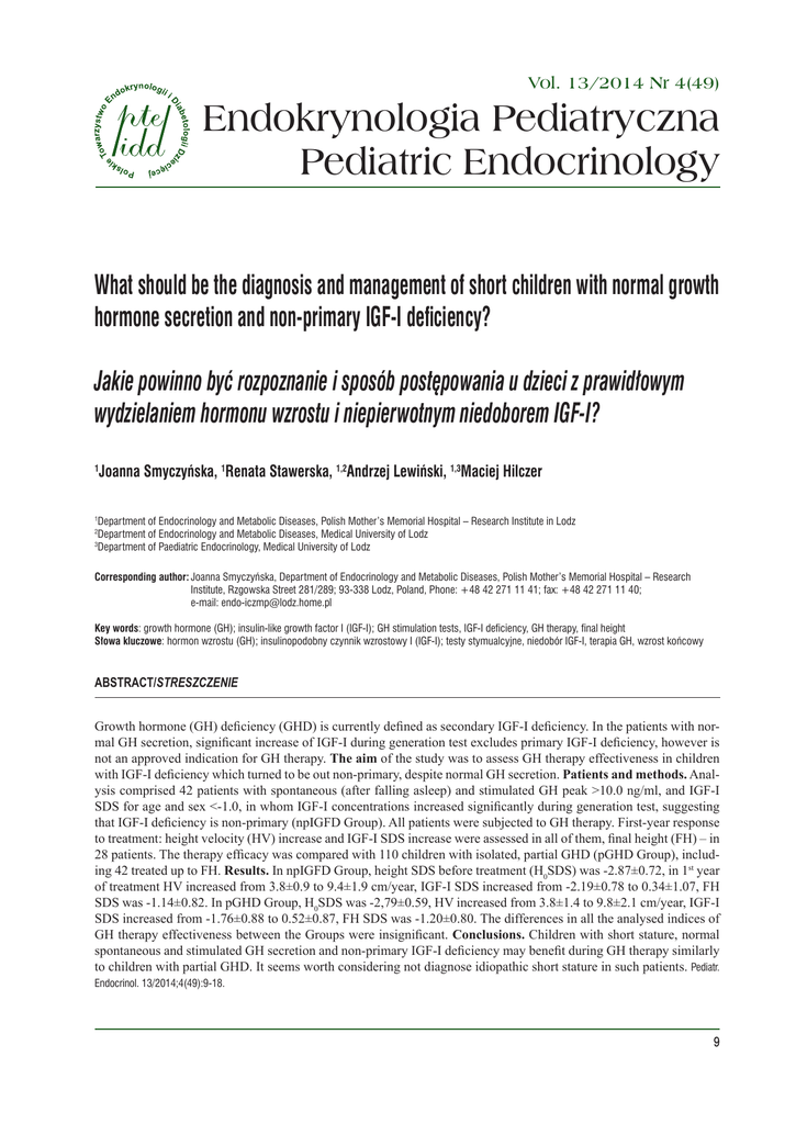 Smyczyńska J. i inni: What should be the diagnosis and management of shortchildren with normal growth hormone secretion and non-primary IGF-I deficiency? Vol. 13/2014 Nr 4(49) Endokrynologia Pediatryczna Pediatric Endocrinology What should be the diagnosis and management of short children with normal growth hormone secretion and non-primary IGF-I deficiency? Jakie powinno być rozpoznanie i sposób postępowania u dzieci z prawidłowym wydzielaniem hormonu wzrostu i niepierwotnym niedoborem IGF-I? Joanna Smyczyńska, 1Renata Stawerska, 1,2Andrzej Lewiński, 1,3Maciej Hilczer 1 Department of Endocrinology and Metabolic Diseases, Polish Mother’s Memorial Hospital – Research Institute in Lodz Department of Endocrinology and Metabolic Diseases, Medical University of Lodz 3 Department of Paediatric Endocrinology, Medical University of Lodz 1 2 Corresponding author:Joanna Smyczyńska, Department of Endocrinology and Metabolic Diseases, Polish Mother’s Memorial Hospital – Research Institute, Rzgowska Street 281/289; 93-338 Lodz, Poland, Phone: +48 42 271 11 41; fax: +48 42 271 11 40; e-mail: [email protected] Key words: growth hormone (GH); insulin-like growth factor I (IGF-I); GH stimulation tests, IGF-I deficiency, GH therapy, final height Słowa kluczowe: hormon wzrostu (GH); insulinopodobny czynnik wzrostowy I (IGF-I); testy stymualcyjne, niedobór IGF-I, terapia GH, wzrost końcowy ABSTRACT/STRESZCZENIE Growth hormone (GH) deficiency (GHD) is currently defined as secondary IGF-I deficiency. In the patients with normal GH secretion, significant increase of IGF-I during generation test excludes primary IGF-I deficiency, however is not an approved indication for GH therapy. The aim of the study was to assess GH therapy effectiveness in children with IGF-I deficiency which turned to be out non-primary, despite normal GH secretion. Patients and methods. Analysis comprised 42 patients with spontaneous (after falling asleep) and stimulated GH peak >10.0 ng/ml, and IGF-I SDS for age and sex <-1.0, in whom IGF-I concentrations increased significantly during generation test, suggesting that IGF-I deficiency is non-primary (npIGFD Group). All patients were subjected to GH therapy. First-year response to treatment: height velocity (HV) increase and IGF-I SDS increase were assessed in all of them, final height (FH) – in 28 patients. The therapy efficacy was compared with 110 children with isolated, partial GHD (pGHD Group), including 42 treated up to FH. Results. In npIGFD Group, height SDS before treatment (H0SDS) was -2.87±0.72, in 1st year of treatment HV increased from 3.8±0.9 to 9.4±1.9 cm/year, IGF-I SDS increased from ‑2.19±0.78 to 0.34±1.07, FH SDS was -1.14±0.82. In pGHD Group, H0SDS was -2,79±0.59, HV increased from 3.8±1.4 to 9.8±2.1 cm/year, IGF-I SDS increased from -1.76±0.88 to 0.52±0.87, FH SDS was ‑1.20±0.80. The differences in all the analysed indices of GH therapy effectiveness between the Groups were insignificant. Conclusions. Children with short stature, normal spontaneous and stimulated GH secretion and non-primary IGF-I deficiency may benefit during GH therapy similarly to children with partial GHD. It seems worth considering not diagnose idiopathic short stature in such patients. Pediatr. Endocrinol. 13/2014;4(49):9-18. 9 Praca oryginalna Endokrynol. Ped., 13/2014;4(49):9-18 Somatotropinowa niedoczynność przysadki (SNP) definiowana jest obecnie jako wtórny niedobór IGF-I. U pacjentów z prawidłowym wydzielaniem hormonu wzrostu (GH) znamienny wzrost sekrecji IGF-I podczas testu generacji wyklucza pierwotny niedobór IGF-I, natomiast nie jest uważany za wskazanie do terapii preparatem GH. Celem pracy była ocena skuteczności terapii GH u dzieci z niedoborem IGF-I, który okazał się niepierwotny pomimo prawidłowego wydzielania GH w testach dynamicznych. Pacjenci i metody. Analizą objęto 42 pacjentów z prawidłowym wydzielaniem GH po zaśnięciu i w testach stymulacyjnych (>10.0 ng/ml) oraz obniżonym stężeniem IGF-I (IGF‑I SDS dla wieku i płci <-1.0) wzrastającym znamiennie w teście generacji, tj. z niepierwotnym niedoborem IGF-I (npIGFD). Pacjenci byli leczeni preparatem GH. Skuteczność leczenia oceniono na podstawie poprawy tempa wzrastania i poprawy wartości IGF-I SDS w pierwszym roku terapii u wszystkich pacjentów oraz uzyskanego wzrostu końcowego u 28 pacjentów. Grupę porównawczą stanowiło 110 dzieci z izolowanym, częściowym niedoborem GH (pGHD), w tym 42 pacjentów którzy uzyskali FH. Wyniki. W grupie npIGFD wartość SDS wysokości ciała przed leczeniem (H0SDS) wynosiła -2,87±0,72, w pierwszym roku terapii nastąpił wzrost HV z 3,8±0,9 to 9,4±1,9 cm/rok, wartość IGF-I SDS wzrosła z ‑2,19±0,78 do 0.34±1,07, wartość FH SDS wynosiła ‑1.14±0.82. W grupie pGHD wartość H0SDS wynosiła -2,79±0,59, w pierwszym roku leczenia nastąpił przyrost HV z 3,8±1,4 do 9,8±2,1 cm/rok i wzrost, IGF-I SDS z -1,76±0,88 do 0,52±0,87 wartość FH SDS wynosiła ‑1,20±0,80. Wszystkie analizowane wskaźniki nie różniły się znamiennie pomiędzy grupami. Wnioski. U dzieci z niepierwotnym niedoborem IGF-I, pomimo prawidłowego wydzielania GH po zaśnięciu i w testach stymulacyjnych, leczenie preparatem GH może być równie skuteczne, jak u dzieci z pGHD. Wydaje się, że w takich przypadkach nie należy rozpoznawać idiopatycznego niedoboru wzrostu.Endokrynol. Ped. 13/2014;4(49):9-18. Growth hormone (GH) deficiency (GHD) is the main indication to recombinant human GH (rhGH) therapy in children with short stature. The diagnosis of GHD is routinely based on decreased GH secretion in stimulation tests. Nevertheless, other disorders of GH secretion and action – potentially treatable with rhGH – decreased spontaneous GH secretion, i.e. neurosecretory dysfunction (NSD) and decreased GH bioactivity, may be diagnosed in the patients with normal results of GH stimulation tests, however GH insensitivity should be ex