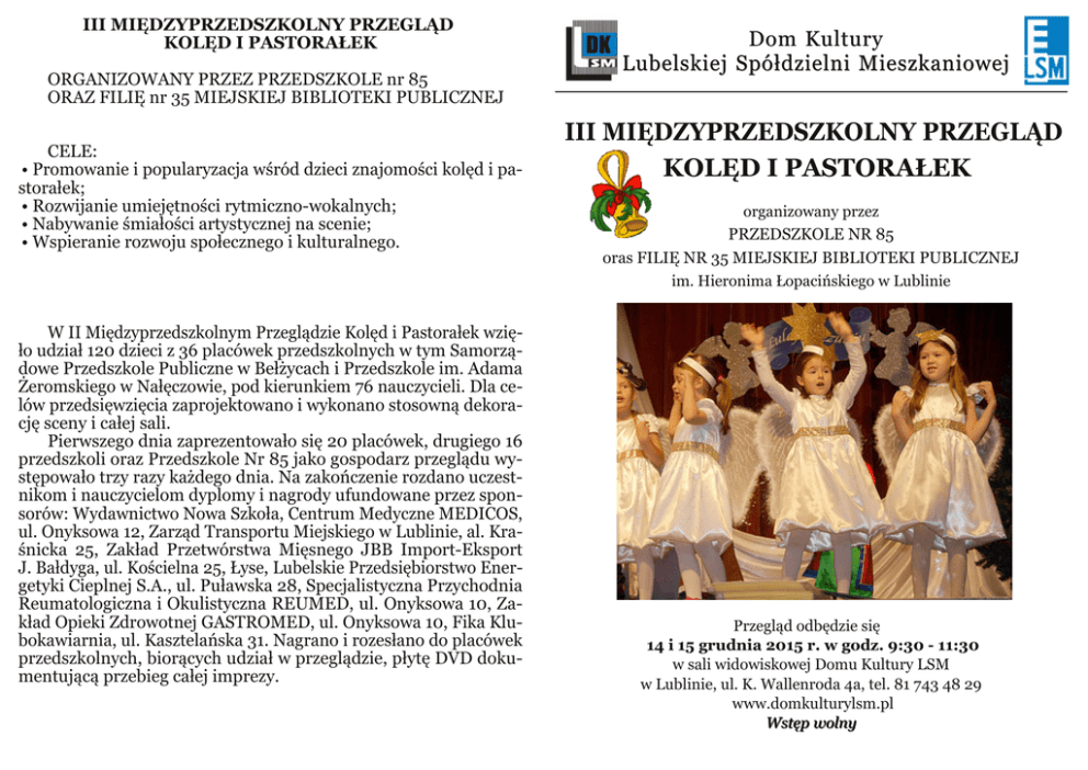 III MIĘDZYPRZEDSZKOLNY PRZEGLĄD KOLĘD I PASTORAŁEK ORGANIZOWANY PRZEZ PRZEDSZKOLE nr 85 ORAZ FILIĘ nr 35 MIEJSKIEJ BIBLIOTEKI PUBLICZNEJ CELE: • Promowanie i popularyzacja wśród dzieci znajomości kolęd i pa storałek; • Rozwijanie umiejętności rytmicznowokalnych; • Nabywanie śmiałości artystycznej na scenie; • Wspieranie rozwoju społecznego i kulturalnego. W II Międzyprzedszkolnym Przeglądzie Kolęd i Pastorałek wzię ło udział 120 dzieci z 36 placówek przedszkolnych w tym Samorzą dowe Przedszkole Publiczne w Bełżycach i Przedszkole im. Adama Żeromskiego w Nałęczowie, pod kierunkiem 76 nauczycieli. Dla ce lów przedsięwzięcia zaprojektowano i wykonano stosowną dekora cję sceny i całej sali. Pierwszego dnia zaprezentowało się 20 placówek, drugiego 16 przedszkoli oraz Przedszkole Nr 85 jako gospodarz przeglądu wy stępowało trzy razy każdego dnia. Na zakończenie rozdano uczest nikom i nauczycielom dyplomy i nagrody ufundowane przez spon sorów: Wydawnictwo Nowa Szkoła, Centrum Medyczne MEDICOS, ul. Onyksowa 12, Zarząd Transportu Miejskiego w Lublinie, al. Kra śnicka 25, Zakład Przetwórstwa Mięsnego JBB ImportEksport J. Bałdyga, ul. Kościelna 25, Łyse, Lubelskie Przedsiębiorstwo Ener getyki Cieplnej S.A., ul. Puławska 28, Specjalistyczna Przychodnia Reumatologiczna i Okulistyczna REUMED, ul. Onyksowa 10, Za kład Opieki Zdrowotnej GASTROMED, ul. Onyksowa 10, Fika Klu bokawiarnia, ul. Kasztelańska 31. Nagrano i rozesłano do placówek przedszkolnych, biorących udział w przeglądzie, płytę DVD doku mentującą przebieg całej imprezy. Dom Kultury Lubelskiej Spółdzielni Mieszkaniowej III MIĘDZYPRZEDSZKOLNY PRZEGLĄD KOLĘD I PASTORAŁEK organizowany przez PRZEDSZKOLE NR 85 oras FILIĘ NR 35 MIEJSKIEJ BIBLIOTEKI PUBLICZNEJ im. Hieronima Łopacińskiego w Lublinie Przegląd odbędzie się 14 i 15 grudnia 2015 r. w godz. 9:30 11:30 w sali widowiskowej Domu Kultury LSM w Lublinie, ul. K. Wallenroda 4a, tel. 81 743 48 29 www.domkulturylsm.pl W s t ę p w ol n y Dom Kultury Lubelskiej Spółdzielni Mieszkaniowej III MIĘDZYPRZEDSZKOLNY PRZEGLĄD KOLĘD I PASTORAŁEK organizowany przez PRZEDSZKOLE NR 85 oras FILIĘ NR 35 MIEJSKIEJ BIBLIOTEKI PUBLICZNEJ im. Hieronima Łopacińskiego w Lublinie