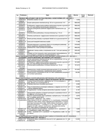 Boisko Pomierzyn nr 10 Lp. Podstawa ZESTAWIENIE POZYCJI KOSZTORYSU Opis jedn Obmiar .obm. 1 BOISKO WIELOFUNKCYJNE DO PIŁKI RĘCZNEJ I KOSZYKÓWKI CPV 45212221-1 1 kalkulacja Rozbiórka zasieku na opał kpl. 1,000 d.1 własna 2 KNNR 6 Koryta wykonywane mechanicznie gł. 30 cm w gruncie kat. II-VI m2 968,000 d.1 0101-03 2 3 KNNR 6 Profilowanie i zagęszczanie podłoża wykonywane ręcznie w gruncie m 968,000 d.1 0103-01 kat. II-IV pod warstwy konstrukcyjne nawierzchni 4 KNNR 6 Warstwy podsypkowe piaskowe zagęszczane mechanicznie o gr. m2 968,000 d.1 0105-04 10 cm Krotność 2 5 KNNR 6 Warstwa dolna podbudowy z kruszyw łamanych gr. 15 cm m2 968,000 d.1 0113-01 6 KNNR 6 Warstwy wyrónawcze zagęszczane mechanicznie o grubości 5 cm m2 968,000 d.1 0106-04 7 KNR 2-31 Rowki pod ławy obrzeży o wymiarach 20x20 cm w gruncie kat.III-IV m 275,600 d.1 0401-02 8 KNR 2-31 Ława pod krawężniki betonowa zwykła m3 7,166 d.1 0402-03 9 KNNR 6 Obrzeża betonowe o wymiarach 30x8 cm na podsypce piaskowej, m 275,600 d.1 0404-04 spoiny wypełnione zaprawą cementową 10 Kalkulacja Nawierzchnia trawa syntetyczna piaskowa m2 968,000 d.1 dostawcy 11 KNNR 1 Załadunek i transp.urobku z korytowania na odl. 1 km sam.samowy- m3 290,400 d.1 0206-03 ład. 12 KNNR 1 Dodatek za 9 km transportu ziemi samochodami samowyładowczy- m3 290,400 d.1 0208-02 mi po drogach o nawierzchni utwardzonej(kat.gr. I-IV) Razem dział BOISKO WIELOFUNKCYJNE DO PIŁKI RĘCZNEJ I KOSZYKÓWKI CPV 45212221-1 2 CHODNIK Z KOSTKI BRUKOWEJ BETONOWEJ CPV 45233222-1 13 KNNR 6 Koryta wykonywane mechanicznie gł. 20 cm w gruncie kat. II-VI na m2 191,810 d.2 0101-02 całej szerokości jezdni i chodników 2 14 KNNR 6 Profilowanie i zagęszczanie podłoża wykonywane ręcznie w gruncie m 191,800 d.2 0103-01 kat. II-IV pod warstwy konstrukcyjne nawierzchni 15 KNNR 6 Warstwa górna podbudowy z kruszyw łamanych gr. 10 cm m2 191,810 d.2 0113-05 analogia 16 KNNR 6 Nawierzchnia z kostki brukowej betonowej grubości 8 cm na podsy- m2 191,800 d.2 0502-03 pce cementowo-piaskowej z wypełnieniem spoin piaskiem 17 KNNR 1 Wywóz gruntu z korytowania na odl. do 10km (składowisko pozyska-m3 38,360 d.2 0206-04 + ne na koszt wykonawcy) KNNR 1 0208-02 Razem dział CHODNIK Z KOSTKI BRUKOWEJ BETONOWEJ CPV 45233222-1 3 PIŁKOCHWYT BOISKA WIELOFUNKCYJNEGO WYSOKOŚCI 4M CPV 45342000-6 18 KNNR 1 Wykopy liniowe lub jamiste o głębokości do 1,5 m ze skarpami o m3 60,000 d.3 0305-02 szer. dna do 1,5 m w gruncie kat. III 19 KNR 2-02 Podkłady betonowe na podłożu gruntowym m3 0,586 d.3 1101-01 20 KNR 2-02 Stopy fundamentowe prostokątne żelbetowe, o objętości do 0,5 m3 m3 4,384 d.3 0204-01 - ręczne układanie betonu 21 KNR 2-02 Przygotowanie i montaż zbrojenia elementów budynków i budowli t 0,197 d.3 0290-02 22 KNNR 1 Zasypywanie wykopów o ścianach pionowych o szerokości 0.8-2.5 m3 55,030 d.3 0318-01 m i głęb.do 1.5 m w gr.kat. I-III 23 KNNR 1 Ręczne rozplantowanie ziemi wydobytej z wykopów przy 1 m3 ziemi m3 4,970 d.3 0504-02 na 1 m wykopu; grunt kat.III 24 Kalkulacja Ogrodzenie - piłkochwyt - wys. 4,00cm m 144,540 d.3 wykonawcy Słupy stalowe Q 80 mm, wysokość 5,2 m, ocynkowane, dwukrotnie malowane, kolor zielony. Słupy zabezpieczone kapturkiem z mrozoodpornego tworzywa sztucznego. Siatka stalowa ocynkowana, zabezpieczona otuliną PCV, o oczkach 4 x 4 cm , kolor zieleń. Linki naciągowe do siatki, stalowe, ocynkowane, zabezpieczone otuliną PCV, kolor zielony Fundamenty wg, rysunku A 4 25 KNR 2-02 Brama wjazdowa dwuskrzydlowa - wysokość 2,5 m , szerokość 3 kpl. 1,000 d.3 1808-10 m. Wypełnienie z siatki, kolor zielony. 26 KNR 2-02 Furtka - wysokość 2,5 m, szerokość 1 m. Wypełnienie z siatki , ko- kpl. 1,000 d.3 1808-05 lor zielony. analogia Razem dział PIŁKOCHWYT BOISKA WIELOFUNKCYJNEGO WYSOKOŚCI 4M CPV 45342000-6 4 WYPOSAŻENIE BOISK CPV 45212221-1 27 KNR 2-01 Wykopanie dołów o powierzchni dna do 0.2 m2 i głębokości do 1.0 dół. 14,000 d.4 0312-10 m (kat.gr.III) -1- Norma 3.28 Licencja: 8726 dla Maciej Skubiszyński Cena jedn. Wartość Boisko Pomierzyn nr 10 Lp. Podstawa 28 KNR 2-23 d.4 0308-02 29 KNR 2-23 d.4 0309-02 30 KNR 2-23 d.4 0309-07 31 KNR 2-23 d.4 0309-05 32 KNR 2-23 d.4 0309-07 33 KNR 2-23 d.4 0309-06 34 KNR 2-23 d.4 0309-07 35 KNR 2-23 d.4 0310-04 ZESTAWIENIE POZYCJI KOSZTORYSU Opis jedn .obm. Wykonanie fundamentów betonowych z betonu żwirowego o obj.0.3 m3 m3 dla osadzenia wyposażenia boisk Osadzenie tulei do słupków i stojaków siatkówki szt. Obmiar 2,450 2,000 Ramki do pokrywek na tuleje szt. 2,000 Osadzenie tulei do słupków i stojaków do bramek piłki ręcznej szt. 4,000 Ramki do pokrywek na tuleje szt. 4,000 Osadzenie tulei do słupków i stojaków do koszykówki szt. 4,000 Ramki do pokrywek na tuleje szt. 4,000 Ustawienie w gotowych otworach zestawu do koszykówki na zeszt. wnątrz, jednosłupowy, tablica epoksydowa 90x120, cynkowany, obręcz cynkowana z siateczką łąńcuchową mocowany w tulejach z możliwością demontażu 36 KNR 2-23 Ustawienie w gotowych otworach bramek do piłki ręcznej profesjona-szt. d.4 0310-06 lnych aluminiowych (2,00x3,00m) wraz z siatką z łukami składanymi, montowanymi do podłoża na talerzykach demontowalne 37 KNR 2-23 Ustawienie w gotowych otworach słupków do siatkówki wielofunkcyj- szt. d.4 0310-02 nych z płynna regulacją wysokości wraz z siatką Razem dział WYPOSAŻENIE BOISK CPV 45212221-1 5 DRENAŻ FRANCUSKI CPV 45232130-2 38 KNR 2-01 Ręczne kopanie rowów dla drenażu francuskiego m d.5 0701-02 39 KNR 2-01 Drenaż - podsypka filtracyjna ze żwiru lub pospółki w gotowym su- m3 d.5 0610-02 chym wykopie z przygotowaniem kruszywa 40 KNR AT-04 Geowłóknina o szer. 3,2 m m2 d.5 0101-03 41 KNR 2-01 Drenaż - podsypka filtracyjna z piasku w gotowym suchym wykopie m3 d.5 0610-01 z przygotowaniem kruszywa 42 KNNR 1 Wywóz nadmiaru gruntu na odl. do 10km (składowisko pozyskane m3 d.5 0206-04 + na koszt wykonawcy) KNNR 1 0208-02 Razem dział DRENAŻ FRANCUSKI CPV