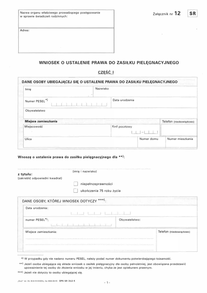 Nazwa organu właściwego prowadzącego postępowanie Załącznik nr w sprawie świadczeń rodzinnych: 12 Adres: WNIOSEK O USTALENIE PRAWA DO ZASIŁKU PIELĘGNACYJNEGO CZĘŚĆ I r-- DANE OSOBY UBIEGAJĄCEJ SIĘ O USTALENIE PRAWA DO ZASIŁKU PIELĘGNACYJNEGO r-- l Imię Numer PESEL * ) [ I [ - I [ I I I [ I - - -� Miejsce zamieszkania - r Miejscowość , Data urodzenia I [ [ Obywatelstwo '- - Nazwisko Telefon (nieobowiązkowo) Kod pocztowy -- LLJ-I t I I [ Numer domu Ulica I Numer mieszkania I Wnoszę o ustalenie prawa do zasiłku pielęgnacyjnego dla **1: (imię i nazwisko) z tytułu: (zakreślić odpowiedni kwadrat) D niepełnosprawności D ukończenia 75 roku życia DANE OSOBY, KTÓREJ WNIOSEK DOTYCZY ***1: ------- --- Data urodzenia: numer PESEL *): ---- -------1 Obywatelstwo: L 1-.1.--1 Telefon (nieobowiązkowo) Miejsce zamieszkania: . . .. . . . . , .... ....' . ... . I ) W przypadku gdy nie nadano numeru PESEL, należy podać numer dokumentu potwierdzającego tożsamość. ) Jeżeli osoba ubiegająca się składa wniosek o zasiłek pielęgnacyjny dla osoby pełnoletniej, jest obowiązana przedstawić * ** .. upoważnienie tej osoby do złożenia wniosku w jej imieniu, chyba że jest opiekunem prawnym. ***) • Jeżeli nie dotyczy to osoby ubiegającej się . DruX· tel. 61 819·44-64(65), fax 898-38-45 OPS SR 312 K - 1 - Oświadczenie służące ustaleniu uprawnień do za siłku pielęgnacyjnego Oświadczam, że: - powyższe dane są prawdziwe, - zapoznałam/zapoznałem się z warunkami uprawniającymi do zasiłku pielęgnacyjnego, - osoba, której wniosek dotyczy, nie przebywa w instytucji zapewniającej całodobowe utrzymanie, tj. domu pomocy społecznej, placówce opiekuńczo-wychowawczej, młodzieżowym ośrodku wychowawczym, schronisku dla nieletnich, zakładzie poprawczym, areszcie śledczym, zakładzie karnym, zakładzie opiekuńczo-leczniczym, zakładzie pielęgnacyjno-opiekuńczym, a także szkole wojskowej lub innej szkole, jeżeli instytucje te zapewniają nieodpłatnie pełne utrzymanie, - osoba, której wniosek dotyczy, nie pobiera zasiłku pielęgnacyjnego w innej instytucji, - osoba, której wniosek dotyczy, nie jest uprawniona do dodatku pielęgnacyjnego, - członkowi rodziny nie przysługuje za granicą świadczenie na pokrycie wydatków związanych z pielęgnacją osoby, której wniosek dotyczy, lub przepisy o koordynacji systemów zabezpieczenia społecznego lub dwustronne umowy o zabezpieczeniu społecznym stanowią, że przysługujące za granicą świadczenie na pokrycie wydatków związanych z opieką nie wyłącza prawa do takiego świadczenia na podstawie ustawy, - przebywam / nie przebywam') poza granicami Rzeczypospolitej Polskiej") w państwie, w którym mają zastosowanie przepisy o koordynacji systemów zabezpieczenia społecznego···), - członek mojej rodziny, w rozumieniu art. 3 pkt 16 ustawy z dnia 28 listopada 2003 r. o świadczeniach rodzinnych, przebywa/nie przebywa·) poza granicami Rzeczypospolitej Polskiej'·) w państwie, w którym mają zastosowanie przepisy o koordynacji systemów zabezpieczenia społecznego"·). *) * *) ••• ) Niepotrzebne skreślić. Nie dotyczy wyjazdu lub pobytu turystycznego, leczniczego lub związanego z podjęciem przez dziecko kształcenia poza granicami Rzeczypospolitej Polskiej. Przepisy o koordynacji systemów zabezpieczenia społecznego mają zastosowanie na terenie: Austrii, Belgii, Danii, Finlandii, Francji, Grecji, Hiszpanii, Holandii, Irlandii, Luksemburga, Niemiec, Portugalii, Szwecji, Włoch, Wielkiej Brytanii, Cypru, Czech, Estonii, Litwy, Łotwy, Malty, Polski, Słowacji, Słowenii, Węgier, Bułgarii, Rumunii, Norwegii, Islandii, Liechtensteinu, Szwajcarii oraz od 1 lipca 2013 r. Chorwacji. W przypadku zmian mających wpływ na prawo do zasiłku pielęgnacyjnego, w szczególności zaistnienia okoliczności wymienionych powyżej, osoba ubiegająca się jest obowiązana niezwłocznie powiadomić o tych zmianach podmiot realizujący świadczenia rodzinne. Niepoinformowanie organu właściwego prowadzącego postępowanie w sprawie świadczeń rodzinnych o zmianach, o których mowa powyżej, może skutkować powstaniem nienależnie pobranych świadczeń rodzinnych, a w konsekwencji - koniecznością ich zwrotu wraz z odsetkami ustawowymi za opóźnienie. (data, podpis osoby ubiegającej się) Do wniosku dołączam następujące dokumenty: 1) 3) 2) 4) Oświadczam, że jestem świadomy/świadoma odpowiedzialności karnej za złożenie fałszywego oświadczenia. (miejscowość, data) (podpis osoby ubiegającej się składającej oświadczenie) Pouczenie N a podstawie art. 16 ustawy z dnia 2 8 listopada 2003 r . o świadczeniach rodzinnych (Dz. U . z 2015 r . poz. 114, z póżn. zm.), zwanej dalej "ustawą", zasiłek pielęgnacyjny przysługuje: 1) niepełnosprawnemu dziecku; 2) osobie niepełnosprawnej w wieku powyżej 16 roku życia, jeżeli legitymuje się orzeczeniem o znacznym stopniu niepełnosprawności; 3) osobie, która ukończyła 75 lat. Zasiłek pielęgnacyjny przysługuje także osobie niepełnosprawnej w wieku powyżej 16 roku życia, legitymującej się orzeczeniem o umiarkowanym stopniu niepełnosprawności, jeżeli niepełnosprawność powstała w wieku d o ukończenia Zasiłek pielęgnacyjny przysługuje: 1) obywatelom polskim, 2) cudzoziemcom: a) do których stosuje się przepisy o koordynacji systemów zabezpieczenia społecznego, b) jeżeli wynika to z wiążących Rzeczpospolitą Polską umów dwustronnych o zabezpieczeniu społecznym, - 2- 21 roku życia. c) przebywającym na terytorium Rzeczypospolitej Polskiej na podstawie zezwolenia na pobyt stały, zezwolenia na pobyt rezydenta długoterminowego Unii Europejskiej, zezwolenia na pobyt czasowy udzielonego w związku z okolicznościami, o których mowa w art. 127 lub art. 186 ust. 1 pkt 3 ustawy z dnia 12 grudnia 2013 r. o cudzoziemcach (Dz. U. poz. 1650, z późno zm.), lub w związku z uzyskaniem w Rzeczypospolitej Polskiej s