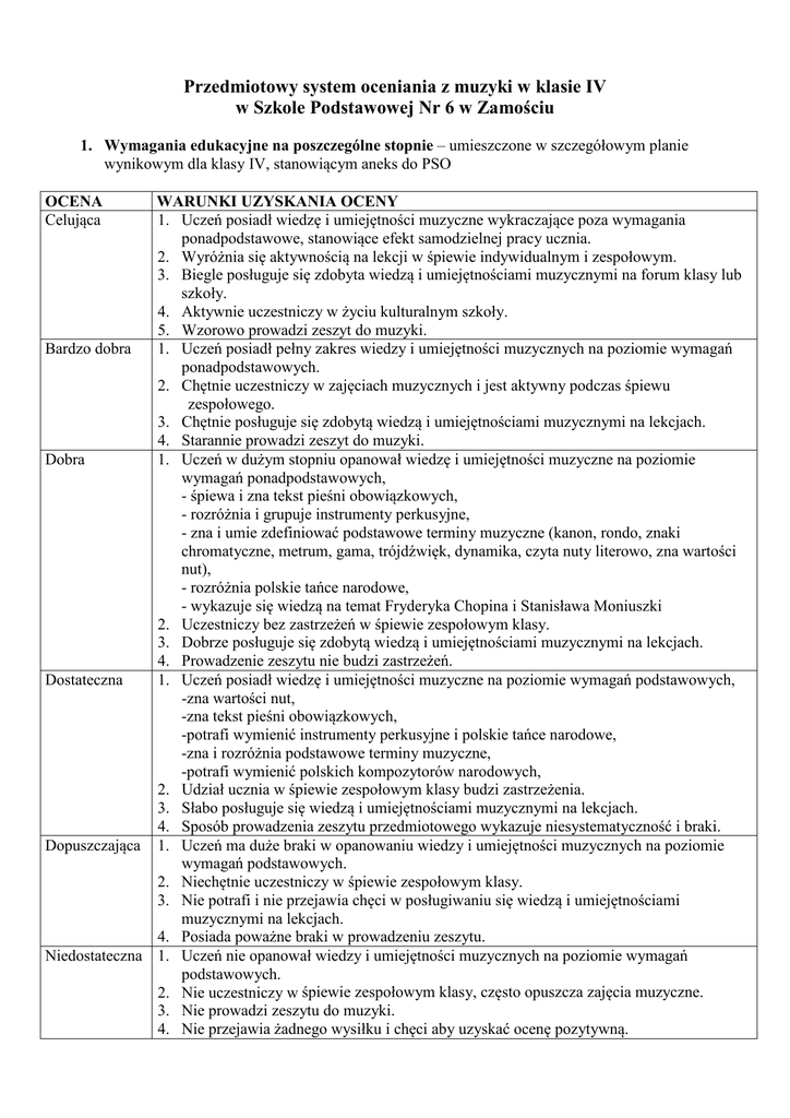 Przedmiotowy system oceniania z muzyki w klasie IV w Szkole Podstawowej Nr 6 w Zamościu 1. Wymagania edukacyjne na poszczególne stopnie – umieszczone w szczegółowym planie wynikowym dla klasy IV, stanowiącym aneks do PSO OCENA Celująca WARUNKI UZYSKANIA OCENY 1. Uczeń posiadł wiedzę i umiejętności muzyczne wykraczające poza wymagania ponadpodstawowe, stanowiące efekt samodzielnej pracy ucznia. 2. Wyróżnia się aktywnością na lekcji w śpiewie indywidualnym i zespołowym. 3. Biegle posługuje się zdobyta wiedzą i umiejętnościami muzycznymi na forum klasy lub szkoły. 4. Aktywnie uczestniczy w życiu kulturalnym szkoły. 5. Wzorowo prowadzi zeszyt do muzyki. Bardzo dobra 1. Uczeń posiadł pełny zakres wiedzy i umiejętności muzycznych na poziomie wymagań ponadpodstawowych. 2. Chętnie uczestniczy w zajęciach muzycznych i jest aktywny podczas śpiewu zespołowego. 3. Chętnie posługuje się zdobytą wiedzą i umiejętnościami muzycznymi na lekcjach. 4. Starannie prowadzi zeszyt do muzyki. Dobra 1. Uczeń w dużym stopniu opanował wiedzę i umiejętności muzyczne na poziomie wymagań ponadpodstawowych, - śpiewa i zna tekst pieśni obowiązkowych, - rozróżnia i grupuje instrumenty perkusyjne, - zna i umie zdefiniować podstawowe terminy muzyczne (kanon, rondo, znaki chromatyczne, metrum, gama, trójdźwięk, dynamika, czyta nuty literowo, zna wartości nut), - rozróżnia polskie tańce narodowe, - wykazuje się wiedzą na temat Fryderyka Chopina i Stanisława Moniuszki 2. Uczestniczy bez zastrzeżeń w śpiewie zespołowym klasy. 3. Dobrze posługuje się zdobytą wiedzą i umiejętnościami muzycznymi na lekcjach. 4. Prowadzenie zeszytu nie budzi zastrzeżeń. Dostateczna 1. Uczeń posiadł wiedzę i umiejętności muzyczne na poziomie wymagań podstawowych, -zna wartości nut, -zna tekst pieśni obowiązkowych, -potrafi wymienić instrumenty perkusyjne i polskie tańce narodowe, -zna i rozróżnia podstawowe terminy muzyczne, -potrafi wymienić polskich kompozytorów narodowych, 2. Udział ucznia w śpiewie zespołowym klasy budzi zastrzeżenia. 3. Słabo posługuje się wiedzą i umiejętnościami muzycznymi na lekcjach. 4. Sposób prowadzenia zeszytu przedmiotowego wykazuje niesystematyczność i braki. Dopuszczająca 1. Uczeń ma duże braki w opanowaniu wiedzy i umiejętności muzycznych na poziomie wymagań podstawowych. 2. Niechętnie uczestniczy w śpiewie zespołowym klasy. 3. Nie potrafi i nie przejawia chęci w posługiwaniu się wiedzą i umiejętnościami muzycznymi na lekcjach. 4. Posiada poważne braki w prowadzeniu zeszytu. Niedostateczna 1. Uczeń nie opanował wiedzy i umiejętności muzycznych na poziomie wymagań podstawowych. 2. Nie uczestniczy w śpiewie zespołowym klasy, często opuszcza zajęcia muzyczne. 3. Nie prowadzi zeszytu do muzyki. 4. Nie przejawia żadnego wysiłku i chęci aby uzyskać ocenę pozytywną. 2. Minimalna ilość ocen w okresie: l.p 1. 2. 3. 4. 5. FORMY AKTYWNOŚCI UCZNIA PODLEGAJĄCE OCENIE W KL. IV Znajomość pieśni obowiązkowych. Wypowiedzi ustne z wiedzy o muzyce. Gra na flecie podłużnym Prowadzenie zeszytu do muzyki. Aktywność i zaangażowanie ucznia na lekcji. ILOŚĆ OCEN 2 1 1 1 1 lub więcej 3. Poprawa oceny cząstkowej (ocena niedostateczna lub dopuszczająca ze sprawdzianów umiejętności muzycznych) – tryb poprawy zgodny z zapisem w WSO Uczeń może poprawić oceny cząstkowe niedostateczne i dopuszczające: z wypowiedzi, ustnej, ze znajomości pieśni obowiązkowych i za prowadzenie zeszytu w terminie do 2-ch tygodni od daty otrzymania oceny negatywnej. 4. Nie przewiduje się sprawdzianów pisemnych z wiedzy o muzyce .Przeprowadza się sprawdziany umiejętności muzycznych, w których ocenia się wysiłek ucznia włożony w wykonywane zadania. 5. Wystawianie oceny śródrocznej i końcowrocznej - ustala się następującą hierarchię ocen cząstkowych: - największe znaczenie mają oceny z wypowiedzi ustnych, - następnie za prowadzenie zeszytu do muzyki, - ze sprawdzianów umiejętności muzycznych np. znajomość pieśni obowiązkowych, - oceny z aktywności i zaangażowania ucznia na lekcji, Ocenę śródroczną i końcoworoczną wystawia się na podstawie ocen cząstkowych z przedmiotu, w ścisłym oparciu o kryteria ocen z muzyki. W ocenie ucznia z przedmiotu muzyka, nie bierze się pod uwagę tylko i wyłącznie zdolności ucznia, lecz wysiłek włożony w wykonywane zadania. Ocenę celującą otrzymuje uczeń ,który aktywnie uczestniczy w życiu kulturalnym szkoły (działalność w zespołach szkolnych) a także uczeń, który posiada wiedze muzyczną wykraczającą poza wymagania edukacyjne. 6. Tryb poprawy oceny rocznej – zgodnie z zapisem w WSO 7. Sposoby informowania uczniów o ocenach – nauczyciel informuje ustnie o każdej ocenie wszystkich uczniów wobec całej klasy. Na życzenie ucznia nauczyciel wpisuje ocenę do zeszytu z muzyki lub do dzienniczka ucznia. 8. Sposoby informowania rodziców o ocenach - zgodnie z zapisem w WSO- rodzice informowani są o ocenach na wywiadówkach. Informacje o ocenach i postępach dziecka w nauce rodzice mogą również uzyskać kontaktując się z wychowawca lub nauczycielem muzyki. Informacja o ocenie śródrocznej i końcoworocznej przekazywana jest rodzicom na wywiadówce przez wychowawcę klasy lub nauczyciela uczącego przedmiotu w terminie zgodnym z WSO i kalendarzem roku szkolnego.