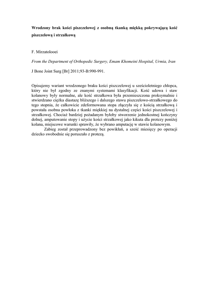 Wrodzony brak kości piszczelowej z osobną tkanką miękką pokrywającą kość piszczelową i strzałkową F. Mirzatolooei From the Department of Orthopedic Surgery, Emam Khomeini Hospital, Urmia, Iran J Bone Joint Surg [Br] 2011;93-B:990-991. Opisujemy wariant wrodzonego braku kości piszczelowej u sześcioletniego chłopca, który nie był zgodny ze znanymi systemami klasyfikacji. Kość udowa i staw kolanowy były normalne, ale kość strzałkowa była przemieszczona proksymalnie i stwierdzano ciężka diastazę bliższego i dalszego stawu piszczelowo-strzałkowego do tego stopnia, że całkowicie zdeformowana stopa złączyła się z kością strzałkową i powstała osobna powłoka z tkanki miękkiej na dystalnej części kości piszczelowej i strzałkowej. Chociaż bardziej pożadanym byłoby stworzenie jednokostnej kończyny dolnej, amputowanie stopy i użycie kości strzałkowej jako kikuta dla protezy poniżej kolana, miejscowe warunki sprawiły, że wybrano amputację w stawie kolanowym. Zabieg został przeprowadzony bez powikłań, a sześć miesięcy po operacji dziecko swobodnie się poruszało z protezą.