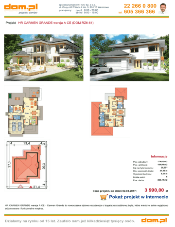 sprzedaż projektów: IMO Sp. z o.o., ul. Grupy AK Północ 4 lok. 9, 00-713 Warszawa pracujemy: pn-pt 8:00 - 20:00 sb-nd 9:00 - 15:00 22 266 0 800 tel. 605 366 366 Projekt HR CARMEN GRANDE wersja A CE (DOM RZ6-61) Informacje Pow. zabudowy: 174,02 m2 Pow. użytkowa: 184,90 m2 Kąt nachylenia dachu: 25,00 0 Min. szerokość działki: 21,40 m Wysokość budynku: 9,21 m 6 Liczba pokoi: Pow. dachu: Cena projektu na dzień 02.03.2017: 325,40 m2 3 990,00 zł Pokaż projekt w internecie HR CARMEN GRANDE wersja A CE - Carmen Grande to nowoczesna stylowa rezydencja o bogatej rozrzeźbionej bryle, która mieści w sobie wyjątkowo zróżnicowane i funkcjonalne wnętrze. Działamy na rynku od 15 lat. Zaufało nam już kilkadziesiąt tysięcy osób.