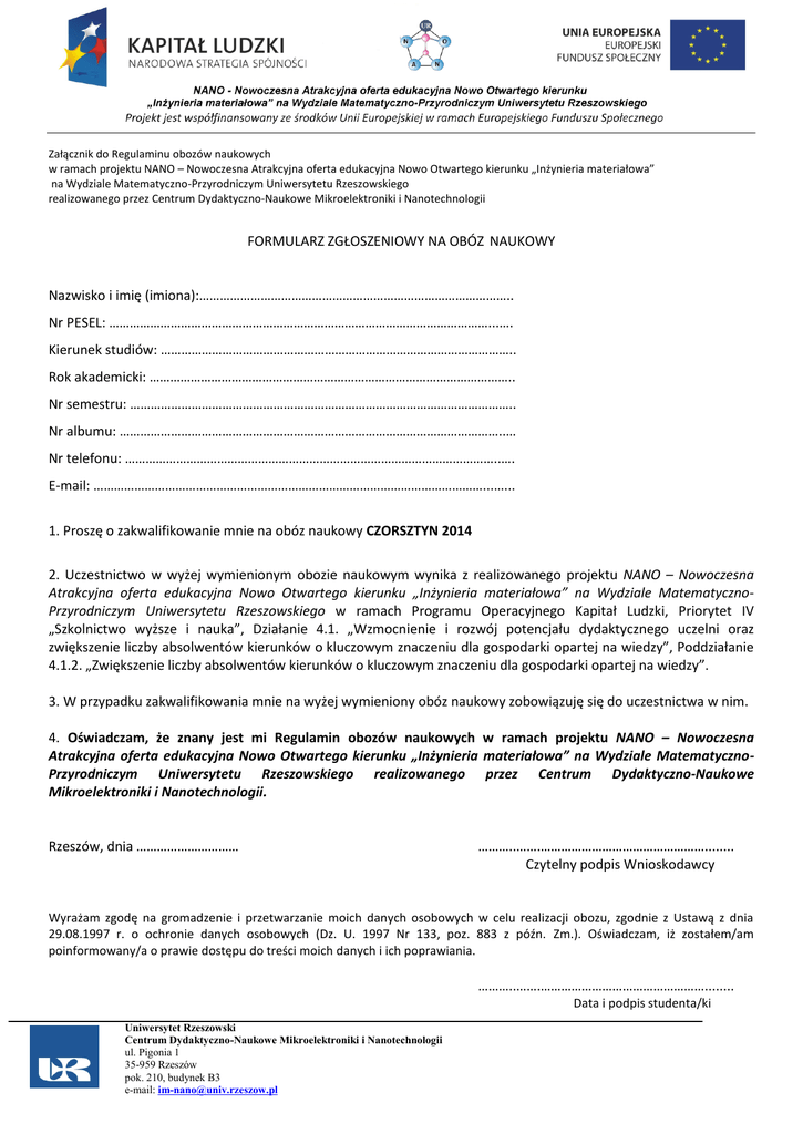 Załącznik do Regulaminu obozów naukowych w ramach projektu NANO – Nowoczesna Atrakcyjna oferta edukacyjna Nowo Otwartego kierunku „Inżynieria materiałowa” na Wydziale Matematyczno-Przyrodniczym Uniwersytetu Rzeszowskiego realizowanego przez Centrum Dydaktyczno-Naukowe Mikroelektroniki i Nanotechnologii FORMULARZ ZGŁOSZENIOWY NA OBÓZ NAUKOWY Nazwisko i imię (imiona):……………………………………………………………………………….. Nr PESEL: …………………………………………………………………………………………………...…. Kierunek studiów: ………………………………………………………………………………………….. Rok akademicki: …………………………………………………………………………………………….. Nr semestru: ………………………………………………………………………………………………….. Nr albumu: …………………………………………………………………………………………………..… Nr telefonu: ………………………………………………………………………………………………..…. E-mail: ……………………………………………………………………………………………………...…... 1. Proszę o zakwalifikowanie mnie na obóz naukowy CZORSZTYN 2014 2. Uczestnictwo w wyżej wymienionym obozie naukowym wynika z realizowanego projektu NANO – Nowoczesna Atrakcyjna oferta edukacyjna Nowo Otwartego kierunku „Inżynieria materiałowa” na Wydziale MatematycznoPrzyrodniczym Uniwersytetu Rzeszowskiego w ramach Programu Operacyjnego Kapitał Ludzki, Priorytet IV „Szkolnictwo wyższe i nauka”, Działanie 4.1. „Wzmocnienie i rozwój potencjału dydaktycznego uczelni oraz zwiększenie liczby absolwentów kierunków o kluczowym znaczeniu dla gospodarki opartej na wiedzy”, Poddziałanie 4.1.2. „Zwiększenie liczby absolwentów kierunków o kluczowym znaczeniu dla gospodarki opartej na wiedzy”. 3. W przypadku zakwalifikowania mnie na wyżej wymieniony obóz naukowy zobowiązuję się do uczestnictwa w nim. 4. Oświadczam, że znany jest mi Regulamin obozów naukowych w ramach projektu NANO – Nowoczesna Atrakcyjna oferta edukacyjna Nowo Otwartego kierunku „Inżynieria materiałowa” na Wydziale MatematycznoPrzyrodniczym Uniwersytetu Rzeszowskiego realizowanego przez Centrum Dydaktyczno-Naukowe Mikroelektroniki i Nanotechnologii. Rzeszów, dnia ………………………… ………..…….…………………………………………........ Czytelny podpis Wnioskodawcy Wyrażam zgodę na gromadzenie i przetwarzanie moich danych osobowych w celu realizacji obozu, zgodnie z Ustawą z dnia 29.08.1997 r. o ochronie danych osobowych (Dz. U. 1997 Nr 133, poz. 883 z późn. Zm.). Oświadczam, iż zostałem/am poinformowany/a o prawie dostępu do treści moich danych i ich poprawiania. ………..…….…………………………………………........ Data i podpis studenta/ki Uniwersytet Rzeszowski Centrum Dydaktyczno-Naukowe Mikroelektroniki i Nanotechnologii ul. Pigonia 1 35-959 Rzeszów pok. 210, budynek B3 e-mail: [email protected] Decyzja Komisji Kwalifikacyjnej: Student/ka został/ła zakwalifikowany/a na obóz naukowy…..……………………………………………..………………………………………. ………………………………………………………………………………………………………………………………………………………………………...………….. …………………………………………………………………………………………………………………………………………………………………………………….. Student/ka nie został/ła zakwalifikowany/a na obóz naukowy ………………….……………………............................................... z powodu …………………………………….........................……………...…………..…………….……………………………………………………………. ………………………………………………………………………………………………………………………………………………………………………...………….. …………………………………………………………………………………………………………………………………………………………………………………….. Komisja Kwalifikacyjna: Kierownik Projektu ……………………………………………………………………………………………. Asystent ds. organizacyjnych i monitoringu ………………………………………………………. Asystent ds. rozliczeń i sprawozdawczości ………………………………………………………… Koordynator ds. współpracy z pracodawcami ……………………………………………………. Uniwersytet Rzeszowski Centrum Dydaktyczno-Naukowe Mikroelektroniki i Nanotechnologii ul. Pigonia 1 35-959 Rzeszów pok. 210, budynek B3 e-mail: [email protected]