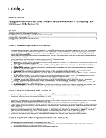 Obowiązuje od 1 sierpnia 2014 r. Szczegółowe warunki obsługi konta Inteligo w kanale mobilnym IKO w Powszechnej Kasie Oszczędności Banku Polskim SA Spis treści Rozdział Rozdział Rozdział Rozdział Rozdział Rozdział Rozdział 1. 2. 3. 4. 5. 6. 7. Przedmiot Szczegółowych warunków i definicje ........................................................................................................................................................................ 1 Udostępnienie i aktywacja kanału mobilnego IKO ..................................................................................................................................................................... 1 Dysponowanie Kontem Inteligo za pośrednictwem kanału mobilnego IKO ................................................................................................................................. 1 Zasady rozliczania transakcji ................................................................................................................................................................................................... 3 Zasady bezpieczeństwa ........................................................................................................................................................................................................... 3 Zmiana postanowień Szczegółowych warunków........................................................................................................................................................................ 4 Inne postanowienia ................................................................................................................................................................................................................. 4 Rozdział 1. Przedmiot Szczegółowych warunków i definicje 1. 2. 1. 2. § 1. Szczegółowe warunki obsługi Konta Inteligo w kanale mobilnym IKO w Powszechnej Kasie Oszczędności Banku Polskim Spółce Akcyjnej, zwane dalej „Szczegółowymi warunkami”, regulują dostęp do Konta Inteligo za pośrednictwem kanału mobilnego IKO, udostępnianego Klientowi w sposób odpowiedni do usługi fakultatywnej w rozumieniu „Ogólnych warunków prowadzenia rachunków i świadczenia usług przez Powszechną Kasę Oszczędności Bank Polski SA dla Posiadaczy Kont Inteligo”, zwanych dalej „Ogólnymi warunkami”. Aktualny wykaz rodzajów rachunków prowadzonych w ramach Kont Inteligo, dla których Bank udostępnia kanał mobilny IKO, podawany jest do wiadomości Klienta na stronie internetowej (inteligo.pl). § 2. Użyte w Szczegółowych warunkach określenia są zgodne z definicjami użytymi w „Ogólnych warunkach”. W pozostałym zakresie, użyte w Szczegółowych warunkach określenia oznaczają: 1) aplikacja IKO – aplikacja mobilna instalowana przez Klienta w procesie aktywacji kanału mobilnego IKO na urządzeniu mobilnym, umożliwiająca dostęp do Konta Inteligo za pośrednictwem kanału mobilnego IKO, 2) czek mobilny – instrument uwierzytelniający, szczególna postać kodu mobilnego, którego użycie wymaga ustanowienia przez Klienta wielorazowego hasła do czeków mobilnych, 3) hasło do czeków mobilnych – instrument uwierzytelniający w postaci poufnego i definiowanego przez Klienta numerycznego ciągu znaków, służącego do wielorazowej autoryzacji użycia czeków, 4) kanał mobilny IKO – rodzaj elektronicznego kanału dostępu do Konta Inteligo z wykorzystaniem urządzenia mobilnego z zainstalowaną aplikacją IKO, 5) kod mobilny – instrument uwierzytelniający w postaci poufnego numerycznego ciągu znaków generowany przez aplikację IKO, 6) PIN – poufny numeryczny ciąg znaków definiowany przez Klienta, służący do weryfikacji Klienta w ramach kanału mobilnego IKO oraz autoryzacji w ramach tego kanału dostępu, 7) QR kod – dwuwymiarowy kod graficzny, którego nośnikiem jest kombinacja modułów w dwóch kontrastowych kolorach, umożliwiający kodowanie informacji w sposób zapewniający ich szybkie odczytanie przez urządzenia wyposażone w przystosowane do tego czytniki, 8) rachunek – rachunek główny bądź dodatkowy prowadzony w ramach Konta Inteligo, udostępniony w kanale mobilnym IKO, 9) transakcja – wypłata gotówki (transakcja gotówkowa) lub dokonanie płatności za towary lub usługi przy użyciu kanału mobilnego IKO, w tym dokonanie płatności w Internecie (transakcja bezgotówkowa) oraz inne usługi dostępne przy użyciu kanału mobilnego IKO, dokonane w ciężar rachunku, 10) transakcja zbliżeniowa – transakcja bezgotówkowa dokonana za pośrednictwem kanału mobilnego IKO przy użyciu technologii zbliżeniowej w terminalu POS lub bankomacie wyposażonym w czytnik zbliżeniowy, 11) urządzenie mobilne – urządzenie elektroniczne pozwalające na odbieranie, przetwarzanie i wysyłanie danych, także przy pomocy sieci bezprzewodowej, które może być swobodnie przenoszone i używane w dowolnym miejscu, spełniające wymagania techniczne niezbędne do instalacji aplikacji IKO. Rozdział 2. Udostępnienie i aktywacja kanału mobilnego IKO 1. 2. 1. 2. 3. 4. 5. 6. § 3. Warunkiem udostępnienia Klientowi kanału mobilnego IKO jest posiadanie przez Klienta aktywnego dostępu do serwisu internetowego. Udostępnienie kanału mobilnego IKO wymaga jego aktywowania przez Klienta. § 4. Kanał mobilny IKO jest aktywowany przez Klienta za pośrednictwem serwisu internetowego przy użyciu instrumentów uwierzytelniających właściwych dla tego kanału dostępu oraz innych rozwiązań technologicznych udostępnionych przez Bank. Szczegółowe informacje dotyczące procesu aktywacji kanału mobilnego IKO podawane są do wiadomości Klienta na stronie internetowej (inteligo.pl). Podczas aktywacji kanału mobilnego IKO Klient rejestruje numer telefonu komórkowego operatora sieci telefonii komórkowej działającego na terytorium Rzeczpospolitej Polskiej, powiązany z urządze