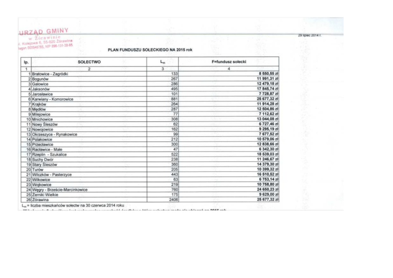 Szczegółowe wymagania wobec wniosków: Wniosek powinien spełniać wymagania ustawowe tj. powinien: • • • • być uchwalony przez zebranie wiejskie z inicjatywy sołtysa, rady sołeckiej lub co najmniej 15 pełnoletnich mieszkańców sołectwa; zawierać wskazanie przedsięwzięć przewidzianych do realizacji na obszarze sołectwa w ramach środków określonych dla danego sołectwa na podstawie informacji, o której mowa w art. 2 ust. 2, wraz z oszacowaniem ich kosztów i uzasadnieniem na każde zadaniełączne koszty wszystkich zadań nie mogą przekraczać kwoty, która została przznaczona do dyspozycji. być przekazany przez sołtysa w terminie do dnia 30 września roku poprzedzającego rok budżetowy, którego dotyczy wniosek, wójtowi gminy celem uwzględnienia go w projekcie budżetu gminy; Wnioski złożone po terminie zostaną odrzucone. dotyczyć przedsięwzięć, które są zadaniami własnymi gminy, służą poprawie warunków życia mieszkańców i są zgodne ze strategią rozwoju gminy. Nie można finansować ze środków funduszu sołeckiego przedsięwzięć, które będą realizowane poza obszarem sołectwa Nie można w trakcie roku budżetowego dokonywać zmian przedsięwzięć można zmieniać limity wydatków na realizację przedsięwzięć zawartych we wniosku Warunki powyższe muszą zostać spełnione wszystkie łącznie. Na co można przeznaczyć środki z funduszu sołeckiego? Pieniądze z funduszu soleckiego można przeznaczyć na realizację tych zadań gminy, które będą służyły poprawie życia mieszkańców danego sołectwa. Przykłady przedsięwzięć: • • • • • • • • • • • • zbudować lub wyremontować plac zabaw (np. przy świetlicy) naprawić chodniki naprawić drogę gminną zadbać o porządek we wsi (np. zagospodarować plac w centrum wsi, nasadzenia trwałe, pielęgnacja zieleni) konserwacja i remont gablot informacyjnych wyremontować wiatę przystankową wyremontować świetlicę doposażyć świetlicę (zakup stołów, krzeseł, dekoracji i innego wyposażenia) wyremontować remizę OSP, zakupić drobne wyposażenie pielęgnacja zieleni i poprawę estetyki terenów użyteczności publicznej organizacja przez radę sołecką uroczystości i imprez masowych (festyny, imprezy sportowo-rekreacyjne, imprezy kulturalne itp.) drobne inwestycje tworzące lub poprawiające infrastrukturę sportową, zakup wyposażenia obiektów sportowych
