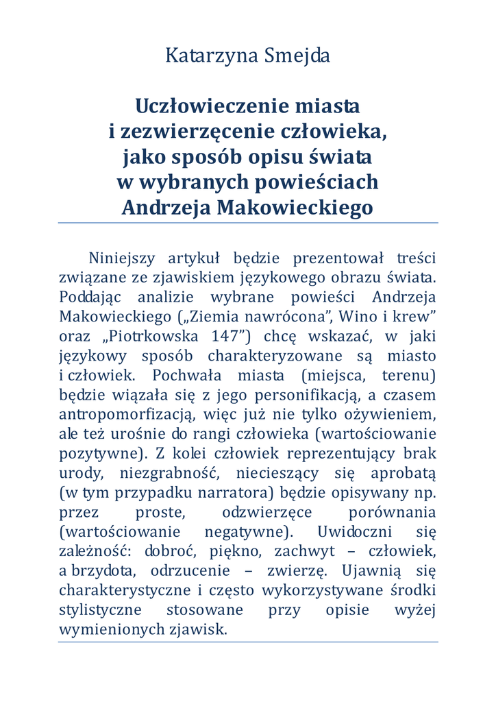 Katarzyna Smejda Uczłowieczenie miasta i zezwierzęcenie człowieka, jako sposób opisu świata w wybranych powieściach Andrzeja Makowieckiego Niniejszy artykuł będzie prezentował treści związane ze zjawiskiem językowego obrazu świata. Poddając analizie wybrane powieści Andrzeja Makowieckiego („Ziemia nawrócona”, Wino i krew” oraz „Piotrkowska 147”) chcę wskazać, w jaki językowy sposób charakteryzowane są miasto i człowiek. Pochwała miasta (miejsca, terenu) będzie wiązała się z jego personifikacją, a czasem antropomorfizacją, więc już nie tylko ożywieniem, ale też urośnie do rangi człowieka (wartościowanie pozytywne). Z kolei człowiek reprezentujący brak urody, niezgrabność, niecieszący się aprobatą (w tym przypadku narratora) będzie opisywany np. przez proste, odzwierzęce porównania (wartościowanie negatywne). Uwidoczni się zależność: dobroć, piękno, zachwyt – człowiek, a brzydota, odrzucenie – zwierzę. Ujawnią się charakterystyczne i często wykorzystywane środki stylistyczne stosowane przy opisie wyżej wymienionych zjawisk.