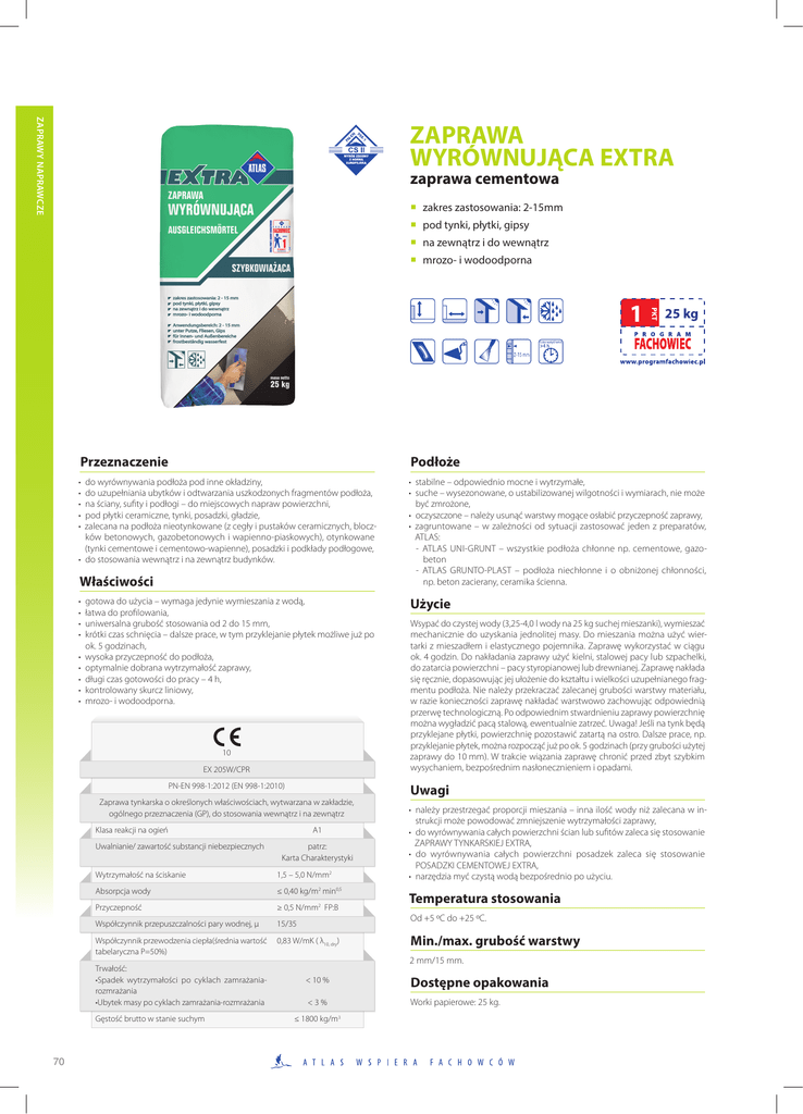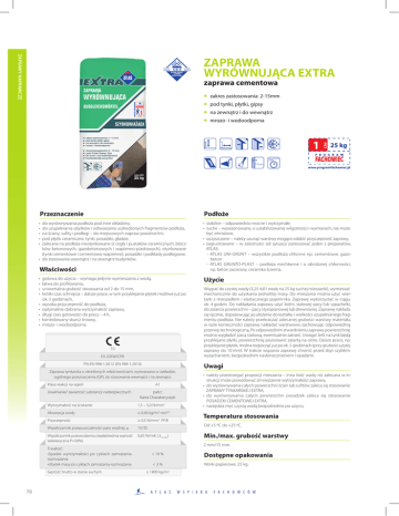 ZAPRAWY NAPRAWCZE ZAPRAWA WYRÓWNUJĄCA EXTRA zaprawa cementowa zakres zastosowania: 2-15mm pod tynki, płytki, gipsy na zewnątrz i do wewnątrz mrozo- i wodoodporna 1 Przeznaczenie Podłoże • do wyrównywania podłoża pod inne okładziny, • do uzupełniania ubytków i odtwarzania uszkodzonych fragmentów podłoża, • na ściany, sufity i podłogi – do miejscowych napraw powierzchni, • pod płytki ceramiczne, tynki, posadzki, gładzie, • zalecana na podłoża nieotynkowane (z cegły i pustaków ceramicznych, bloczków betonowych, gazobetonowych i wapienno-piaskowych), otynkowane (tynki cementowe i cementowo-wapienne), posadzki i podkłady podłogowe, • do stosowania wewnątrz i na zewnątrz budynków. • stabilne – odpowiednio mocne i wytrzymałe, • suche – wysezonowane, o ustabilizowanej wilgotności i wymiarach, nie może być zmrożone, • oczyszczone – należy usunąć warstwy mogące osłabić przyczepność zaprawy, • zagruntowane – w zależności od sytuacji zastosować jeden z preparatów, ATLAS: -- ATLAS UNI-GRUNT – wszystkie podłoża chłonne np. cementowe, gazobeton -- ATLAS GRUNTO-PLAST – podłoża niechłonne i o obniżonej chłonności, np. beton zacierany, ceramika ścienna. Właściwości • gotowa do użycia – wymaga jedynie wymieszania z wodą, • łatwa do profilowania, • uniwersalna grubość stosowania od 2 do 15 mm, • krótki czas schnięcia – dalsze prace, w tym przyklejanie płytek możliwe już po ok. 5 godzinach, • wysoka przyczepność do podłoża, • optymalnie dobrana wytrzymałość zaprawy, • długi czas gotowości do pracy – 4 h, • kontrolowany skurcz liniowy, • mrozo- i wodoodporna. 10 EX 205W/CPR PN-EN 998-1:2012 (EN 998-1:2010) Zaprawa tynkarska o określonych właściwościach, wytwarzana w zakładzie, ogólnego przeznaczenia (GP), do stosowania wewnątrz i na zewnątrz Klasa reakcji na ogień Uwalnianie/ zawartość substancji niebezpiecznych A1 patrz: Karta Charakterystyki Wytrzymałość na ściskanie 1,5 – 5,0 N/mm2 Absorpcja wody ≤ 0,40 kg/m2 min0,5 Przyczepność ≥ 0,5 N/mm2 FP:B Współczynnik przepuszczalności pary wodnej, μ 15/35 Współczynnik przewodzenia ciepła(średnia wartość tabelaryczna P=50%) 0,83 W/mK ( λ10, dry) Trwałość: •Spadek wytrzymałości po cyklach zamrażaniarozmrażania •Ubytek masy po cyklach zamrażania-rozmrażania Gęstość brutto w stanie suchym 70 25 kg Użycie Wsypać do czystej wody (3,25-4,0 l wody na 25 kg suchej mieszanki), wymieszać mechanicznie do uzyskania jednolitej masy. Do mieszania można użyć wiertarki z mieszadłem i elastycznego pojemnika. Zaprawę wykorzystać w ciągu ok. 4 godzin. Do nakładania zaprawy użyć kielni, stalowej pacy lub szpachelki, do zatarcia powierzchni – pacy styropianowej lub drewnianej. Zaprawę nakłada się ręcznie, dopasowując jej ułożenie do kształtu i wielkości uzupełnianego fragmentu podłoża. Nie należy przekraczać zalecanej grubości warstwy materiału, w razie konieczności zaprawę nakładać warstwowo zachowując odpowiednią przerwę technologiczną. Po odpowiednim stwardnieniu zaprawy powierzchnię można wygładzić pacą stalową, ewentualnie zatrzeć. Uwaga! Jeśli na tynk będą przyklejane płytki, powierzchnię pozostawić zatartą na ostro. Dalsze prace, np. przyklejanie płytek, można rozpocząć już po ok. 5 godzinach (przy grubości użytej zaprawy do 10 mm). W trakcie wiązania zaprawę chronić przed zbyt szybkim wysychaniem, bezpośrednim nasłonecznieniem i opadami. Uwagi • należy przestrzegać proporcji mieszania – inna ilość wody niż zalecana w instrukcji może powodować zmniejszenie wytrzymałości zaprawy, • do wyrównywania całych powierzchni ścian lub sufitów zaleca się stosowanie ZAPRAWY TYNKARSKIEJ EXTRA, • do wyrównywania całych powierzchni posadzek zaleca się stosowanie POSADZKI CEMENTOWEJ EXTRA, • narzędzia myć czystą wodą bezpośrednio po użyciu. Temperatura stosowania Od +5 ºC do +25 ºC. Min./max. grubość warstwy 2 mm/15 mm. < 10 % Dostępne opakowania <3% Worki papierowe: 25 kg. ≤ 1800 kg/m3 Grubość warstwy Średnie zużycie suchej zaprawy 2 mm ok. 3,2 kg/m² 10 mm ok. 16 kg/m² 15 mm ok. 24 kg/m² ZAPRAWY NAPRAWCZE Zużycie Przechowywanie i transport Okres przechowywania (w podanych warunkach) wynosi 12 miesięcy od daty produkcji umieszczonej na opakowaniu. Przechowywać i przewozić w szczelnie zamkniętych, oryginalnych opakowaniach, w suchych warunkach (najlepiej na paletach), w temperaturze od +5°C do +25°C. Zawartość rozpuszczalnego chromu (VI) w gotowej masie wyrobu ≤ 0,0002%. Uwaga Podukt drażniący – zawiera cement. Działa drażniąco na drogi oddechowe i skóre. Ryzyko poważnego uszkodzenia oczu. Może powodować uczulenie w kontakcie ze skórą. Ze wzgledu na swoją postać – pył – preparat może mechanicznie podrażniać oczy i układ oddechowy. Chronić przed dziećmi. Nie wdychać pyłu. Zanieczyszczone oczy przemyć natychmiast dużą ilością wody i zasięgnąć porady lekarza. Nosić odpowiednią odzież ochronną, odpowiednie rękawice ochronne i okulary lub ochronę twarzy. W razie połknięcia niezwłocznie zasięgnij porady lekarza – pokaż opakowanie lub etykietę. Postepować zgodnie z Karta Charakterystyki. Niniejsze informacje stanowią podstawowe wytyczne dotyczące stosowania wyrobu i nie zwalniają z obowiązku wykonywania prac zgodnie z zasadami sztuki budowlanej i przepisami BHP. Wraz z wydaniem niniejszej karty technicznej wszystkie poprzednie tracą ważność. Data aktualizacji: 2013-06-03 71
