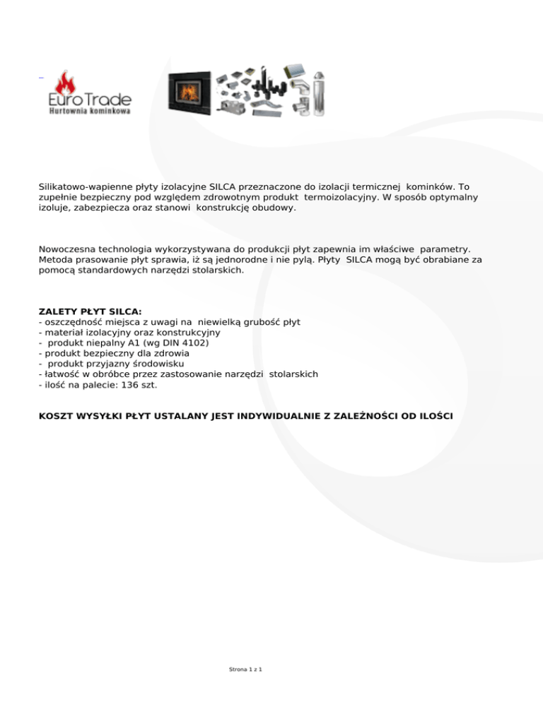 Silikatowo-wapienne płyty izolacyjne SILCA przeznaczone do izolacji termicznej kominków. To zupełnie bezpieczny pod względem zdrowotnym produkt termoizolacyjny. W sposób optymalny izoluje, zabezpiecza oraz stanowi konstrukcję obudowy. Nowoczesna technologia wykorzystywana do produkcji płyt zapewnia im właściwe parametry. Metoda prasowanie płyt sprawia, iż są jednorodne i nie pylą. Płyty SILCA mogą być obrabiane za pomocą standardowych narzędzi stolarskich. ZALETY PŁYT SILCA: - oszczędność miejsca z uwagi na niewielką grubość płyt - materiał izolacyjny oraz konstrukcyjny - produkt niepalny A1 (wg DIN 4102) - produkt bezpieczny dla zdrowia - produkt przyjazny środowisku - łatwość w obróbce przez zastosowanie narzędzi stolarskich - ilość na palecie: 136 szt. KOSZT WYSYŁKI PŁYT USTALANY JEST INDYWIDUALNIE Z ZALEŻNOŚCI OD ILOŚCI Strona 1 z 1