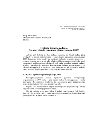 XIII Konferencja Diagnostyki Edukacyjnej Uczenie się i egzamin w oczach uczniów. Łomża, 5 - 7.10.2007 Jerzy Paczkowski Ośrodek Doskonalenia Nauczycieli Słupsk Historia jednego zadania (na marginesie egzaminu gimnazjalnego 2006) Artykuł jest historią nie tyle jednego zadania, ale trzech zadań, jakie wystąpiły w części matematyczno - przyrodniczej egzaminu gimnazjalnego 2006. Podejmuje próbę analizy na podstawie badań (w wymiarze czasowym – rzeczywistym po upływie pół roku od niego i hipotetycznym na pół roku przed następnym) możliwości sprawdzających tych zadań z punktu widzenia badanej wiedzy i umiejętności uczniów. Prezentowane badania przeprowadzono na niewielkiej populacji, w związku z tym uzyskane na ich podstawie wnioski mogą stanowić jedynie przesłanki i hipotezy do dalszych badań. 1. Wyniki egzaminu gimnazjalnego 2006 Wielopłaszczyznowa analiza wyników egzaminu zewnętrznego w gimnazjum w 2006 roku – pod kątem badanych umiejętności – może prowadzić do wniosków istotnych dla nauczyciela przy podejmowaniu strategii działań merytoryczno-dydaktycznych. Wyniki – w odniesieniu do części matematyczno-przyrodniczej – nie są zbyt wysokie, co ilustruje poniższa tabela.1 Na 34 zadania tego testu tylko 8 zadań było łatwych (lub bardzo łatwych) dla uczniów. Aż 15 zadań sprawiło im trudność (wskaźnik łatwości poniżej 0,50) – w tym 8 zadań otwartych. Tab. 1. Wyniki egzaminu gimnazjalnego 2006 (część matematyczno-przyrodnicza – woj. pomorskie) Analiza ilościowo-jakościowa zadań Zadania zamknięte Zadania otwarte [3 – KO, 6 – RO] Liczba zadań 25 9 Liczba punktów do uzyskania 25 25 Wynik średni [pkt.] 15,1 9,0 Łatwość 0,60 0,36 Zad. umiarkowanie trudne [0,50-0,69] 10 zadań 1 zadanie KO Zadania trudne [0,20-0,49] 6 zadań 2 zadania KO, 6 zadań RO Zad. bardzo trudne [0,00-0,19] 1 zadanie -- Test matematyczno-przyrodniczy był testem trudnym dla uczniów (p - 0,48). Wystąpiło w nim 10 zadań matematycznych i 5 zadań fizycznych, natomiast aż 19 zadań wymagało od ucznia posłużenia się rozumowaniem matematycznym. Zdecydowanie słabsze wyniki uzyskano przy rozwiązywaniu zadań fizycznych (p – 0,28). Gdyby wyłączyć zadania fizyczne z testu, wtedy wskaźnik łatwości nieco wzrósłby (p – 0,54) – tak „okrojony” test byłby umiarkowanie trudnym.2 Tab. 2. Wyniki egzaminu gimnazjalnego 2006 (woj. pomorskie) – posługiwanie się wiedzą matematyczną Test Mat. Fizyka M+F Wiedza matem. Liczba zadań w tym: zadania zamknięte zadania otwarte 34 10 5 15 19 25 9 7 3 2 3 9 6 13 6 Maksymalna liczba punktów w tym: zadania zamknięte zadania otwarte 50 19 11 30 34 25 25 7 12 2 9 9 21 13 21 wskaźnik p – cały test 0,48 0,47 0,28 0,40 0,45 wskaźnik p – zad.zamknięte 0,60 0,60 0,38 0,55 0,65 wskaźnik p – zad.otwarte 0,36 0,39 0,26 0,33 0,33 wskaźnik p – test bez zad.F 0,54 x x x x Spośród zadań otwartych typu RO występujących w części matematyczno-przyrodniczej 3 z nich badały wiedzę i umiejętności matematyczne, 3 kolejne – fizyczne. Wszystkie sprawiły uczniom trudność (Tabela 3.). Tab. 3. Egzamin gimnazjalny 2006 (część matematyczno-przyrodnicza – woj. pomorskie) – zadania otwarte Test, w tym: zadania zamknięte zadania otwarte Zadanie 28 (4 pkt.) Zadanie 30 (4 pkt.) Zadanie 31 (4 pkt.) Zadanie 29 (3 pkt.) Zadanie 32 (3 pkt.) Zadanie 33 (3 pkt.) Test 0,48 Matemat. 0,47 Fizyka 0,28 0,60 0,36 0,60 0,39 0,39 0,32 0,45 0,38 0,26 0,22 0,29 0,27 Tabela 4. pokazuje, jakie umiejętności badały matematyczne i fizyczne zadania otwarte.3) Wszystkie sprawdzały, jak posiadaną wiedzę można wykorzystać do rozwiązania zadania. Tab. 4. Egzamin gimnazjalny 2006 (część matematyczno-przyrodnicza) Nr zadania Zadanie 28 (M) (za 4 pkt.) p = 0,39 Zadanie 30 (M) (za 4 pkt.) p = 0,32 Badana umiejętność zapisanie wzoru do obliczenia średnicy (?!) przekroju poprawne podstawienie danych do wzoru na objętość beczki poprawna kolejność działań poprawność obliczeń rachunkowych (i jednostek) wykorzystanie twierdzenia Pitagorasa oraz obliczenia długości odcinka ustalenie metody i sformułowanie wzoru (wykorzystanie proporcji, twierdzenie Talesa lub podobieństwa trójkątów) oraz obliczenie długości odcinka obliczenie długości odcinka jako różnicy 2 wielkości poprawność obliczeń rachunkowych Wskaźnik p p = 0,29 p = 0,70 p = 0,48 p = 0,08 p = 0,52 p = 0,22 p = 0,42 p = 0,13 Nr zadania Zadanie 31 (M) (za 4 pkt.) p = 0,45 Zadanie 29 (F) (za 3 pkt.) p = 0,22 Zadanie 32 (F) (za 3 pkt.) p = 0,29 Zadanie 33 (F) (za 3 pkt.) p = 0,27 Badana umiejętność zapisanie wyrażenia do wyznaczenia procentu danej liczby obliczenie podatku VAT oraz ceny brutto okna zapisanie wyrażenia do wyznaczenia liczby na podstawie danego jej procentu obliczenie ceny netto drzwi oraz podatku VAT przekształcenie wzoru do żądanej postaci – wyznaczenie jednej ze zmiennych w wyniku wykonania 3 operacji matematycznych obliczenie ilości ciepła oddawanego przez stygnącą wodę (na jednostkę masy lub na jednostkę temperatury) obliczenie ilości ciepła oddawanego przez wodę przepływającą przez kaloryfer poprawność obliczeń rachunkowych (z uwzględnieniem jednostek) wybór poprawnego wzoru (z 3 wzorów podanych) i obliczenie mocy 1 baterii słonecznej zastosowanie odpowiedniej metody (jako iloraz oczekiwanej mocy i mocy baterii) i obliczenie minimalnej liczby baterii słonecznych do uzyskania żądanej mocy poprawność obliczeń rachunkowych (z uwzględnieniem jednostek) i poprawna interpretacja wyniku (z uwzględnieniem poprawnego przybliżenia otrzymanego wyniku) Wskaźnik p p = 0,71 p = 0,59 p = 0,28 p = 0,22 p = 0,24 p = 0,26 p = 0,16 p = 0,43 p = 0,26 p = 0,19 p = 0,35 p = 0,30 p = 0,16 Prawie we wszystkich zadaniach (za wyjątkiem zadania 29.) punktowano sprawność rachunkową ucznia (ok. 25-33% punktów w zadaniu), która jednak była dość niska. Także punktowano zapisani