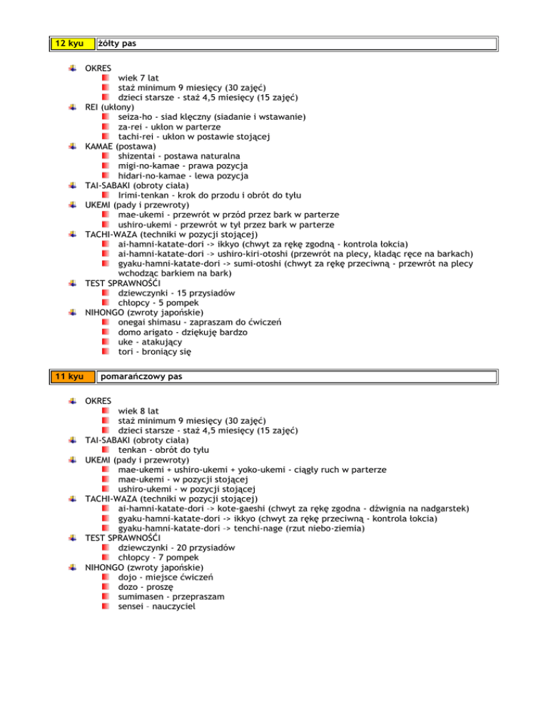 12 kyu żółty pas OKRES wiek 7 lat staż minimum 9 miesięcy (30 zajęć) dzieci starsze - staż 4,5 miesięcy (15 zajęć) REI (ukłony) seiza-ho - siad klęczny (siadanie i wstawanie) za-rei - ukłon w parterze tachi-rei - ukłon w postawie stojącej KAMAE (postawa) shizentai - postawa naturalna migi-no-kamae - prawa pozycja hidari-no-kamae - lewa pozycja TAI-SABAKI (obroty ciała) Irimi-tenkan - krok do przodu i obrót do tyłu UKEMI (pady i przewroty) mae-ukemi - przewrót w przód przez bark w parterze ushiro-ukemi - przewrót w tył przez bark w parterze TACHI-WAZA (techniki w pozycji stojącej) ai-hamni-katate-dori -> ikkyo (chwyt za rękę zgodną - kontrola łokcia) ai-hamni-katate-dori –> ushiro-kiri-otoshi (przewrót na plecy, kładąc ręce na barkach) gyaku-hamni-katate-dori -> sumi-otoshi (chwyt za rękę przeciwną - przewrót na plecy wchodząc barkiem na bark) TEST SPRAWNOŚĆI dziewczynki - 15 przysiadów chłopcy - 5 pompek NIHONGO (zwroty japońskie) onegai shimasu - zapraszam do ćwiczeń domo arigato - dziękuję bardzo uke - atakujący tori - broniący się 11 kyu pomarańczowy pas OKRES wiek 8 lat staż minimum 9 miesięcy (30 zajęć) dzieci starsze - staż 4,5 miesięcy (15 zajęć) TAI-SABAKI (obroty ciała) tenkan - obrót do tyłu UKEMI (pady i przewroty) mae-ukemi + ushiro-ukemi + yoko-ukemi - ciągły ruch w parterze mae-ukemi - w pozycji stojącej ushiro-ukemi - w pozycji stojącej TACHI-WAZA (techniki w pozycji stojącej) ai-hamni-katate-dori –> kote-gaeshi (chwyt za rękę zgodna - dźwignia na nadgarstek) gyaku-hamni-katate-dori -> ikkyo (chwyt za rękę przeciwną - kontrola łokcia) gyaku-hamni-katate-dori –> tenchi-nage (rzut niebo-ziemia) TEST SPRAWNOŚĆI dziewczynki - 20 przysiadów chłopcy - 7 pompek NIHONGO (zwroty japońskie) dojo - miejsce ćwiczeń dozo - proszę sumimasen - przepraszam sensei – nauczyciel 10 kyu czerwony pas OKRES wiek 9 lat staż minimum 9 miesięcy (30 zajęć) dzieci starsze - staż 4,5 miesięcy (15 zajęć) TAI-SABAKI (obroty ciała) irimi - krok od przodu i obrót UKEMI (pady i przewroty) mae-ukemi z amortyzacja z pozycji stojącej yoko-ukemi z pozycji stojącej TACHI-WAZA (techniki w pozycji stojącej) ai-hamni-katate-dori -> shiho nage ai-hamni-katate-dori -> irimi nage shomen-uchi -> ikkyo 9 kyu zielony pas OKRES wiek 10 lat staż minimum 9 miesięcy (30 zajęć) dzieci starsze - staż 4,5 miesięcy (15 zajęć) TACHI WAZA (techniki w pozycji stojącej) katate-dori –> shiho-nage katate-dori –> ude-kime-nage shomen-uchi –> irimi-nage chudan-tsuki –> kote-gaeshi 8 kyu niebieski pas OKRES wiek 11 lat staż minimum 9 miesięcy (30 zajęć) dzieci starsze - staż 4,5 miesięcy (15 zajęć) TACHI WAZA (techniki w pozycji stojącej) shomen-uchi -> kote gaeshi chudan-tsuki -> irimi nage yokomen-uchi -> shiho nage JIU WAZA (obrona przed 2 atakującymi) pierwszy uke - shomen uchi -> irimi nage drugi uke - tsuki chudan -> kote gaeshi 7 kyu brązowy pas Przygotować samodzielnie pokaz (około 10 minut) OKRES wiek 12 lat staż minimum 9 miesięcy (30 zajęć) dzieci starsze - staż 4,5 miesięcy (15 zajęć) SUWARI-WAZA (techniki w pozycji siedzącej) ryote-dori – trzymanie za dwie ręce -> kokyu-ho obrona przed dowolnym chwytem (zgodny, przeciwny, podwójny) –> ikkyo HANMI-HANTACHI-WAZA (tori - siedzi, uke - stoi) obrona przed chwytem oburącz za barki od tyłu -> kokyu-nage TACHI-WAZA (techniki w pozycji stojącej) dwa rodzaje ataków po dowolnym chwycie po dowolnym uderzeniu na każdy atak 2 techniki osae-waza + 2 nage-waza JIU-WAZA (obrona przed 2 atakującymi)