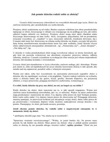 Jak pomóc dziecku radzić sobie ze złością? Uczucie złości towarzyszy człowiekowi we wszystkich okresach jego życia. Złości się zarówno niemowlę, jak i przedszkolak czy osoba dorosła. Przejawy złości uzależnione są od wieku. Bardzo częstym widokiem jest obraz przedszkolaka tupiącego ze złości, krzyczącego w sklepie czy rzucającego się na podłogę po tym, jak rodzic odmówi kupna zabawki czy słodyczy. Przejawy złości mogą mieć także charakter ataku fizycznego skierowanego na inne osoby bicie, szczypanie, popychanie), lub na przedmioty (rzucanie wszystkim, co ,,wpadnie" w ręce, niszczenie zabawek, trzaskanie drzwiami, itp.). Czasami atak może być skierowany na własną osobę (dziecko się drapie, szczypie lub gryzie). Inną formą manifestowania niezadowolenia może być atak werbalny, kiedy dziecko używa silnie zabarwionych emocjonalnie sformułowań , np: ,,Nienawidzę cię!", ,,Jesteś okropna!" , ,,Nie lubię cię!", itp. U dziecka w wieku przedszkolnym złość mogą wywoływać zakazy ze strony dorosłych, np: gdy ktoś nie pozwala wykonywać mu określonej czynności, przerywa zabawę, odbiera zabawkę, słodycze. Czasami czynnikiem wywołującym silne emocje jest własna nieporadność dziecka, lub nieudane kontakty z rówieśnikami. Uczucie złości jest nieuniknione w życiu człowieka, zarówno małego, jak i dorosłego. Ważne jest zatem to, żeby od najmłodszych lat uczyć dziecko kierowania złością w taki sposób, aby umiało nad nią zapanować, poradzić sobie z własnymi emocjami. Ważne jest także, żeby być wyczulonym na zauważanie pierwszych sygnałów złości u dziecka, aby im zapobiegać, wyciszać, a nie pogłębiać. Typowe reakcje rodziców na wybuchy złości u dziecka (takie jak np: gniew, krzyk, groźby, dawanie klapsów), nie przynoszą efektów, a wręcz przeciwnie, potęgują niewłaściwe zachowania, wzmacniają je. Co robić, kiedy dziecko się przy nas złości, na coś, na kogoś czy na siebie ? Kiedy dziecko się złości, duże znaczenie ma to, w jaki sposób reagujemy. Ważna jest zarówno nasza komunikacja niewerbalna, jak i to, co mówimy. Wpływ na nasze zachowanie mają przekonania i nastawienie do złości. Czy dajemy sobie prawo do niej? Kolejne pytanie, które warto sobie zadać: Czy dajemy innym prawo do złoszczenia się? Pomagając dzieciom, musimy pamiętać, że pierwszym krokiem jest akceptacja swojej złości, danie sobie prawa do jej przeżywania i wyrażania; dopiero wtedy możemy zaakceptować emocje dziecka i mu pomóc. Pamiętajmy, że złość, jak każde uczucie, przemija. Jeżeli chcemy pomóc dziecku, by radziło sobie z negatywnymi emocjami, to w momencie, kiedy się złości: * spróbujmy określić jego stan: "Oj, chyba cię to rozzłościło", "Sprawiasz wrażenie rozwścieczonego", "Widzę, że jesteś bardzo zły; Na pewno masz powód, by tak bardzo się złościć; Masz prawo się złościć, chcę ci jednak pomóc poradzić sobie ze złością, by nie poraniła nikogo, również ciebie"; ogólny przekaz: "Złość nie jest czymś złym. Ważne jest to, co zrobisz z tym uczuciem"; w ten sposób wyrażamy akceptację dla uczuć dziecka; * złość, jak wszystkie uczucia, można zaakceptować, natomiast pewne działania należy ograniczyć: "Widzę, jak jesteś zły na brata. Powiedz mu, co chcesz, słowami, a nie pięściami"; * uważnie słuchajmy i powtarzajmy spokojnym, nie oceniającym tonem to, co dziecko mówi: "Mówisz więc, że... (tu powtarzamy jego słowa), "Usłyszałem, że powiedziałeś..."; * okazujmy empatię i zrozumienie - wyobraźmy sobie, że jesteśmy na miejscu dziecka, i spróbujmy zobaczyć daną sprawę z jego punktu widzenia: "Kiedy wyobrażam sobie, że jestem w twojej skórze, to rozumiem, że możesz czuć się w ten sposób", "Z twojego punktu widzenia wygląda to tak.", "Myślę, że wiem, co masz na myśli."; * starajmy się unikać prawienia morałów, poprawiania, udzielania wskazówek w trakcie napadu złości; dopiero gdy dziecko zaczyna się uspokajać i odprężać, możemy podzielić się z nim swoimi doświadczeniami; * wprowadzajmy konsekwencje dopiero wtedy, gdy zarówno my, jak i dziecko jesteśmy spokojni - w ten sposób dziecko dostaje komunikat, że to jego zachowanie jest dyscyplinowane, a nie jego emocje; * warto dzieciom czytać bajki terapeutyczne, które uczą je radzenia sobie w różnych trudnych sytuacjach. Jak reagować, by nie wybuchnąć wraz z dzieckiem? Jeżeli jesteśmy uważni, to wiele ataków złości możemy zatrzymać w momencie pojawienia się pierwszych symptomów. Jednak zdarzają się takie sytuacje, w których dochodzi do wybuchu. Wybuch jest mniej groźny, kiedy: 1.Ograniczamy liczbę bodźców : • • • • • obniżamy i ściszamy głos, mówimy wolno, unikamy kontaktu wzrokowego, unikamy dotyku, chyba że dziecko samo go szuka, pozostawiamy dziecko samemu sobie (bez widowni). 2.Ograniczamy zasięg: • • nie wypominamy, w razie agresji fizycznej - przytrzymujemy dziecko. 3.Stosujemy tzw. "zawory bezpieczeństwa": • • dziecko ma możliwość rozładowania się w ruchu, ma możliwość opowiedzenia. W zależności od tego, czy zachowanie dziecka w trakcie wybuchu jest bezpieczne dla niego i otoczenia, czy nie, możemy wobec dziecka zachować się w dwojaki sposób. W przypadku kiedy niewłaściwe zachowanie dziecka jest jednocześnie bezpieczne dla niego i otoczenia, dobrą reakcją jest nie zwracanie uwagi na dziecko i czekanie, aż się samo uspokoi. Jest to trudne dla dziecka, ale wymaga także cierpliwości i opanowania dorosłych - dziecko w tym momencie jest w takich emocjach, że czyjaś uwaga potęguje napięcie i zdenerwowanie. Jedyny komunikat, który możemy przekazać, to informacja, że kiedy się uspokoi, możemy spróbować pomóc mu rozwiązać problem, lub pokazanie pozytywów: "Jak się uspokoisz, to będziesz miał więcej czasu na zabawę". Gdy jednak dochodzi do zachowań, w k