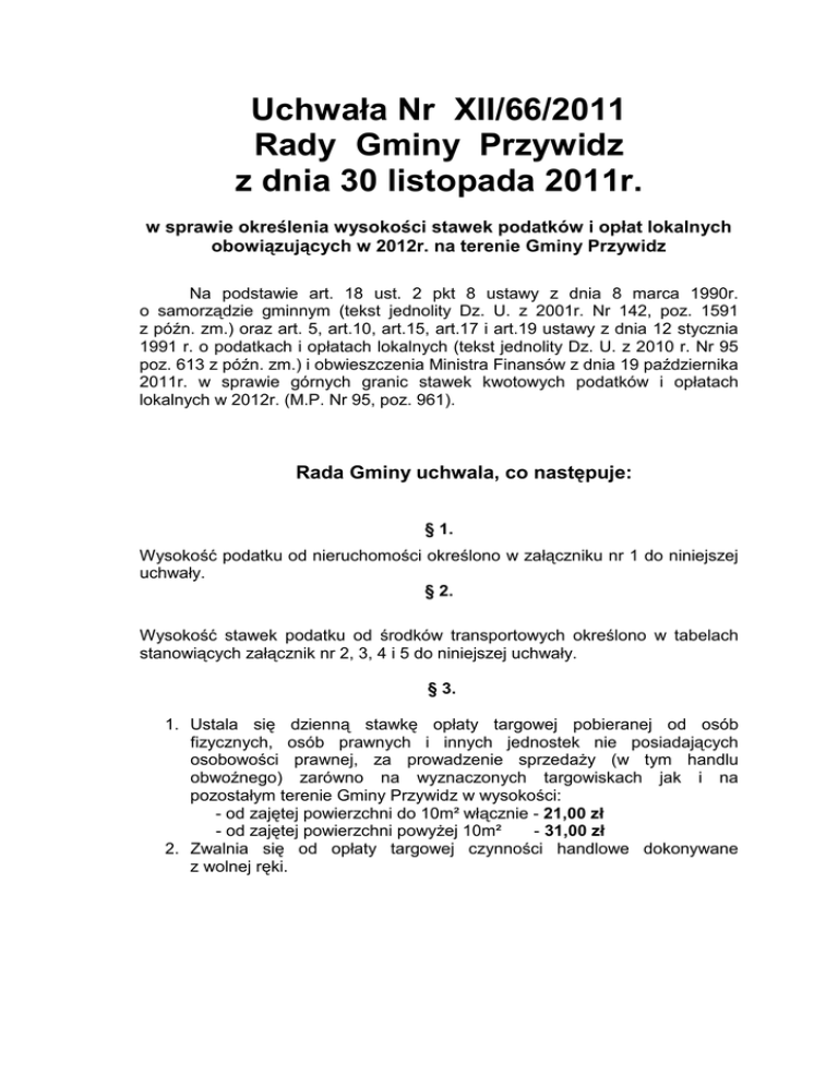 Uchwała Nr XII/66/2011 Rady Gminy Przywidz z dnia 30 listopada 2011r. w sprawie określenia wysokości stawek podatków i opłat lokalnych obowiązujących w 2012r. na terenie Gminy Przywidz Na podstawie art. 18 ust. 2 pkt 8 ustawy z dnia 8 marca 1990r. o samorządzie gminnym (tekst jednolity Dz. U. z 2001r. Nr 142, poz. 1591 z późn. zm.) oraz art. 5, art.10, art.15, art.17 i art.19 ustawy z dnia 12 stycznia 1991 r. o podatkach i opłatach lokalnych (tekst jednolity Dz. U. z 2010 r. Nr 95 poz. 613 z późn. zm.) i obwieszczenia Ministra Finansów z dnia 19 października 2011r. w sprawie górnych granic stawek kwotowych podatków i opłatach lokalnych w 2012r. (M.P. Nr 95, poz. 961). Rada Gminy uchwala, co następuje: § 1. Wysokość podatku od nieruchomości określono w załączniku nr 1 do niniejszej uchwały. § 2. Wysokość stawek podatku od środków transportowych określono w tabelach stanowiących załącznik nr 2, 3, 4 i 5 do niniejszej uchwały. § 3. 1. Ustala się dzienną stawkę opłaty targowej pobieranej od osób fizycznych, osób prawnych i innych jednostek nie posiadających osobowości prawnej, za prowadzenie sprzedaży (w tym handlu obwoźnego) zarówno na wyznaczonych targowiskach jak i na pozostałym terenie Gminy Przywidz w wysokości: - od zajętej powierzchni do 10m² włącznie - 21,00 zł - od zajętej powierzchni powyżej 10m² - 31,00 zł 2. Zwalnia się od opłaty targowej czynności handlowe dokonywane z wolnej ręki. § 4. 1. Ustala się dzienną stawkę opłaty miejscowej w wysokości - 2,00 zł. 2. Opłatę miejscową pobiera się w okresie od 01 czerwca do 30 września każdego roku od osób fizycznych przebywających dłużej niż dobę w celach turystycznych, wypoczynkowych lub szkoleniowych na terenie Gminy Przywidz. 3. Opłatę pobiera się w pierwszym dniu zgłoszenia pobytu za cały okres planowanego pobytu. W przypadku przedłużenia pobytu opłatę uiszcza się w dniu jego przedłużenia z góry za ten okres. 4. Pobór opłaty miejscowej następuje w drodze inkasa przez osoby prowadzące sprawy meldunkowe w ośrodkach wypoczynkowych, kwaterach prywatnych oraz prowadzących działalność agroturystyczną. 5. Inkasentom opłaty miejscowej przysługuje wynagrodzenie w wysokości 10% od zainkasowanych i terminowo wpłaconych opłat. 6. Inkasenci pobierający opłatę miejscową zobowiązani są do wpłacenia pobranych opłat na rachunek Gminy Przywidz do 10 każdego miesiąca po miesiącu, w którym pobierano opłatę miejscową. 7. Inkasenci ponoszą odpowiedzialność za opłatę miejscową pobraną, a nie wpłaconą we właściwym terminie. 8. Osoby nie korzystające z usług zakwaterowania, o którym mowa w pkt.4, uiszczają opłatę miejscową najpóźniej w ostatnim dniu pobytu na rachunek bankowy Gminy Przywidz. § 5. Traci moc uchwała Rady Gminy Przywidz – osoby pełniącej funkcję organów gminy Nr LX/348/10 z dnia 10 listopada 2010r. w sprawie określenia wysokości stawek podatków i opłat lokalnych obowiązujących w 2011r. na terenie Gminy Przywidz (Dz. Urz. Woj. Pomorskiego Nr 162, poz. 3294). § 6. Wykonanie niniejszej uchwały powierza się Wójtowi Gminy Przywidz. § 7. Niniejsza uchwała wchodzi w życie po upływie 14 dni od dnia ogłoszenia w Dzienniku Urzędowym Województwa Pomorskiego z mocą obowiązującą od dnia 01 stycznia 2012r. Załącznik nr 1 do Uchwały Rady Gminy Przywidz nr XII/66/2011 z dnia 30 listopada 2011r. PODATEK OD NIERUCHOMOŚCI – STAWKI NA 2012 R. Lp. Przedmiot podatku Stawka podatku na 2012r. 1. budynki mieszkalne lub ich części – od 1 m powierzchni użytkowej 0,67 zł 2. budynki lub ich części związane z prowadzeniem działalności gospodarczej oraz budynki mieszkalne lub ich części zajęte na prowadzenie działalności gospodarczej – 2 od 1 m powierzchni użytkowej: 17,75 zł 3. budynki lub ich części związane z udzielaniem świadczeń zdrowotnych, w rozumieniu przepisów o działalności leczniczej, zajętych przez podmioty udzielające tych 2 świadczeń – od 1 m powierzchni użytkowej: 4,45 zł 4. budynki lub ich części zajęte na prowadzenie działalności gospodarczej w zakresie obrotu kwalifikowanym 2 materiałem siewnym – od 1 m powierzchni użytkowej: 6,30 zł 5. domki letniskowe – od 1 m powierzchni użytkowej: 6. garaże wolnostojące – od 1 m powierzchni użytkowej 6,20 zł 7. budynki pozostałe, w tym zajęte na prowadzenie odpłatnej statutowej działalności pożytku publicznego przez 2 organizacje pożytku publicznego lub ich części – od 1 m powierzchni użytkowej 5,56 zł 8. grunty związane z prowadzeniem działalności gospodarczej, bez względu na sposób zakwalifikowania w 2 ewidencji gruntów i budynków – od 1 m powierzchni: 0,82 zł 9. grunty pozostałe, w tym zajęte na prowadzenie odpłatnej statutowej działalności pożytku publicznego przez 2 organizacje pożytku publicznego – od 1 m powierzchni: 0,30 zł 10. grunty pod jeziorami, zajęte na zbiorniki wodne retencyjne lub elektrowni wodnych – od 1 ha powierzchni: 4,33 zł 11. grunty letniskowe - od 1 m powierzchni 0,43 zł 12. budowle 2,00 % 2 2 2 2 7,36 zł Załącznik nr 2 do Uchwały Rady Gminy Przywidz nr XII/66/2011 z dnia 30 listopada 2011r. STAWKI PODATKU DLA POJAZDÓW O DOPUSZCZALNEJ MASIE CAŁKOWITEJ POWYŻEJ 3,5 TON Lp. Rodzaj środka transportowego Kwota podatku powyżej 3,5 tony do 5,5 tony włącznie – 673 zł 1. samochody ciężarowe o dopuszczalnej masie całkowitej wyższej niż 3,5 tony i poniżej 12 ton powyżej 5,5 tony do 9 ton włącznie – 973 zł powyżej 9 ton – 1134 zł 2. samochody ciężarowe o dopuszczalnej masie całkowitej równej lub wyższej niż 12 ton w zależności od liczby osi, dopuszczalnej masy całkowitej pojazdu i rodzaju zawieszenia stawki podatku określa załącznik nr 3 do niniejszej uchwały 3. ciągniki siodłowe i balastowe przystosowane do używania łącznie z naczepą lub przyczepą o dopuszczalnej masie całkowitej zespoł