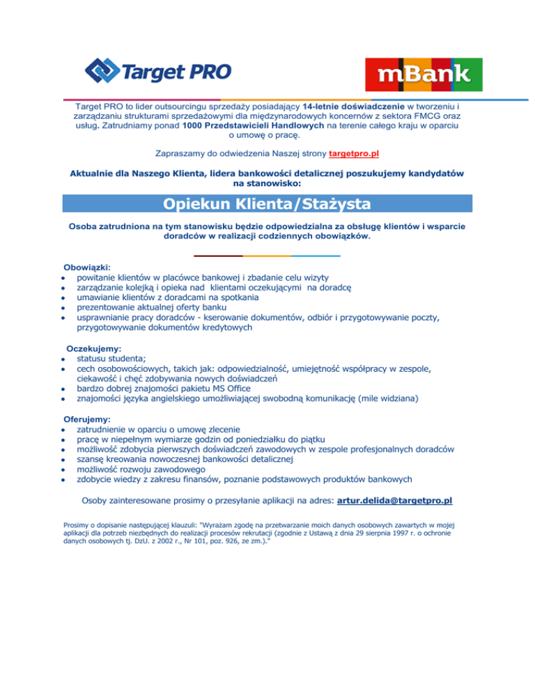 Target PRO to lider outsourcingu sprzedaży posiadający 14-letnie doświadczenie w tworzeniu i zarządzaniu strukturami sprzedażowymi dla międzynarodowych koncernów z sektora FMCG oraz usług. Zatrudniamy ponad 1000 Przedstawicieli Handlowych na terenie całego kraju w oparciu o umowę o pracę. Zapraszamy do odwiedzenia Naszej strony targetpro.pl Aktualnie dla Naszego Klienta, lidera bankowości detalicznej poszukujemy kandydatów na stanowisko: Opiekun Klienta/Stażysta Osoba zatrudniona na tym stanowisku będzie odpowiedzialna za obsługę klientów i wsparcie doradców w realizacji codziennych obowiązków. Obowiązki: powitanie klientów w placówce bankowej i zbadanie celu wizyty zarządzanie kolejką i opieka nad klientami oczekującymi na doradcę umawianie klientów z doradcami na spotkania prezentowanie aktualnej oferty banku usprawnianie pracy doradców - kserowanie dokumentów, odbiór i przygotowywanie poczty, przygotowywanie dokumentów kredytowych Oczekujemy: statusu studenta; cech osobowościowych, takich jak: odpowiedzialność, umiejętność współpracy w zespole, ciekawość i chęć zdobywania nowych doświadczeń bardzo dobrej znajomości pakietu MS Office znajomości języka angielskiego umożliwiającej swobodną komunikację (mile widziana) Oferujemy: zatrudnienie w oparciu o umowę zlecenie pracę w niepełnym wymiarze godzin od poniedziałku do piątku możliwość zdobycia pierwszych doświadczeń zawodowych w zespole profesjonalnych doradców szansę kreowania nowoczesnej bankowości detalicznej możliwość rozwoju zawodowego zdobycie wiedzy z zakresu finansów, poznanie podstawowych produktów bankowych Osoby zainteresowane prosimy o przesyłanie aplikacji na adres: [email protected] Prosimy o dopisanie następującej klauzuli: "Wyrażam zgodę na przetwarzanie moich danych osobowych zawartych w mojej aplikacji dla potrzeb niezbędnych do realizacji procesów rekrutacji (zgodnie z Ustawą z dnia 29 sierpnia 1997 r. o ochronie danych osobowych tj. DzU. z 2002 r., Nr 101, poz. 926, ze zm.)."