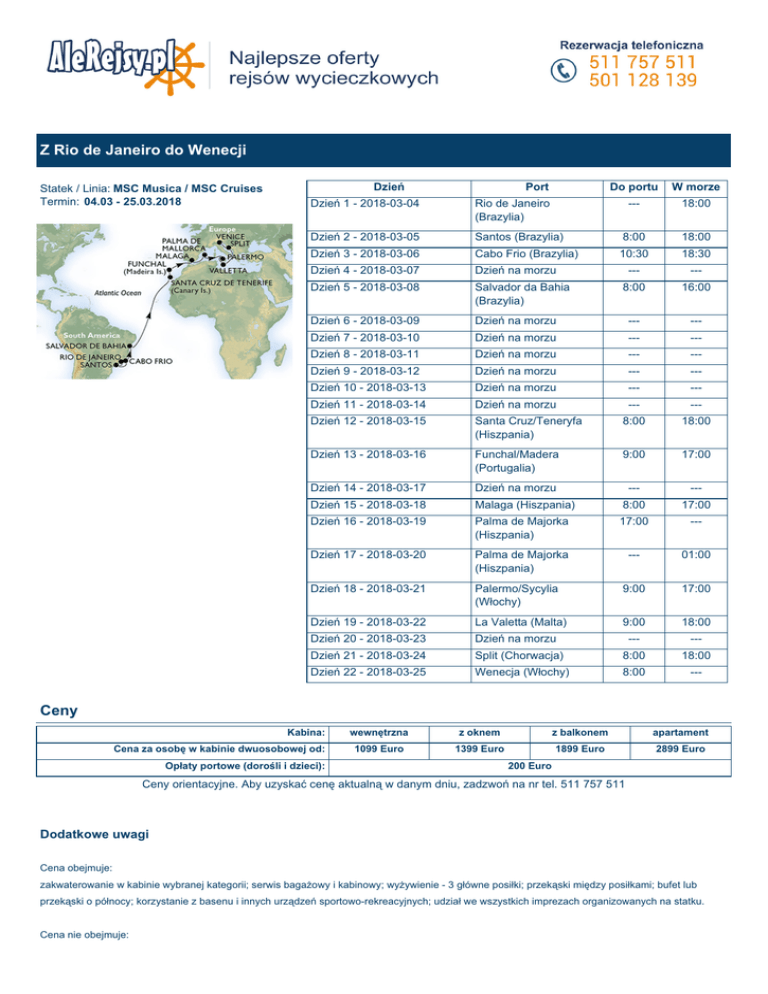 Z Rio de Janeiro do Wenecji Statek / Linia: MSC Musica / MSC Cruises Termin: 04.03 - 25.03.2018 Dzień Port Do portu W morze --- 18:00 Santos (Brazylia) 8:00 18:00 Dzień 3 - 2018-03-06 Cabo Frio (Brazylia) 10:30 18:30 Dzień 4 - 2018-03-07 Dzień na morzu Dzień 5 - 2018-03-08 Salvador da Bahia (Brazylia) Dzień 6 - 2018-03-09 Dzień 1 - 2018-03-04 Rio de Janeiro (Brazylia) Dzień 2 - 2018-03-05 --- --- 8:00 16:00 Dzień na morzu --- --- Dzień 7 - 2018-03-10 Dzień na morzu --- --- Dzień 8 - 2018-03-11 Dzień na morzu --- --- Dzień 9 - 2018-03-12 Dzień na morzu --- --- Dzień 10 - 2018-03-13 Dzień na morzu --- --- Dzień 11 - 2018-03-14 Dzień na morzu --- --- Dzień 12 - 2018-03-15 Santa Cruz/Teneryfa (Hiszpania) 8:00 18:00 Dzień 13 - 2018-03-16 Funchal/Madera (Portugalia) 9:00 17:00 Dzień 14 - 2018-03-17 Dzień na morzu --- --- Dzień 15 - 2018-03-18 Malaga (Hiszpania) 8:00 17:00 Dzień 16 - 2018-03-19 Palma de Majorka (Hiszpania) 17:00 --- Dzień 17 - 2018-03-20 Palma de Majorka (Hiszpania) --- 01:00 Dzień 18 - 2018-03-21 Palermo/Sycylia (Włochy) 9:00 17:00 Dzień 19 - 2018-03-22 La Valetta (Malta) 9:00 18:00 Dzień 20 - 2018-03-23 Dzień na morzu --- --- Dzień 21 - 2018-03-24 Split (Chorwacja) 8:00 18:00 Dzień 22 - 2018-03-25 Wenecja (Włochy) 8:00 --- Ceny Kabina: Cena za osobę w kabinie dwuosobowej od: Opłaty portowe (dorośli i dzieci): wewnętrzna z oknem 1099 Euro 1399 Euro z balkonem apartament 1899 Euro 2899 Euro 200 Euro Ceny orientacyjne. Aby uzyskać cenę aktualną w danym dniu, zadzwoń na nr tel. 511 757 511 Dodatkowe uwagi Cena obejmuje: zakwaterowanie w kabinie wybranej kategorii; serwis bagażowy i kabinowy; wyżywienie - 3 główne posiłki; przekąski między posiłkami; bufet lub przekąski o północy; korzystanie z basenu i innych urządzeń sportowo-rekreacyjnych; udział we wszystkich imprezach organizowanych na statku. Cena nie obejmuje: opłat portowych; kosztów dojazdu do portu; ewentualnych noclegów w hotelu przed/po rejsie i transferów (na zapytanie); wycieczek fakultatywnych; korzystania z punktów usługowych (pralnia, fotograf, salon piękności i odnowy biologicznej, internet); napojów do obiadów i kolacji, drinków; napiwków obowiązkowych dla obsługi statku (ok. 10euro/dzień/osobę powyżej 12 roku życia; 5euro/dzień/dziecko od 2 do 12 roku życia); ubezpieczenia KL, NW i bagażu. ALL INCLUSIVE (opcja): Istnieje możliwość wykupienia pakietu ALL INCLUSIVE obejmującego wybrane napoje alkoholowe i bezalkoholowe dostępne bez ograniczeń we wszystkich barach. Cena pakietu: 26euro/dzień/osoba dorosła; 12euro/dzień/dziecko. Warunkiem skorzystania z pakietu all inclusive jest wykupienie pakietu przez wszystkich pasażerów podróżujących w jednej kabinie na czas całego rejsu. Uwagi: Kabiny 3/4 osobowe nie są dostępne we wszystkich kategoriach, a ich liczba jest ograniczona - sprzedaż tylko po potwierdzeniu; ceny wycieczek fakultatywnych, propozycje dojazdu do portu, hoteli przed/po rejsie na zapytanie.Na pokładzie statku obowiązuje bezgotówkowy system opłat. Należność reguluje się ostatniego dnia rejsu gotówką (wpłata depozytu ok. 250euro/kabina pierwszego dnia rejsu) lub kartą kredytową (VISA, Mastercard, American Express) na podstawie zbiorczego rachunku. Karty kredytowe należy zarejestrować zaraz po zaokrętowaniu. MSC Musica MSC Musica Tonaż: 89.600 ton Rok budowy:2006 Długość: 293,8 m Szerokość: 32,2 m Szybkość: 23 węzły Pokłady pasażerskie: 13 Załoga: 987 Pasażerowie: 3.000 Basen: 2 (4 jacuzzi i basen dla dzieci) Waluta: EURO Do dyspozycji: 4 restauracje, bary, sushi bar, wine bar, kasyno, pokój cygar, pokój gier, dyskoteka, sala widowiskowa, kino, salon odnowy biologicznej, sauna, fitness center, boisko (kort tenisowy), symulator do gry w golfa, trasa do joggingu, pokój zabaw dla dzieci, punkt medyczny, biblioteka, kawiarenka internetowa, sala gier video, salon piękności, butiki, sklep wolnocłowy, centrum konferencyjne. Kabiny: 1275 kabin wyposażonych w łazienkę (prysznic, wc, suszarka), klimatyzację (indywidualnie sterowaną), radio pokładowe, telefon do użytku wewnętrznego, sejf, mini bar, TV. 809 kabin posiada balkony. Większość kabin ma 2 pojedyncze łóżka, które na zmówienie można połączyć w 1 podwójne. 18 Kabin typu suite (25m2) łóżko małżeńskie, które na zamówienie można rozłączyć na 2 pojedyncze. Od chwili gdy wejdziesz na pokład MSC Musica poczujesz muzykę w powietrzu. Jej nowoczesny wystrój prezentuje perfekcyjne wyważenie design w najlepszym smaku, eleganckie otoczenie oraz przepiękne detale. Goście z całego świata będą cieszyć się kosmopolityczną atmosferą i ośrodkami rozrywki które obejmują pokładowy kort do tenisa, mini-golfa oraz dobrze wyposażone centrum SPA i siłownie. Dobra włoska kuchnia, międzynarodowe przysmaki, posiłki na werandzie czy bar Sushi zaspokoją twój apetyt.