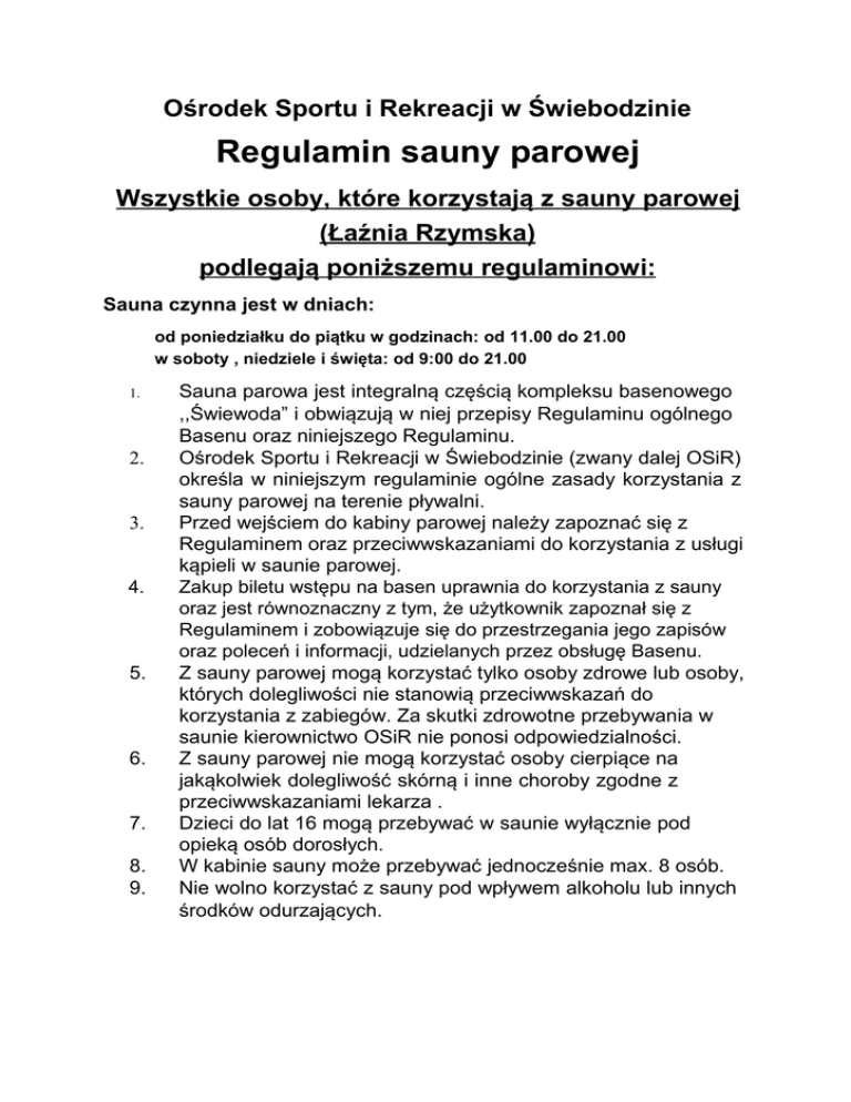 Ośrodek Sportu i Rekreacji w Świebodzinie Regulamin sauny parowej Wszystkie osoby, które korzystają z sauny parowej (Łaźnia Rzymska) podlegają poniższemu regulaminowi: Sauna czynna jest w dniach: od poniedziałku do piątku w godzinach: od 11.00 do 21.00 w soboty , niedziele i święta: od 9:00 do 21.00 1. 2. 3. 4. 5. 6. 7. 8. 9. Sauna parowa jest integralną częścią kompleksu basenowego ,,Świewoda” i obwiązują w niej przepisy Regulaminu ogólnego Basenu oraz niniejszego Regulaminu. Ośrodek Sportu i Rekreacji w Świebodzinie (zwany dalej OSiR) określa w niniejszym regulaminie ogólne zasady korzystania z sauny parowej na terenie pływalni. Przed wejściem do kabiny parowej należy zapoznać się z Regulaminem oraz przeciwwskazaniami do korzystania z usługi kąpieli w saunie parowej. Zakup biletu wstępu na basen uprawnia do korzystania z sauny oraz jest równoznaczny z tym, że użytkownik zapoznał się z Regulaminem i zobowiązuje się do przestrzegania jego zapisów oraz poleceń i informacji, udzielanych przez obsługę Basenu. Z sauny parowej mogą korzystać tylko osoby zdrowe lub osoby, których dolegliwości nie stanowią przeciwwskazań do korzystania z zabiegów. Za skutki zdrowotne przebywania w saunie kierownictwo OSiR nie ponosi odpowiedzialności. Z sauny parowej nie mogą korzystać osoby cierpiące na jakąkolwiek dolegliwość skórną i inne choroby zgodne z przeciwwskazaniami lekarza . Dzieci do lat 16 mogą przebywać w saunie wyłącznie pod opieką osób dorosłych. W kabinie sauny może przebywać jednocześnie max. 8 osób. Nie wolno korzystać z sauny pod wpływem alkoholu lub innych środków odurzających. 10. 11. 12. 13. 14. Każda osoba korzystająca z sauny parowej powinna zasięgnąć opinii lekarza odnośnie przeciwwskazań do korzystania z tej formy rekreacji. Wszelkie skaleczenia, urazy, pogorszenie samopoczucia należy niezwłocznie zgłaszać dyżurującemu ratownikowi. We wszystkich sytuacjach wypadkowych, zagrażających życiu i zdrowiu użytkowników oraz nieprawidłowej pracy urządzeń należy bezwzględnie powiadomić obsługę OSiRu. Na terenie sauny obowiązuje bezwzględny zakaz wnoszenia i spożywania napojów alkoholowych oraz środków odurzających, żucia gumy i spożywania pokarmów; wnoszenia opakowań szklanych, puszek oraz innych przedmiotów; hałasowania, przeszkadzania użytkownikom przebywającym na terenie sauny. W saunie parowej zabrania się: 1) 2) 3) 4) 5) 6) 15. 16. 17. wnoszenia i korzystania z telefonów komórkowych oraz wszelkich urządzeń służących do rejestrowania obrazu lub dźwięku; dotykania i manipulowania przy urządzeniach elektrycznych i grzewczych; wchodzenia na elementy konstrukcyjne sauny niszczenia i uszkadzania wyposażenia; nieobyczajnego zachowania, bądź zachowania uznanego społecznie za nieprzyzwoite lub obraźliwe; korzystania z sauny w kolczykach, biżuterii, łańcuszkach, zegarkach, okularach i szkłach kontaktowych. Osoby niszczące lub uszkadzające wyposażenie lub urządzenia obiektu ponoszą odpowiedzialność materialną za wyrządzone szkody. OSiR nie odpowiada za rzeczy i przedmioty, które zostały pozostawione w saunie. Zobowiązuje się wszystkich użytkowników do przestrzegania Regulaminu, zasad bezpieczeństwa oraz kulturalnego zachowania. W PRZYPADKU POGORSZENIA SAMOPOCZUCIA PODCZAS POBYTU W SAUNIE LUB JAKICHKOLWIEK WĄTPLIWOŚCI ZDROWOTNYCH NALEŻY SKONSULTOWAĆ SIĘ Z LEKARZEM !!! INSTRUKCJA KORZYSTANIA Z SAUNY PAROWEJ Sauna parowa (tzw. łaźnia rzymska) to sauna o wilgotności dochodzącej do 100% lecz niższej temperaturze: 4050oC. Zaleca się, aby jednorazowe wejście do sauny trwało ok. 515 minut a całkowity czas przebywania w saunie nie przekraczał 30 min. dziennie ( np .2 x15 min. lub 3 x 10 min.) 1. Przed wejściem do pomieszczenia sauny należy zapoznać się z Regulaminem oraz przeciwwskazaniami do korzystania z usługi kąpieli w saunie parowej ( konsultacja lekarska ). 2. Rozpocznij od umycia ciała pod prysznicem. 3. W saunie nie należy przebywać w okularach i szkłach kontaktowych. 4. W czasie przebywania w saunie parowej nie wolno smarować ciała lub twarzy żadnymi kremami, gdyż powoduje to zmniejszenie powierzchni ciała, która wydala pot. 5. W kabinie sauny parowej może przebywać nie więcej niż 8 osób jednocześnie. 6. W kabinie sauny przebywa się na siedząco i zaleca się używanie ręcznika. Ręcznik powinien być rozłożony tak aby żadna część ciała nie stykała się z powierzchnią ławy. 7. Po wyjściu z sauny należy obowiązkowo umyć i schłodzić ciało pod natryskiem. 8. Wszelkie zmiany samopoczucia, wskazujące na nietolerancję zabiegu w saunie, należy niezwłocznie zgłosić obsłudze Obiektu.