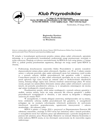 Klub Przyrodników ul. 1 Maja 22, 66-200-Świebodzin Konto: BZ WBK SA o/Świebodzin nr 28 1090 1593 0000 0001 0243 0645 tel./fax 068 3828236, e-mail: [email protected], http:// www.kp.org.pl Świebodzin, 25 lutego 2016 r. Regionalny Dyrektor Ochrony Środowiska we Wrocławiu dotyczy: zmiana planu zadań ochronnych dla obszaru Natura 2000 Przełomowa Dolina Nysy Łużyckiej sprawę prowadzi: Paweł Pawlaczyk [email protected] W związku z konsultacjami społecznymi projektu zmiany planu zadań ochronnych, uprzejmie informuję, że w prowadzonych konsultacjach podtrzymuję uwagi przekazywane wcześniej w trybie roboczym. Dziękuję za robocze ustosunkowanie się RDOS do tych uwag (pismo z 2 lutego 2016 r.), jednak poniżej przedstawiam argumenty, dlaczego nie mogę uznać opinii RDOS za słuszną. 1. Podtrzymuję dotychczasowe stanowisko Klubu Przyrodników w sprawie warunków dopuszczalności zmiany planu zadań ochronnych. Zgodnie z art. 28 ust. 5 zdanie ostatnie ustawy o ochronie przyrody, plan zadań ochronnych może być zmieniony, jeżeli wynika to z potrzeb ochrony siedlisk przyrodniczych lub gatunków roślin i zwierząt. Ustawodawca przyjął tu, że plan zadań ochronnych sporządza się na czas określony, a przed upływem tego czasu można go zmienić tylko w okolicznościach określonych ustawą. Intencją takiego zapisu była ochrona trwałości ustanowionego planu. W naszej ocenie, przepis ten uniemożliwia dokonanie zmiany planu zadań ochronnych z przyczyn innych, niż potrzeby przedmiotów ochrony, tj. w zarządzeniu zmieniającym nie można ująć zmian wynikających z innych przyczyn. Przedstawiony projekt, obok zmian wynikających z potrzeb ochrony gatunków i siedlisk, zawiera zmiany, które nie mają znaczenia dla ochrony gatunków i siedlisk przyrodniczych występujących w obszarze, a tym samym są niezgodne z delegacją ustawową do zmiany PZO. W szczególności, w świetle delegacji ustawowej, niedopuszczalne zaś są zmiany, które osłabiałyby ochronę siedlisk przyrodniczych lub gatunków, w szczególności polegające np. na usunięciu zobowiązania właściwych podmiotów do zachowania określonych sposobów gospodarowania, ograniczenia intensywności i zakresu monitoringu – jak wskazano niżej. RDOS w piśmie z 2 lutego 2016 r. przytoczył za Departamentem Prawnym MS odmienne stanowisko, uważając że PZO może być zmieniony także z innych powodów, w szczególności może być uchylony przez sąd administracyjny z powodu niezgodności z prawem lub uchylony przez Prezesa Rady Ministrów na wniosek Ministra Środowiska w trybie nadzoru; RDOS uważa, że ma obowiązek zastosowania się do stanowiska organu nadzorczego. Stanowiska tego nie uznaję za zasadne. Interpretacja Ministra Środowiska jest moim zdaniem nieprawidłowa. Zacytowane przez nas wyżej przepisy ustawy o ochronie przyrody stanowią lex specialis wobec ogólnych przepisów uprawniających organ właściwy do ustanowienia aktu prawa miejscowego również do uchylenia tego aktu, wprowadzony właśnie w celu ochrony trwałości raz ustanowionego planu przed zmianami pod wpływem rozmaitych nacisków. Oczywiście, plan może być uchylony z powodu sprzeczności z prawem przez sąd lub przez Prezesa Rady Ministrów – jednak, jak dotąd rzekoma sprzeczność z prawem obecnego PZO jest wyłącznie poglądem Departamentu Prawnego Ministerstwa Środowiska, który nie został zweryfikowany ani przez sąd, ani przez Prezesa Rady Ministrów. Poglądu tego nie podzielam. RDOŚ nie jest „zobowiązany do zastosowania się do uwag organu nadzorczego” jeśli te uwagi nie są zasadne, a zwłaszcza gdyby ich uwzględnienie powodowało, jak w przedmiotowej sprawie, naruszenie prawa poprzez zmianę PZO z powodów innych niż potrzeby ochrony gatunków i siedlisk. Zagrożenia uchyleniem PZO przez Prezesa Rady Ministrów nie można uznać za „potrzebę ochrony gatunków i siedlisk”, przede wszystkim na brak związku z potrzebami ochrony gatunków i siedlisk, a ponadto wątpliwe jest, czy Prezes Rady Ministrów uznałby argumenty prawne Ministra Środowiska i zdecydowałby się na uchylenie aktu. 2. Gatunki nie mogą „występować w stopniu niereprezentatywnym”, gdyż pojęcie reprezentatywności dotyczy siedlisk przyrodniczych. Właściwą przesłanką do nadania gatunkowi z załącznika II dyrektywy oceny D, a w konsekwencji do nieokreślania dla niego zagrożeń, jest „gatunek tylko przypadkowo i sporadycznie pojawia się w obszarze”. W odpowiedzi z 2 lutego 2016 r., RDOS wskazuje, ze użyte sformułowanie „wynika z uwag Ministra Środowiska, do których RDOS zobowiązany jest się dostosować”. Pochodzenie nieprawidłowego sformułowania od Ministra Środowiska nie sprawia, że sformułowaniem to staje się prawidłowe. Ustanowienie PZO jest wyłączna kompetencją RDOŚ, a nie Ministra Środowiska, RDOS nie jest więc „obowiązany” by na życzenie Ministra wprowadzać do tekstu PZO nieprawidłowe sformułowanie. 3. Zmiana podmiotu odpowiedzialnego za wykonanie działania ochronnego dla siedliska 91E0, szczególnie w zakresie pozostawiania martwego drewna, spowoduje pogorszenie ochrony siedliska w lasach niepaństwowych, gdyż zapis ustanawiający potrzebny środek ochronny zostanie wobec takich lasów de facto usunięty. Wskazanie Starosty jako wykonawcy tego działania w lasach niepaństwowych, jako podmiotu sporządzającego uproszczony plan urządzenia lasu, nie jest tu wystarczające, ponieważ po pierwsze: pozostawianie lub zabieranie wydzielającego się martwego drewna ma charakter cięć przygodnych, które nie są regulowane takim planem, a po drugie: nawet gdyby Starosta mógł wprowadzić odpowiedni zapis do uproszczonego planu urządzenia lasu, to mógłby to zrobić dopiero przy okazji rewizji takiego planu, która nie wiadomo kiedy nastąpi. W odpowiedzi na tę uwagę RDOS w piśmie z 2 lutego 2016 r. powtórzył uzasadnienie swojej propozycji, wskazując także, że