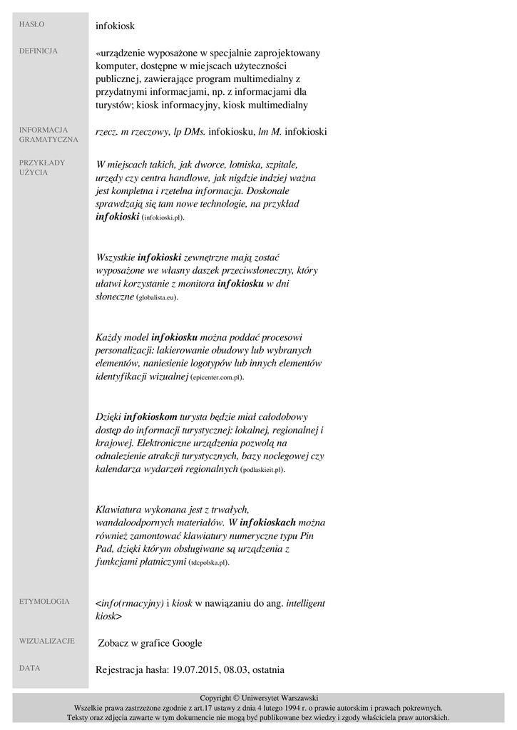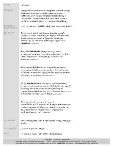 HASŁO infokiosk DEFINICJA «urządzenie wyposażone w specjalnie zaprojektowany komputer, dostępne w miejscach użyteczności publicznej, zawierające program multimedialny z przydatnymi informacjami, np. z informacjami dla turystów; kiosk informacyjny, kiosk multimedialny» INFORMACJA GRAMATYCZNA rzecz. m rzeczowy, lp DMs. infokiosku, lm M. infokioski PRZYKŁADY UŻYCIA W miejscach takich, jak dworce, lotniska, szpitale, urzędy czy centra handlowe, jak nigdzie indziej ważna jest kompletna i rzetelna informacja. Doskonale sprawdzają się tam nowe technologie, na przykład infokioski (infokioski.pl). Wszystkie infokioski zewnętrzne mają zostać wyposażone we własny daszek przeciwsłoneczny, który ułatwi korzystanie z monitora infokiosku w dni słoneczne (globalista.eu). Każdy model infokiosku można poddać procesowi personalizacji: lakierowanie obudowy lub wybranych elementów, naniesienie logotypów lub innych elementów identyfikacji wizualnej (epicenter.com.pl). Dzięki infokioskom turysta będzie miał całodobowy dostęp do informacji turystycznej: lokalnej, regionalnej i krajowej. Elektroniczne urządzenia pozwolą na odnalezienie atrakcji turystycznych, bazy noclegowej czy kalendarza wydarzeń regionalnych (podlaskieit.pl). Klawiatura wykonana jest z trwałych, wandaloodpornych materiałów. W infokioskach można również zamontować klawiatury numeryczne typu Pin Pad, dzięki którym obsługiwane są urządzenia z funkcjami płatniczymi (tdcpolska.pl). ETYMOLOGIA WIZUALIZACJE DATA <info(rmacyjny) i kiosk w nawiązaniu do ang. intelligent kiosk> Zobacz w grafice Google Rejestracja hasła: 19.07.2015, 08.03, ostatnia Copyright © Uniwersytet Warszawski Wszelkie prawa zastrzeżone zgodnie z art.17 ustawy z dnia 4 lutego 1994 r. o prawie autorskim i prawach pokrewnych. Teksty oraz zdjęcia zawarte w tym dokumencie nie mogą być publikowane bez wiedzy i zgody właściciela praw autorskich. aktualizacja hasła: 25.07.2015, 15.53 AUTOR Paweł Ciach REDAKTOR Maciej Czeszewski Copyright © Uniwersytet Warszawski Wszelkie prawa zastrzeżone zgodnie z art.17 ustawy z dnia 4 lutego 1994 r. o prawie autorskim i prawach pokrewnych. Teksty oraz zdjęcia zawarte w tym dokumencie nie mogą być publikowane bez wiedzy i zgody właściciela praw autorskich. Powered by TCPDF (www.tcpdf.org)