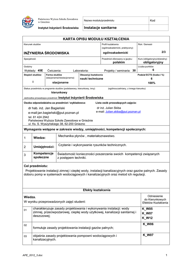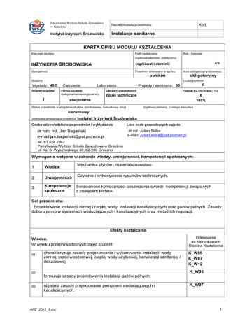 Państwowa Wyższa Szkoła Zawodowa w Gnieźnie Nazwa modułu/przedmiotu Instytut Inżynierii Środowiska Instalacje sanitarne Kod KARTA OPISU MODUŁU KSZTAŁCENIA Kierunek studiów Profil kształcenia Rok / Semestr (ogólnoakademicki, praktyczny) 2/3 ogólnoakademicki INŻYNIERIA ŚRODOWISKA Specjalność Przedmiot oferowany w języku: Kurs (obligatoryjny/obieralny) polskim obligatoryjny Liczba punktów Godziny Wykłady: 45E Stopień studiów: I Ćwiczenia: Forma studiów (stacjonarna/niestacjonarna) 6 Projekty / seminaria: 30 Laboratoria: Obszar(y) kształcenia Podział ECTS (liczba i %) nauki techniczne 6 100% stacjonarne Status przedmiotu w programie studiów (podstawowy, kierunkowy, inny) Liczba punktów (ogólnouczelniany, z innego kierunku) kierunkowy Jednostka prowadząca przedmiot: Instytut xx Inżynierii Środowiska Osoba odpowiedzialna za przedmiot / wykładowca: dr hab. inż. Jan Bagieński e-mail:jan.bagień[email protected] xxx Lista osób prowadzących zajęcia: dr inż. Julian Skiba e-mail: [email protected] tel. 61 424 2942 Państwowa Wyższa Szkoła Zawodowa w Gnieźnie ul. Ks. S. Wyszyńskiego 38, 62-200 Gniezno Wymagania wstępne w zakresie wiedzy, umiejętności, kompetencji społecznych: 1 Wiedza: 2 Umiejętności: 3 Kompetencje społeczne Mechanika płynów , materiałoznawstwo. Czytanie i wykonywanie rysunków technicznych. Świadomość konieczności poszerzania swoich kompetencji związanych z postępem techniki. Cel przedmiotu: Projektowanie instalacji zimnej i ciepłej wody, instalacji kanalizacyjnych oraz gazów palnych. Zasady doboru pomp w systemach wodociągowych i kanalizacyjnych oraz metod ich regulacji. Efekty kształcenia Wiedza. W wyniku przeprowadzonych zajęć student: 01 02 03 charakteryzuje zasady projektowania i wykonywania instalacji: wody zimnej, przeciwpożarowej, ciepłej wody użytkowej, kanalizacji sanitarnej i deszczowej; Odniesienie do Kierunkowych Efektów Kształcenia K_W05 K_W07 K_W12 K_W06 formułuje zasady projektowania instalacji gazów palnych; objaśnia zasady projektowania pompowni wodociągowych i kanalizacyjnych. APE_2012_3.doc K_W07 1 Państwowa Wyższa Szkoła Zawodowa w Gnieźnie Nazwa modułu/przedmiotu Instytut Inżynierii Środowiska Instalacje sanitarne Kod Umiejętności. W wyniku przeprowadzonych zajęć student potrafi: 01 zaprojektować i zaplanować wykonywanie instalacji wody zimnej, przeciwpożarowej, ciepłej wody użytkowej, kanalizacji sanitarnej i deszczowej; 02 zaprojektować instalacje gazów palnych dla budownictwa mieszkaniowego K_U13 i użyteczności publicznej; K_U16 03 projektować i organizować wykonanie pompowni systemach wodociągowych i kanalizacyjnych. stosowanych K_U16 w K_U14 K_U16 Kompetencje społeczne. W wyniku przeprowadzonych zajęć student zdobędzie następujące kompetencje: 01 rozumie potrzebę permanentnego kształcenia się i przekazywania w sposób zrozumiały informacji z najbliższym otoczeniem w działalności zawodowej; K_K01 02 rozumie pozatechniczne ( w tym ekologiczne) skutki swojego działania i jego wpływu na środowisko; K_K02 potrafi myśleć i działać w sposób przedsiębiorczy. K_K06 03 Sposoby sprawdzenia efektów kształcenia Wykład pisemny egzamin końcowy, (20 do 25 pytań – test), Ćw. projektowe ocena postępu prac projektowych na każdych zajęciach, ocena wykonanego projektu, sprawdzian z wiedzy dotyczącej przedmiotu oraz wiedzy związanej bezpośrednio z wykonanym projektem, aktywność oceniana na każdych zajęciach. Uzyskiwanie punktów dodatkowych za aktywność podczas zajęć, a szczególnie za: sygnalizowanie pomyłek i niejasności prowadzącemu zajęcia, proponowanie alternatywnych sposobów rozwiązywania zadań, staranność podczas realizacji ćwiczeń projektowych wskazywanie możliwości udoskonalenia procesu dydaktycznego Treści programowe Instalacje wody zimnej. Strefowanie instalacji. Przeciwpożarowe instalacje i urządzenia wodociągowe. Instalacje ciepłej wody użytkowej. Instalacje kanalizacji bytowo-gospodarczej oraz kanalizacji deszczowej. Pompy wirowe i ich charakterystyki. Łączenie pomp. Punkt pracy w układzie pompowym. Parametry regulacji pomp wirowych. Zbiorniki górne (strychowe). Tradycyjne zestawy hydroforowe. Zbiorniki pośrednie. Pompownie kaskadowe. Pompownie z regulacją prędkości obrotowej. Kawitacja – przebieg zjawiska. Nadwyżki antykawitacyjne. Dopuszczalna wysokość ssania i napływu pomp wirowych. Metody zapobiegania kawitacji. Charakterystyki gazów palnych i kryteria ich oceny. Palniki gazowe, zabezpieczenia. Odprowadzanie spalin. Instalacje gazów palnych. Własności i instalacje gazów ciekłych. APE_2012_3.doc 2 Państwowa Wyższa Szkoła Zawodowa w Gnieźnie Nazwa modułu/przedmiotu Instytut Inżynierii Środowiska Instalacje sanitarne Kod Literatura podstawowa: 1. Chudzicki J., Sosnowski S., Instalacje wodociągowe, Wyd. Seidel-Przywecki, Warszawa 2005. 2. Chudzicki J., Sosnowski S., Instalacje kanalizacyjne, Wyd. Seidel-Przywecki, Warszawa 2004. Literatura uzupełniająca: 1. Chudzicki J., Instalacje ciepłej wody w budynkach, Fundacja Poszanowania Energii – Sorus, Warszawa - Poznań, 2006. Obciążenie pracą studenta forma aktywności Godzin ECTS Łączny nakład pracy 120 6 Zajęcia wymagające indywidualnego kontaktu z nauczycielem 80 4 Zajęcia o charakterze praktycznym 30 2 APE_2012_3.doc 3