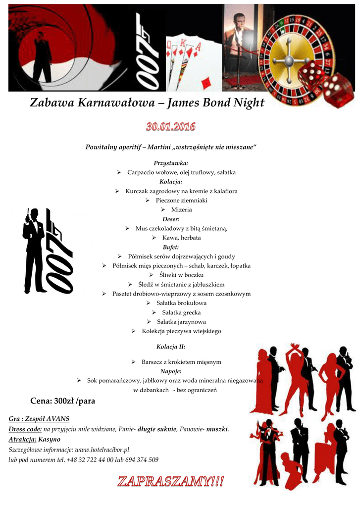 Zabawa Karnawałowa – James Bond Night Powitalny aperitif – Martini „wstrząśnięte nie mieszane” Przystawka:  Carpaccio wołowe, olej truflowy, sałatka Kolacja:  Kurczak zagrodowy na kremie z kalafiora  Pieczone ziemniaki  Mizeria Deser:  Mus czekoladowy z bitą śmietaną,  Kawa, herbata Bufet:   Półmisek serów dojrzewających i goudy Półmisek mięs pieczonych – schab, karczek, łopatka    Śliwki w boczku Śledź w śmietanie z jabłuszkiem Pasztet drobiowo-wieprzowy z sosem czosnkowym  Sałatka brokułowa    Sałatka grecka Sałatka jarzynowa Kolekcja pieczywa wiejskiego Kolacja II:  Barszcz z krokietem mięsnym Napoje:  Sok pomarańczowy, jabłkowy oraz woda mineralna niegazowana w dzbankach - bez ograniczeń Cena: 300zł /para Gra : Zespół AVANS Dress code: na przyjęciu mile widziane, Panie- długie suknie, Panowie- muszki. Atrakcja: Kasyno Szczegółowe informacje: www.hotelracibor.pl lub pod numerem tel. +48 32 722 44 00 lub 694 374 509