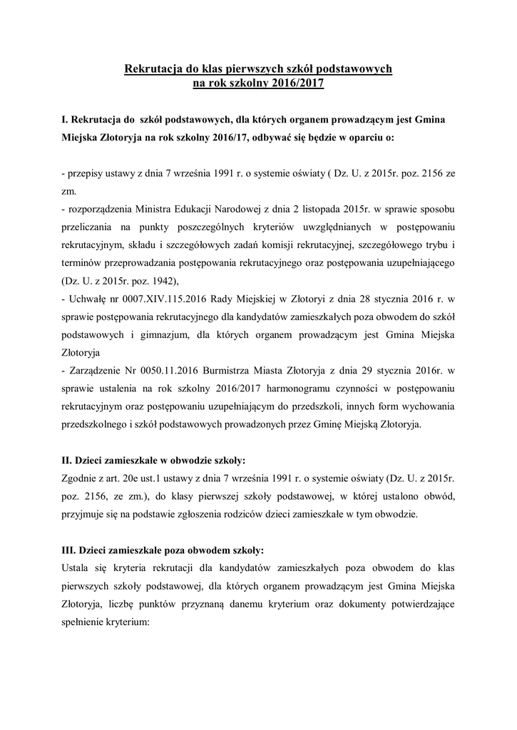 Rekrutacja do klas pierwszych szkół podstawowych na rok szkolny 2016/2017 I. Rekrutacja do szkół podstawowych, dla których organem prowadzącym jest Gmina Miejska Złotoryja na rok szkolny 2016/17, odbywać się będzie w oparciu o: - przepisy ustawy z dnia 7 września 1991 r. o systemie oświaty ( Dz. U. z 2015r. poz. 2156 ze zm. - rozporządzenia Ministra Edukacji Narodowej z dnia 2 listopada 2015r. w sprawie sposobu przeliczania na punkty poszczególnych kryteriów uwzględnianych w postępowaniu rekrutacyjnym, składu i szczegółowych zadań komisji rekrutacyjnej, szczegółowego trybu i terminów przeprowadzania postępowania rekrutacyjnego oraz postępowania uzupełniającego (Dz. U. z 2015r. poz. 1942), - Uchwałę nr 0007.XIV.115.2016 Rady Miejskiej w Złotoryi z dnia 28 stycznia 2016 r. w sprawie postępowania rekrutacyjnego dla kandydatów zamieszkałych poza obwodem do szkół podstawowych i gimnazjum, dla których organem prowadzącym jest Gmina Miejska Złotoryja - Zarządzenie Nr 0050.11.2016 Burmistrza Miasta Złotoryja z dnia 29 stycznia 2016r. w sprawie ustalenia na rok szkolny 2016/2017 harmonogramu czynności w postępowaniu rekrutacyjnym oraz postępowaniu uzupełniającym do przedszkoli, innych form wychowania przedszkolnego i szkół podstawowych prowadzonych przez Gminę Miejską Złotoryja. II. Dzieci zamieszkałe w obwodzie szkoły: Zgodnie z art. 20e ust.1 ustawy z dnia 7 września 1991 r. o systemie oświaty (Dz. U. z 2015r. poz. 2156, ze zm.), do klasy pierwszej szkoły podstawowej, w której ustalono obwód, przyjmuje się na podstawie zgłoszenia rodziców dzieci zamieszkałe w tym obwodzie. III. Dzieci zamieszkałe poza obwodem szkoły: Ustala się kryteria rekrutacji dla kandydatów zamieszkałych poza obwodem do klas pierwszych szkoły podstawowej, dla których organem prowadzącym jest Gmina Miejska Złotoryja, liczbę punktów przyznaną danemu kryterium oraz dokumenty potwierdzające spełnienie kryterium: Liczba punktów Dokument potwierdzający spełnienie kryterium Lp Kryterium 1. Rodzeństwo kandydata uczęszcza do danej szkoły 10 Dane potwierdzone przez dyrektora szkoły na podstawie dokumentacji będącej w posiadaniu szkoły 2. Kandydat uczęszczał do przedszkola publicznego lub publicznej szkoły podstawowej znajdującego/cej się w obwodzie danej szkoły 5 Oświadczenie rodzica/opiekuna prawnego 3. Rodzice kandydata lub rodzic samotnie wychowują pracują/pracuje lub prowadzą/prowadzi działalność gospodarczą w obwodzie szkoły 3 Zaświadczenie pracodawcy o zatrudnieniu, zaświadczenia o wykonywaniu pracy na podstawie umowy cywilnoprawnej, wydruk ze strony Centralnej Ewidencji Gospodarczej lub z Krajowego Rejestru Sądowego 4. W obwodzie szkoły zamieszkują bliscy krewni kandydata (np. babcia, dziadek) wspierający rodziców/rodzica samotnie wychowującego w zapewnieniu dziecku należytej opieki 1 Oświadczenie rodzica/opiekuna prawnego IV. Terminy postępowania rekrutacyjnego oraz postępowania rekrutacyjnego oraz postępowania uzupełniającego, a także terminy składania dokumentów do klas pierwszych szkół podstawowych dla których organem prowadzącym jest Gmina Miejska Złotoryja, na rok szkolny 2016/2017. Lp. Rodzaj czynności 1 1. 2 Złożenie wniosku o przyjęcie do szkoły podstawowej wraz z dokumentami potwierdzającymi spełnianie przez kandydata warunków lub kryteriów branych pod uwagę w postępowaniu rekrutacyjnym Weryfikacja przez komisję rekrutacyjną wniosków o przyjęcie do szkoły 2. Termin w postępowaniu rekrutacyjnym 3 Termin w postępowaniu uzupełniającym 4 od 15.03.2016r. do 31.03.2016r. od 04.05.2016r. do 06.05.2016r. od 01.04.2016r. do 06.04.2016r. od 07.05.2016r. do 13.05.2016r. 3. 4. 5. podstawowej i dokumentów potwierdzających spełnianie przez kandydata warunków lub kryteriów branych pod uwagę w postępowaniu rekrutacyjnym, w tym dokonanie przez przewodniczącego komisji rekrutacyjnej czynności, o których mowa w art. 20t ust. 7 ustawy z dnia 7 września 1991r. o systemie oświaty Podanie do publicznej wiadomości przez komisję rekrutacyjną listy kandydatów zakwalifikowanych i kandydatów niezakwalifikowanych Potwierdzenie przez rodzica kandydata woli przyjęcia w postaci pisemnego oświadczenia Podanie do publicznej wiadomości przez komisję rekrutacyjną listy kandydatów przyjętych i kandydatów nieprzyjętych 25.04.2016r. 16.05.2016r. od 26.04.2016r. do 29.04.2016r. od 17.05.2016r. do 20.05.2016r. 04.05.2016r. 25.05.2016r. V. Informacje ogólne: 1. Obowiązek szkolny dziecka rozpoczyna się z początkiem roku szkolnego w roku kalendarzowym, w którym dziecko kończy 7 lat. 2. Dzieci 6–letnie od 1 września 2016 r. mają prawo do rozpoczęcia edukacji szkolnej. Dziecko 6 – letnie na wniosek rodziców będzie przyjęte do klasy pierwszej pod warunkiem: - korzystania z wychowania przedszkolnego w roku szkolnym poprzedzającym rozpoczęcie nauki w klasie pierwszej lub - posiadania opinii poradni psychologiczno-pedagogicznej o możliwości rozpoczęcia nauki w szkole podstawowej (w przypadku niekorzystania przez dziecko z wychowania przedszkolnego). 3. Dziecko, które w roku szkolnym 2015/2016 realizuje obowiązkowe roczne przygotowanie przedszkolne w oddziale przedszkolnym w szkole podstawowej innej niż szkoła, w której obwodzie mieszka, na wniosek rodziców złożony do 31.03.2016 r. będzie przyjmowane do klasy pierwszej tej szkoły podstawowej bez przeprowadzania postępowania rekrutacyjnego.