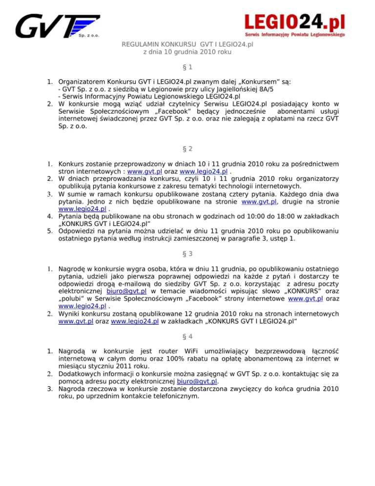 REGULAMIN KONKURSU GVT I LEGIO24.pl z dnia 10 grudnia 2010 roku §1 1. Organizatorem Konkursu GVT i LEGIO24.pl zwanym dalej „Konkursem” są: - GVT Sp. z o.o. z siedzibą w Legionowie przy ulicy Jagiellońskiej 8A/5 - Serwis Informacyjny Powiatu Legionowskiego LEGIO24.pl 2. W konkursie mogą wziąć udział czytelnicy Serwisu LEGIO24.pl posiadający konto w Serwisie Społecznościowym „Facebook” będący jednocześnie abonentami usługi internetowej świadczonej przez GVT Sp. z o.o. oraz nie zalegają z opłatami na rzecz GVT Sp. z o.o. §2 1. Konkurs zostanie przeprowadzony w dniach 10 i 11 grudnia 2010 roku za pośrednictwem stron internetowych : www.gvt.pl oraz www.legio24.pl . 2. W dniach przeprowadzania konkursu, czyli 10 i 11 grudnia 2010 roku organizatorzy opublikują pytania konkursowe z zakresu tematyki technologii internetowych. 3. W sumie w ramach konkursu opublikowane zostaną cztery pytania. Każdego dnia dwa pytania. Jedno z nich będzie opublikowane na stronie www.gvt.pl, drugie na stronie www.legio24.pl . 4. Pytania będą publikowane na obu stronach w godzinach od 10:00 do 18:00 w zakładkach „KONKURS GVT i LEGIO24.pl” 5. Odpowiedzi na pytania można udzielać w dniu 11 grudnia 2010 roku po opublikowaniu ostatniego pytania według instrukcji zamieszczonej w paragrafie 3, ustęp 1. §3 1. Nagrodę w konkursie wygra osoba, która w dniu 11 grudnia, po opublikowaniu ostatniego pytania, udzieli jako pierwsza poprawnej odpowiedzi na każde z pytań i dostarczy te odpowiedzi drogą e-mailową do siedziby GVT Sp. z o.o. korzystając z adresu poczty elektronicznej [email protected] w temacie wiadomości wpisując słowo „KONKURS” oraz „polubi” w Serwisie Społecznościowym „Facebook” strony internetowe www.gvt.pl oraz www.legio24.pl . 2. Wyniki konkursu zostaną opublikowane 12 grudnia 2010 roku na stronach internetowych www.gvt.pl oraz www.legio24.pl w zakładkach „KONKURS GVT I LEGIO24.pl” §4 1. Nagrodą w konkursie jest router WiFi umożliwiający bezprzewodową łączność internetową w całym domu oraz 100% rabatu na opłatę abonamentową za internet w miesiącu styczniu 2011 roku. 2. Dodatkowych informacji o konkursie można zasięgnąć w GVT Sp. z o.o. kontaktując się za pomocą adresu poczty elektronicznej [email protected]. 3. Nagroda rzeczowa w konkursie zostanie dostarczona zwycięzcy do końca grudnia 2010 roku, po uprzednim kontakcie telefonicznym.