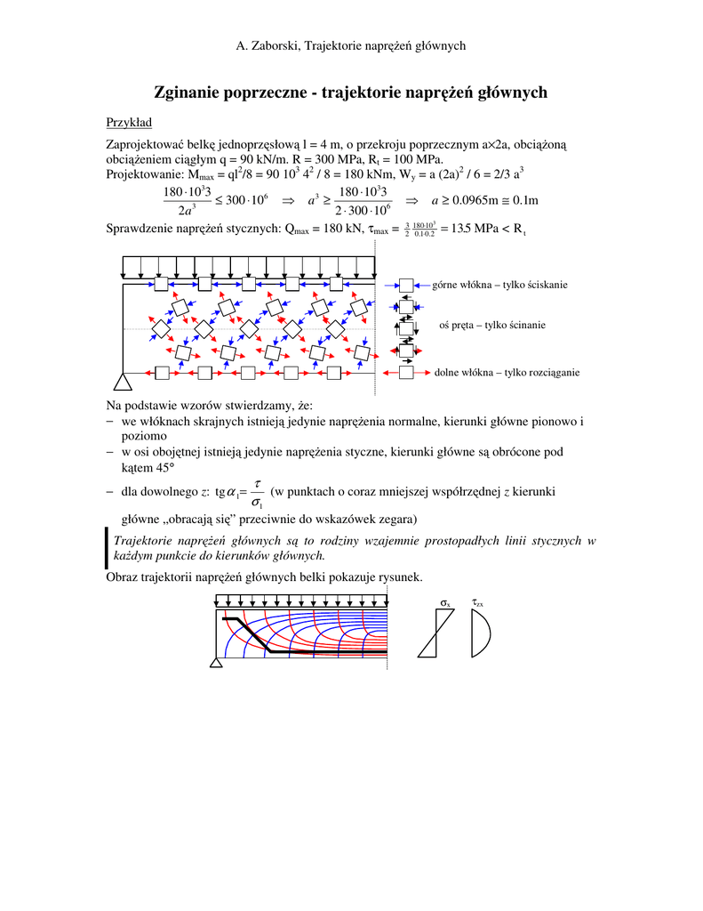 A. Zaborski, Trajektorie napr e głównych Zginanie poprzeczne - trajektorie napr e głównych Przykład Zaprojektowa belk jednoprz słow l = 4 m, o przekroju poprzecznym a×2a, obci on obci eniem ci głym q = 90 kN/m. R = 300 MPa, Rt = 100 MPa. Projektowanie: Mmax = ql2/8 = 90 103 42 / 8 = 180 kNm, Wy = a (2a)2 / 6 = 2/3 a3 180 ⋅ 1033 180 ⋅ 1033 6 3 ≤ 300 ⋅ 10 a ≥ a ≥ 0.0965m ≅ 0.1m 2a 3 2 ⋅ 300 ⋅ 106 ⋅103 . MPa < R t Sprawdzenie napr e stycznych: Qmax = 180 kN, τmax = 23 180 0.1⋅0.2 = 135 górne włókna – tylko ciskanie o pr ta – tylko cinanie dolne włókna – tylko rozci ganie Na podstawie wzorów stwierdzamy, e: − we włóknach skrajnych istniej jedynie napr enia normalne, kierunki główne pionowo i poziomo − w osi oboj tnej istniej jedynie napr enia styczne, kierunki główne s obrócone pod k tem 45° − dla dowolnego z: tg α 1= τ (w punktach o coraz mniejszej współrz dnej z kierunki σ1 główne „obracaj si ” przeciwnie do wskazówek zegara) Trajektorie napr e głównych s to rodziny wzajemnie prostopadłych linii stycznych w ka dym punkcie do kierunków głównych. Obraz trajektorii napr e głównych belki pokazuje rysunek. σx τzx