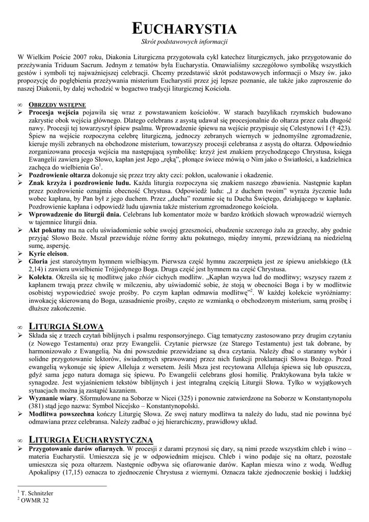 EUCHARYSTIA Skrót podstawowych informacji W Wielkim Poście 2007 roku, Diakonia Liturgiczna przygotowała cykl katechez liturgicznych, jako przygotowanie do przeŜywania Triduum Sacrum. Jednym z tematów była Eucharystia. Omawialiśmy szczegółowo symbolikę wszystkich gestów i symboli tej najwaŜniejszej celebracji. Chcemy przedstawić skrót podstawowych informacji o Mszy św. jako propozycję do pogłębienia przeŜywania misterium Eucharystii przez jej lepsze poznanie, ale takŜe jako zaproszenie do naszej Diakonii, by dalej wchodzić w bogactwo tradycji liturgicznej Kościoła. • OBRZĘDY WSTĘPNE Procesja wejścia pojawiła się wraz z powstawaniem kościołów. W starach bazylikach rzymskich budowano zakrystie obok wejścia głównego. Dlatego celebrans z asystą udawał się procesjonalnie do ołtarza przez cała długość nawy. Procesji tej towarzyszył śpiew psalmu. Wprowadzenie śpiewu na wejście przypisuje się Celestynowi I († 423). Śpiew na wejście rozpoczyna celebrę liturgiczną, jednoczy zebranych wiernych w jednomyślne zgromadzenie, kieruje myśli zebranych na obchodzone misterium, towarzyszy procesji celebransa z asystą do ołtarza. Odpowiednio zorganizowana procesja wejścia ma następującą symbolikę: krzyŜ jest znakiem przychodzącego Chrystusa, księga Ewangelii zawiera jego Słowo, kapłan jest Jego „ręką”, płonące świece mówią o Nim jako o Światłości, a kadzielnica zachęca do wielbienia Go1. Pozdrowienie ołtarza dokonuje się przez trzy akty czci: pokłon, ucałowanie i okadzenie. Znak krzyŜa i pozdrowienie ludu. KaŜda liturgia rozpoczyna się znakiem naszego zbawienia. Następnie kapłan przez pozdrowienie oznajmia obecność Chrystusa. Odpowiedź ludu: „I z duchem twoim” wyraŜa Ŝyczenie ludu wobec kapłana, by Pan był z jego duchem. Przez „ducha” rozumie się tu Ducha Świętego, działającego w kapłanie. Pozdrowienie kapłana i odpowiedź ludu ujawnia takŜe misterium zgromadzonego kościoła. Wprowadzenie do liturgii dnia. Celebrans lub komentator moŜe w bardzo krótkich słowach wprowadzić wiernych w tajemnice liturgii dnia. Akt pokutny ma na celu uświadomienie sobie swojej grzeszności, obudzenie szczerego Ŝalu za grzechy, aby godnie przyjąć Słowo BoŜe. Mszał przewiduje róŜne formy aktu pokutnego, między innymi, przewidzianą na niedzielną sumę, aspersję. Kyrie eleison. Gloria jest staroŜytnym hymnem wielbiącym. Pierwsza część hymnu zaczerpnięta jest ze śpiewu anielskiego (Łk 2,14) i zawiera uwielbienie Trójjedynego Boga. Druga część jest hymnem na część Chrystusa. Kolekta. Określa się tę modlitwę jako zbiór cichych modlitw. „Kapłan wzywa lud do modlitwy; wszyscy razem z kapłanem trwają przez chwilę w milczeniu, aby uświadomić sobie, Ŝe stoją w obecności Boga i by w modlitwie osobistej wypowiedzieć swoje prośby. Po czym kapłan odmawia modlitwę”2. W kaŜdej kolekcie wyróŜniamy: inwokację skierowaną do Boga, uzasadnienie prośby, często ze wzmianką o obchodzonym misterium, samą prośbę i dłuŜsze zakończenie. • LITURGIA SŁOWA Składa się z trzech czytań biblijnych i psalmu responsoryjnego. Ciąg tematyczny zastosowano przy drugim czytaniu (z Nowego Testamentu) oraz przy Ewangelii. Czytanie pierwsze (ze Starego Testamentu) jest tak dobrane, by harmonizowało z Ewangelią. Na dni powszednie przewidziane są dwa czytania. NaleŜy dbać o staranny wybór i solidne przygotowanie lektorów, świadomych sprawowanej przez nich funkcji proklamacji Słowa BoŜego. Przed ewangelią wykonuje się śpiew Alleluja z wersetem. Jeśli Msza jest recytowana Alleluja śpiewa się lub opuszcza, gdyŜ sama jego natura domaga się śpiewu. Po Ewangelii celebrans głosi homilię. Praktykowana była takŜe w synagodze. Jest wyjaśnieniem tekstów biblijnych i jest integralną częścią Liturgii Słowa. Tylko w wyjątkowych sytuacjach moŜna ją zastąpić kazaniem. Wyznanie wiary. Sformułowane na Soborze w Nicei (325) i ponownie zatwierdzone na Soborze w Konstantynopolu (381) stąd jego nazwa: Symbol Nicejsko – Konstantynopolski. Modlitwa powszechna kończy Liturgię Słowa. Ze swej natury modlitwa ta naleŜy do ludu, stad nie powinna być odmawiana przez celebransa. NaleŜy zadbać o jej hierarchiczny, prawidłowy układ. • LITURGIA EUCHARYSTYCZNA Przygotowanie darów ofiarnych. W procesji z darami przynosi się dary, są nimi przede wszystkim chleb i wino – materia Eucharystii. Umieszcza się je w odpowiednim miejscu. Chleb i wino podaje się na ołtarz, pozostałe umieszcza się poza ołtarzem. Następnie odbywa się ofiarowanie darów. Kapłan miesza wino z wodą. Według Apokalipsy (17,15) oznacza to zjednoczenie Chrystusa z wiernymi. Oznacza takŜe zjednoczenie boskiej i ludzkiej 1 2 T. Schnitzler OWMR 32 natury w Chrystusie, albo teŜ krew i wodę z przebitego boku Chrystusa3. Następnie kapłan okadza ołtarz i dary, okadza się celebransa i lud oraz kapłan obmywa ręce na znak pragnienia wewnętrznego oczyszczenia. Modlitwa nad darami kończy obrzęd przygotowania darów. Następnie kapłan wzywa lud do modlitwy słowami: Módlcie się, aby moją i waszą modlitwę przyjął Bóg, Ojciec wszechmogący. W związku z licznymi samowolnymi zmianami tej formuły wydano dodatkowy zakaz jej zmieniania, gdyŜ jest to dogmatycznie błędne ze względu na identyfikację władzy święceń z kapłaństwem powszechnym wiernych4. Modlitwa Eucharystyczna. W niej liturgia Eucharystii osiąga swój szczyt. Jest kulminacyjną i centralną częścią całej akcji liturgicznej. Składają się na nią: Dialog przed prefacją rozpoczynający modlitwę i zwracający uwagę na obecność Pana a takŜe, poprzez dialog włącza całe zgromadzenie w modlitwę. Sięga swymi korzeniami czasów Hipolita Rzymskiego. Prefacja. Podobnie staroŜytna jak poprzedzający ja dialog. Zawiera w sobie określony motyw dziękczynienia za zbawcze działa BoŜe, dokonane w historii zbawienia.