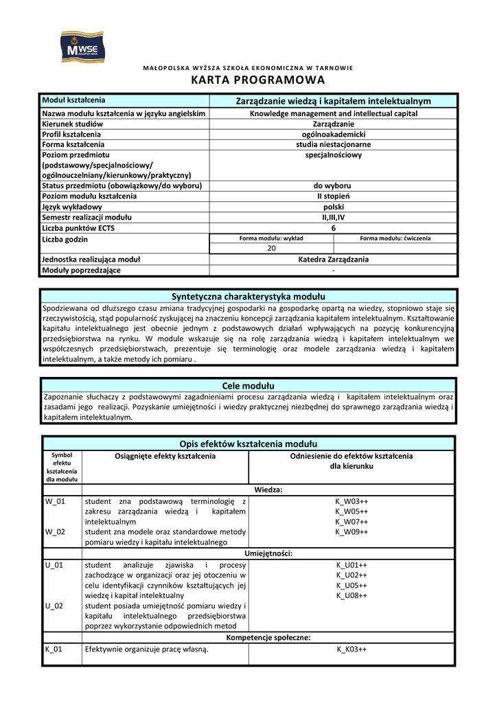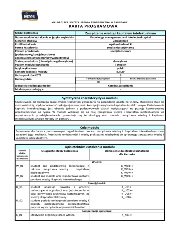 MAŁOP OLSKA WYŻSZ A SZ KOŁA E KONOMICZNA W TARN OW IE KARTA PROGRAMOWA Moduł kształcenia Zarządzanie wiedzą i kapitałem intelektualnym Nazwa modułu kształcenia w języku angielskim Kierunek studiów Profil kształcenia Forma kształcenia Poziom przedmiotu (podstawowy/specjalnościowy/ ogólnouczelniany/kierunkowy/praktyczny) Status przedmiotu (obowiązkowy/do wyboru) Poziom modułu kształcenia Język wykładowy Semestr realizacji modułu Liczba punktów ECTS Liczba godzin Knowledge management and intellectual capital Zarządzanie ogólnoakademicki studia niestacjonarne specjalnościowy do wyboru II stopień polski II,III,IV 6 Forma modułu: wykład Forma modułu: ćwiczenia 20 Jednostka realizująca moduł Moduły poprzedzające Katedra Zarządzania - Syntetyczna charakterystyka modułu Spodziewana od dłuższego czasu zmiana tradycyjnej gospodarki na gospodarkę opartą na wiedzy, stopniowo staje się rzeczywistością, stąd popularność zyskującej na znaczeniu koncepcji zarządzania kapitałem intelektualnym. Kształtowanie kapitału intelektualnego jest obecnie jednym z podstawowych działań wpływających na pozycję konkurencyjną przedsiębiorstwa na rynku. W module wskazuje się na rolę zarządzania wiedzą i kapitałem intelektualnym we współczesnych przedsiębiorstwach, prezentuje się terminologię oraz modele zarządzania wiedzą i kapitałem intelektualnym, a także metody ich pomiaru . Cele modułu Zapoznanie słuchaczy z podstawowymi zagadnieniami procesu zarządzania wiedzą i kapitałem intelektualnym oraz zasadami jego realizacji. Pozyskanie umiejętności i wiedzy praktycznej niezbędnej do sprawnego zarządzania wiedzą i kapitałem intelektualnym. Opis efektów kształcenia modułu Symbol efektu kształcenia dla modułu W_01 W_02 U_01 U_02 K_01 Osiągnięte efekty kształcenia Odniesienie do efektów kształcenia dla kierunku Wiedza: student zna podstawową terminologię z zakresu zarządzania wiedzą i kapitałem intelektualnym student zna modele oraz standardowe metody pomiaru wiedzy i kapitału intelektualnego Umiejętności: student analizuje zjawiska i procesy zachodzące w organizacji oraz jej otoczeniu w celu identyfikacji czynników kształtujących jej wiedzę i kapitał intelektualny student posiada umiejętność pomiaru wiedzy i kapitału intelektualnego przedsiębiorstwa poprzez wykorzystanie odpowiednich metod Kompetencje społeczne: Efektywnie organizuje pracę własną. K_W03++ K_W05++ K_W07++ K_W09++ K_U01++ K_U02++ K_U05++ K_U08++ K_K03++ Treści kształcenia modułu Forma modułu: wykład 1. Wprowadzenie teoretyczne – zapoznanie z istotą pojęć: wartość przedsiębiorstwa, niematerialna wartość przedsiębiorstwa, zasoby niematerialne, kapitał ludzki kapitał intelektualny, wiedza, zarządzanie wiedzą. Forma modułu: ćwiczenia 2. Zarządzanie wiedzą w organizacji – podejścia, modele, rodzaje wiedzy, zarządzanie wiedzą a wartość organizacji 3. Kapitał intelektualny a formy i wielkość organizacji: - kapitał intelektualny w nowoczesnych formach organizacji - kapitał intelektualny w tradycyjnej organizacji - specyfika funkcjonowania małego przedsiębiorstwa a koncepcja zarządzania kapitałem intelektualnym 4. Modele zarządzania kapitałem intelektualnym – Raport Konrada, Monitor Aktywów Niematerialnych (Intangible Assets Monitor), Zrównoważone Karty Punktowe, Nawigator firmy Skandia, Platforma wartości. 5. Metody pomiaru kapitału intelektualnego: - oparte o kapitalizację rynkową: wskaźnik „Q” Tobina, MV/BV. - oparte o zwrot na aktywach (ROA): Ekonomiczna wartość dodana (EVA), CIV (Calculated Intangible Value), KCE (Knowledge Capital Earnings), VAIC (Value Added Intellectual Coefficiency), HRCA (Human Resources Costing and Accounting). - bezpośredniego pomiaru kapitału intelektualnego IAV (Intangible Assets Valuation), TVC (Total Value Creation), IVM (Inclusive Valuation Methodology). Literatura podstawowa 1. 2. 3. 4. Literatura uzupełniająca 1. Zarządzanie wiedzą, red. nauk.: Dariusz Jemielniak, Andrzej K. Koźmiński, Warszawa : Oficyna a Wolters Kluwer business, 2012. Okoń-Horodyńska E., Wisła R., Kapitał intelektualny i jego ochrona, Instytut Wiedzy i Innowacji, Warszawa 2009. Jarugowa A., Fijałkowska J., Rachunkowość i zarządzanie kapitałem intelektualnym. Koncepcje i praktyka, ODDK, Gdańsk 2002. Edvinsson L., Malone M.S. Kapitał intelektualny. Poznaj prawdziwa wartość swego przedsiębiorstwa odnajdując jego ukryte korzenie, Wydawnictwo Naukowe PWN, Warszawa 2001 Fitz-enz J., Rentowność inwestycji w kapitał ludzki, Oficyna Ekonomiczna, Dom Wydawniczy ABC, Kraków 2001. Metody dydaktyczne Wykład: prezentacja treści teoretycznych z użyciem projektora multimedialnego blended learning (b-learning).