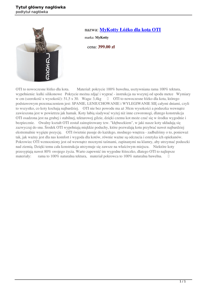 Tytuł główny nagłówka podtytuł nagłówka nazwa: MyKotty Łóżko dla kota OTI marka: MyKotty cena: 399.00 zł OTI to nowoczesne łóżko dla kota. Materiał: pokrycie 100% bawełna, usztywniana rama 100% tektura, wypełnienie: kulki silikonowe Pokrycie można zdjąć i wyprać - instrukcja na wszytej od spodu metce Wymiary w cm (szerokość x wysokość): 51,5 x 30. Waga: 3,4kg OTI to nowoczesne łóżko dla kota, którego podstawowym przeznaczeniem jest: SPANIE, LENIUCHOWANIE i WYLEGIWANIE SIĘ całymi dniami, czyli to wszystko, co koty kochają najbardziej. OTI nie bez powodu ma aż 30cm wysokości a poduszka wewnątrz zawieszona jest w powietrzu jak hamak. Koty lubią siadywać wyżej niż inne czworonogi, dlatego konstrukcja OTI osadzona jest na grubej i stabilnej, tekturowej gilzie, dzięki czemu kot może czuć się w środku wygodnie i bezpiecznie. Owalny kształt OTI został zainspirowany tzw. "kłębuszkiem", w jaki nasze koty układają się zazwyczaj do snu. Środek OTI wypełniają miękkie poduchy, które pozwalają kotu przybrać nawet najbardziej ekstremalnie wygięte pozycję. OTI świetnie pasuje do każdego, modnego wnętrza - zadbaliśmy o to, ponieważ tak, jak ważny jest dla nas komfort i wygoda dla kotów, równie ważne są odczucia i estetyka ich opiekunów. Pokrowiec OTI wzmocniony jest od wewnątrz mocnymi taśmami, zapinanymi na klamry, aby utrzymać poduszki nad ziemią. Dzięki temu cała konstrukcja utrzymuje się zawsze na właściwym miejscu. Niektóre koty przesypiają nawet 80% swojego życia. Warto zapewnić im wygodne łóżeczko, dlatego OTI to najlepsze materiały: rama to 100% naturalna tektura, materiał pokrowca to 100% naturalna bawełna. 1/1