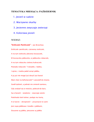 TEMATYKA MIESIĄCA: PAŹDZIERNIK 1. Jesień w sadzie 2. Warzywne skarby 3. Jesienne zwyczaje zwierząt 4. Kolorowa jesień WIERSZ: "Entliczek Pentliczek" - Jan Brzechwa Entliczek-pentliczek, czerwony stoliczek, A na tym stoliczku pleciony koszyczek, W koszyczku jabłuszko, w jabłuszku robaczek, A na tym robaczku zielony kubraczek. Powiada robaczek: "I dziadek, i babka, I ojciec, i matka jadali wciąż jabłka, A ja już nie mogę! Już dosyć! Już basta! Mam chęć na befsztyczek!" I poszedł do miasta. Szedł tydzień, a jednak nie zmienił zamiaru, Gdy znalazł się w mieście, poleciał do baru. Są w barach - wiadomo - zwyczaje utarte: Podchodzi doń kelner, podaje mu kartę, A w karcie - okropność! - przyznacie to sami: Jest zupa jabłkowa i knedle z jabłkami, Duszone są jabłka, pieczone są jabłka I z jabłek szarlotka, i kompot i placek i babka! No, widzisz, robaczku! I gdzie twój befsztyczek? Entliczek-pentliczek, czerwony stoliczek. PIOSENKA: "Zbieramy grzyby" I. Z wielkim koszem idzie jesień po lesie. Co w tym koszu pani jesień nam niesie? ref: Kurki, rydze i maślaki, borowiki i kozaki pozbieramy dziś. Kurki, rydze i maślaki, borowiki i kozaki pozbieramy dziś. II. Muchomora ominiemy z daleka. niech muchomor na złe muchy tu czeka. ref: Kurki, rydze i maślaki, borowiki i kozaki pozbieramy dziś. Kurki, rydze i maślaki, borowiki i kozaki pozbieramy dziś. III. Poszukamy żółtych kurek pod sosną. Nad potokiem smaczne rydze nam rosną. ref: Kurki, rydze i maślaki, borowiki i kozaki pozbieramy dziś. Kurki, rydze i maślaki, borowiki i kozaki pozbieramy dziś. "Już owoców pełen kosz" 1. Hula w polu psotny wiatr i jabłonie trzęsie, a z jabłoni jabłek grad szur i szur przez gałęzie. Ref: Już owoców pełen kosz mienią, mienią się barwami te owoce smaczne są jedz je, jedz je razem z nami. x 2 2. Kiedy w polu wicher dmie pójdę pod jablonie i nastawię ręce dwie hop jabłuszko w dłonie. Ref: Już owoców... 3. Jabłka co czerwienią się do domu zaniosę i sałatkę zrobię z nich spróbuj bardzo proszę. Ref: Już owoców... ZABAWA: "Idzie zuch" Ref: Idzie zuch, wicher dmucha, I do tyłu ciągnie zucha, Ale zuch się nie przejmuje, Dalej raźno maszeruje. Przygotował zuch dwie ręce, Tylko dwie, bo nie miał więcej. Ręka lewa, ręka prawa, To dla zucha jest zabawa. Ref.Idzie zuch... Przygotował zuch dwie nogi, Do dalekiej, ciężkiej drogi. Noga lewa, noga prawa, To dla zuch jest zabawa. Ref. Idzie zuch... Przygotował zuch dwa oka, Takie wielkie jak u smoka. Oko lewe, oko prawe, Każde świata są Ref.Idzie zuch... "Wężyk" Cały wężyk robi: hop! Głowa w lewo, w lewo krok. Do przodu głośno kroki trzy. Idę na koniec, prowadzisz Ty!