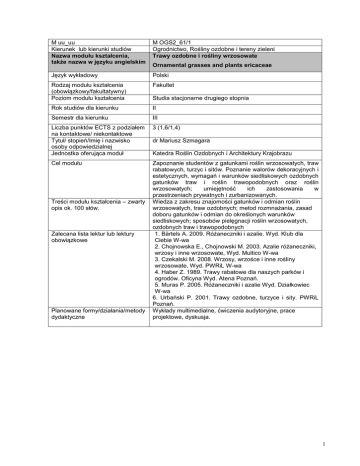 M uu_uu Kierunek lub kierunki studiów Nazwa modułu kształcenia, także nazwa w języku angielskim M OGS2_61/1 Ogrodnictwo, Rośliny ozdobne i tereny zieleni Trawy ozdobne i rośliny wrzosowate Język wykładowy Polski Rodzaj modułu kształcenia (obowiązkowy/fakultatywny) Poziom modułu kształcenia Fakultet Rok studiów dla kierunku II Semestr dla kierunku III Liczba punktów ECTS z podziałem na kontaktowe/ niekontaktowe Tytuł/ stopień/Imię i nazwisko osoby odpowiedzialnej Jednostka oferująca moduł 3 (1,6/1,4) Cel modułu Zapoznanie studentów z gatunkami roślin wrzosowatych, traw rabatowych, turzyc i sitów. Poznanie walorów dekoracyjnych i estetycznych, wymagań i warunków siedliskowych ozdobnych gatunków traw i roślin trawopodobnych oraz roślin wrzosowatych; umiejętność ich zastosowania w przestrzeniach prywatnych i zurbanizowanych. Wiedza z zakresu znajomości gatunków i odmian roślin wrzosowatych, traw ozdobnych; metod rozmnażania, zasad doboru gatunków i odmian do określonych warunków siedliskowych; sposobów pielęgnacji roślin wrzosowatych, ozdobnych traw i trawopodobnych 1. Bärtels A. 2009. Różaneczniki i azalie. Wyd. Klub dla Ciebie W-wa 2. Chojnowska E., Chojnowski M. 2003. Azalie różaneczniki, wrzosy i inne wrzosowate, Wyd. Multico W-wa 3. Czekalski M. 2008. Wrzosy, wrzośce i inne rośliny wrzosowate, Wyd. PWRiL W-wa 4. Haber Z. 1989. Trawy rabatowe dla naszych parków i ogrodów. Oficyna Wyd. Atena Poznań. 5. Muras P. 2005. Różaneczniki i azalie Wyd. Działkowiec W-wa 6. Urbański P. 2001. Trawy ozdobne, turzyce i sity. PWRiL Poznań. Wykłady multimedialne, ćwiczenia audytoryjne, prace projektowe, dyskusja. Treści modułu kształcenia – zwarty opis ok. 100 słów. Zalecana lista lektur lub lektury obowiązkowe Planowane formy/działania/metody dydaktyczne Ornamental grasses and plants ericaceae Studia stacjonarne drugiego stopnia dr Mariusz Szmagara Katedra Roślin Ozdobnych i Architektury Krajobrazu 1