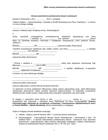 [Wzór umowy powierzenia przetwarzania danych osobowych] Umowa powierzenia przetwarzania danych osobowych zawarta w Warszawie w dniu ____________ 2014 r. pomiędzy Teatrem Wielkim – Operą Narodową, z siedzibą w 00-950 Warszawie przy Placu Teatralnym 1, w imieniu i na rzecz którego działają: ____________ - ____________ zwanym w dalszej części niniejszej umowy „Powierzającym”, a *[Imię, nazwisko], przedsiębiorcą, prowadzącym/cą działalność gospodarczą pod firmą ________________, z siedzibą w________________ pod adresem ____________________(status wpisu do Centralnej Ewidencji i Informacji o Działalności Gospodarczej z dnia zawarcia Umowy: „aktywny”) REGON_______________ NIP____________________, zwanym/ną dalej „Wykonawcą” *wspólnie prowadzącymi działalność jako spółka cywilna, pod firmą __________________, z siedzibą _______________, pod adresem __________________, REGON ________________, NIP ________________ zwanym/ną dalej „Wykonawcą” * [Firma] z siedzibą w ___________________________, której akta rejestrowe przechowuje Sąd Rejonowy _______________, pod nr KRS:_______________, REGON ________________, NIP ___________________, o kapitale zakładowym w wysokości ________, wpłaconym w wysokości _________________* w imieniu i na rzecz której/-ego działają: ___________________________ - ___________________________ ___________________________ - ___________________________ zwanym/ną dalej „Wykonawcą” zwanymi dalej każda z osobna Stroną lub łącznie Stronami *w zależności od formy działalności Wykonawcy należy wybrać odpowiednią opcję. Jeżeli Wykonawcę reprezentuje pełnomocnik należy powołać dokument pełnomocnictwa. W przypadku prowadzenia działalności jako spółka cywilna, należy podać dane wszystkich wspólników oraz dane spółki. W związku z zawarciem przez Strony w dniu _______r. ________ umowy nr________, której przedmiotem jest wykonanie i wdrożenie przez Wykonawcę na rzecz Powierzającego systemu informatycznego służącego do zarządzania, archiwizacji i prezentowania zdigitalizowanych treści w Teatrze Wielkim – Operze Narodowej, Strony postanawiają, co następuje: § 1. Użyte w niniejszej umowie określenia oznaczają: 1) Ustawa - ustawę z dnia 29 sierpnia 1997 r. o ochronie danych osobowych; 2) Rozporządzenie - rozporządzenie Ministra Spraw Wewnętrznych i Administracji z dnia 29 kwietnia 2004 r. w sprawie dokumentacji przetwarzania danych osobowych oraz warunków technicznych i organizacyjnych, jakim powinny odpowiadać urządzenia i systemy informatyczne służące do przetwarzania danych osobowych (Dz. U. Nr 100, poz. 1024); 1 3) dane osobowe - dane osobowe, w rozumieniu Ustawy, obejmujące dane osobowe osób związanych z Teatrem Wielkim – Operą Narodową na przestrzeni lat; 4) administrator danych osobowych - organ, jednostka organizacyjna, podmiot lub osoba, o których mowa w art. 3 Ustawy, decydujące o celach i środkach przetwarzania danych osobowych; 5) przetwarzanie danych osobowych - jakiekolwiek operacje wykonywane na danych osobowych, takie jak zbieranie, utrwalanie, przechowywanie, opracowywanie, zmienianie, udostępnianie i usuwanie, w zakresie niezbędnym do wykonania przedmiotu Umowy; 6) pracownik - osobę świadczącą pracę na podstawie stosunku pracy lub dowolnej innej umowy cywilnoprawnej; 7) Umowa zasadnicza - umowa zawarta przez Strony w dniu _______r. ________ nr________, której przedmiotem jest wykonanie i wdrożenie przez Wykonawcę na rzecz Powierzającego systemu informatycznego służącego do zarządzania, archiwizacji i prezentowania zdigitalizowanych treści w Teatrze Wielkim – Operze Narodowej, zwanego Systemem Prezentacji i Wyszukiwania Treści - SPWT; 8) umowa powierzenia – niniejsza umowa. § 2. 1. Na podstawie art. 31 Ustawy, Powierzający, jako administrator danych osobowych, powierza Wykonawcy przetwarzanie danych osobowych, w imieniu i na rzecz Powierzającego na warunkach opisanych w Umowie. 2. Umowa nie upoważnia Wykonawcy do dalszego powierzenia przetwarzania powierzonych do przetwarzania danych osobowych, w imieniu i na rzecz Powierzającego, innym podmiotom. § 3. 1. Powierzający powierza Wykonawcy przetwarzanie danych osobowych wyłącznie w celu realizacji przedmiotu Umowy zasadniczej. 2. Powierzający powierza Wykonawcy przetwarzanie powierzonych do przetwarzania danych osobowych na czas obowiązywania Umowy zasadniczej. 3. Maksymalny zakres danych osobowych powierzonych Wykonawcy do przetwarzania został określony w Załączniku nr 1 do Umowy*. 4. Roszczenie o wynagrodzenie Wykonawcy z tytułu przetwarzanie danych osobowych w ramach niniejszej umowy powierzenia jest zaspokojone w ramach wynagrodzenia z Umowy zasadniczej. 5. Wykonawca ponosi odpowiedzialność, tak wobec osób trzecich, jak i wobec Powierzającego, za szkody powstałe w związku z nieprzestrzeganiem art. 36-39a ustawy oraz za przetwarzanie powierzonych do przetwarzania danych osobowych niezgodnie z Umową. § 4. 1. Wykonawca zobowiązuje się do przetwarzania powierzonych do przetwarzania danych osobowych zgodnie z przepisami Ustawy i Rozporządzenia. 2. Przed rozpoczęciem przetwarzania powierzonych do przetwarzania danych osobowych, Wykonawca zobowiązuje się zastosować środki techniczne i organizacyjne zapewniające właściwą ochronę tych danych, w szczególności zabezpieczające powierzone do przetwarzania dane osobowe przed ich 2 udostępnieniem osobom nieupoważnionym, zabraniem przez osobę nieupoważnioną, uszkodzeniem lub zniszczeniem. 3. Wykonawca ograniczy dostęp do powierzonych do przetwarzania danych osobowych, wyłącznie do pracowników posiadających upoważnienie do przetwarzania powierzonych do przetwarzania danych osobowych wydane przez Powierzającego. 4. Wykonawca przekaże Powierzającemu wykaz pracowników, których wyznaczy do przetwarzania danych osobowych powierzonych przez Powierzającego. 5. Powierzający wyda pracownik