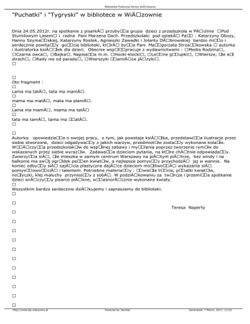 Biblioteka Publiczna Gminy WiÄ…zowna "Puchatki" i "Tygryski" w bibliotece w WiÄ…zownie Dnia 24.05.2012r. na spotkanie z pisarkÄ… przybyÅ‚a grupa dzieci z przedszkola w PÄ™clinie Pod Stumilowym Lasem i radna Pani Marzena Dach. Przedszkolaki pod opiekÄ… PaÅ„ : Katarzyny Obozy, Hanny SzymaÅ„skiej, Katarzyny Rostek, Agnieszki Zawadki i Jolanty DÄ…browskiej bardzo miÅ‚o i serdecznie powitaÅ‚y goÅ›cia biblioteki, ktÃłrÄ… byÅ‚a Pani MaÅ‚gorzata StrzaÅ‚kowska autorka i ilustratorka ksiÄ…Åźek dla dzieci. Obecnie wspÃłÅ‚pracuje z wydawnictwami : Media Rodzina, Czarna owca, Bajka. NapisaÅ‚a m.in. Hocki-klocki, LeÅ›ne gÅ‚upki, Wiersze, Åźe aÅź strach, Rady nie od parady, Wierszyki Å‚amiÄ…ce jÄ™zyki. Oto fragment : Lama ma tatÄ™, tata ma mamÄ™ mama ma matÄ™, mata ma plamÄ™. Lama ma mamÄ™, mama ma tatÄ™ tata ma tamÄ™, tama ma Å‚atÄ™. Autorka opowiedziaÅ‚a o swojej pracy, o tym, jak powstaje ksiÄ…Åźka, przedstawiÅ‚a ilustracje przez siebie stworzone, dzieci odgadywaÅ‚y z jakich warzyw, przedmiotÃłw zostaÅ‚y wykonane kolaÅźe. WłączyÅ‚a przedszkolakÃłw do wspÃłlnej zabawy i myÅ›lenia poprzez tworzenie rymÃłw do wskazanych przez siebie wyrazÃłw. ZadawaÅ‚a dzieciom pytania, na ktÃłre chÄ™tnie odpowiadaÅ‚y. ZwierzyÅ‚a siÄ™, Åźe mieszka w samym centrum Warszawy na piÄ…tym piÄ™trze, bez windy i na balkonie ma swÃłj ogrÃłdek peÅ‚en kwiatÃłw, a najlepsze pomysÅ‚y przychodzÄ… jej w wannie. Na koniec odbyÅ‚y siÄ™ zajÄ™cia plastyczne dajÄ…ce dzieciom moÅźliwość wykazania siÄ™ pomysÅ‚owoÅ›ciÄ… i talentem. Potrzebne materiaÅ‚y : Å›wieÅźe liÅ›cie, pÅ‚atki kwiatÃłw, noÅźyczki, klej maluchy przyniosÅ‚y z sobÄ…. W podziÄ™kowaniu za twÃłrcze i przemiÅ‚e spotkanie dzieci wrÄ™czyÅ‚y pisarce piÄ™kne, wÅ‚asnorÄ™cznie wykonane kwiaty. Wszystkim bardzo serdecznie dziÄ™kujemy i zapraszamy do biblioteki. Teresa Naperty http://www.bp-wiazowna.pl Powered by Joomla! Generated: 7 March, 2017, 13:22 Biblioteka Publiczna Gminy WiÄ…zowna http://www.bp-wiazowna.pl Powered by Joomla! Generated: 7 March, 2017, 13:22