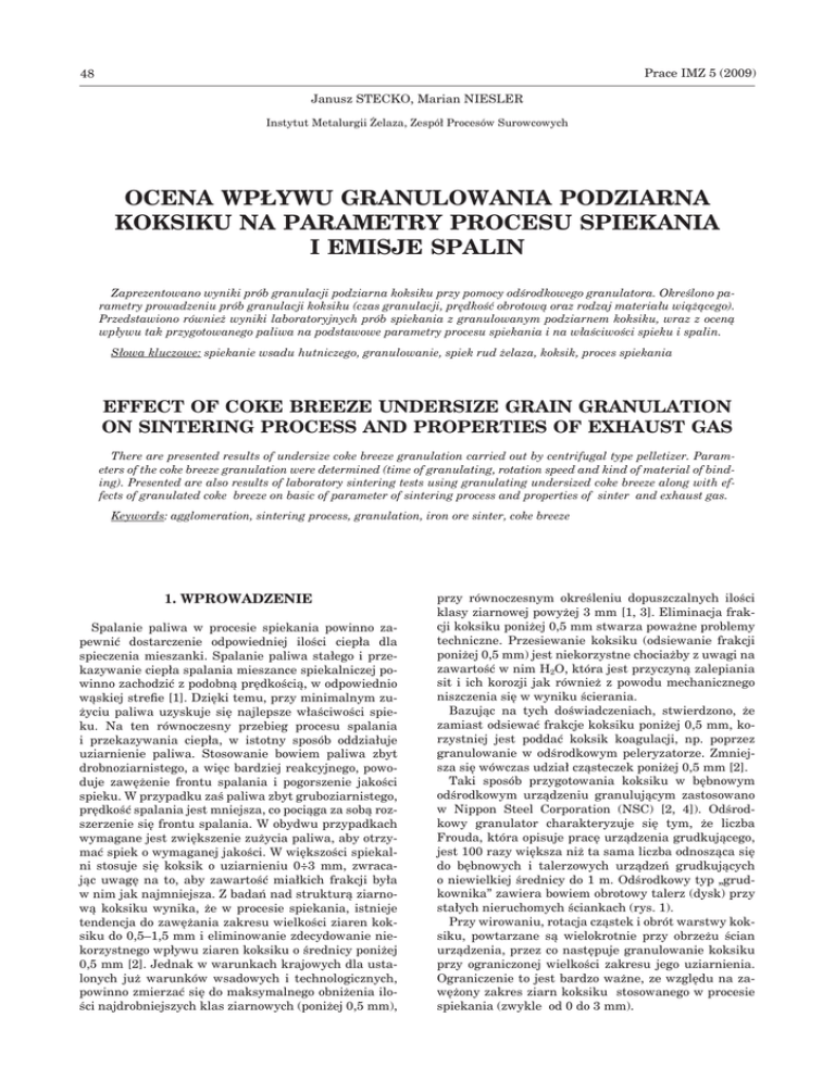 Prace IMZ 5 (2009) 48 Janusz STECKO, Marian NIESLER Instytut Metalurgii Żelaza, Zespół Procesów Surowcowych OCENA WPŁYWU GRANULOWANIA PODZIARNA KOKSIKU NA PARAMETRY PROCESU SPIEKANIA I EMISJE SPALIN Zaprezentowano wyniki prób granulacji podziarna koksiku przy pomocy odśrodkowego granulatora. Określono parametry prowadzeniu prób granulacji koksiku (czas granulacji, prędkość obrotową oraz rodzaj materiału wiążącego). Przedstawiono również wyniki laboratoryjnych prób spiekania z granulowanym podziarnem koksiku, wraz z oceną wpływu tak przygotowanego paliwa na podstawowe parametry procesu spiekania i na właściwości spieku i spalin. Słowa kluczowe: spiekanie wsadu hutniczego, granulowanie, spiek rud żelaza, koksik, proces spiekania EFFECT OF COKE BREEZE UNDERSIZE GRAIN GRANULATION ON SINTERING PROCESS AND PROPERTIES OF EXHAUST GAS There are presented results of undersize coke breeze granulation carried out by centrifugal type pelletizer. Parameters of the coke breeze granulation were determined (time of granulating, rotation speed and kind of material of binding). Presented are also results of laboratory sintering tests using granulating undersized coke breeze along with effects of granulated coke breeze on basic of parameter of sintering process and properties of sinter and exhaust gas. Keywords: agglomeration, sintering process, granulation, iron ore sinter, coke breeze 1. WPROWADZENIE Spalanie paliwa w procesie spiekania powinno zapewnić dostarczenie odpowiedniej ilości ciepła dla spieczenia mieszanki. Spalanie paliwa stałego i przekazywanie ciepła spalania mieszance spiekalniczej powinno zachodzić z podobną prędkością, w odpowiednio wąskiej strefie [1]. Dzięki temu, przy minimalnym zużyciu paliwa uzyskuje się najlepsze właściwości spieku. Na ten równoczesny przebieg procesu spalania i przekazywania ciepła, w istotny sposób oddziałuje uziarnienie paliwa. Stosowanie bowiem paliwa zbyt drobnoziarnistego, a więc bardziej reakcyjnego, powoduje zawężenie frontu spalania i pogorszenie jakości spieku. W przypadku zaś paliwa zbyt gruboziarnistego, prędkość spalania jest mniejsza, co pociąga za sobą rozszerzenie się frontu spalania. W obydwu przypadkach wymagane jest zwiększenie zużycia paliwa, aby otrzymać spiek o wymaganej jakości. W większości spiekalni stosuje się koksik o uziarnieniu 0÷3 mm, zwracając uwagę na to, aby zawartość miałkich frakcji była w nim jak najmniejsza. Z badań nad strukturą ziarnową koksiku wynika, że w procesie spiekania, istnieje tendencja do zawężania zakresu wielkości ziaren koksiku do 0,5–1,5 mm i eliminowanie zdecydowanie niekorzystnego wpływu ziaren koksiku o średnicy poniżej 0,5 mm [2]. Jednak w warunkach krajowych dla ustalonych już warunków wsadowych i technologicznych, powinno zmierzać się do maksymalnego obniżenia ilości najdrobniejszych klas ziarnowych (poniżej 0,5 mm), przy równoczesnym określeniu dopuszczalnych ilości klasy ziarnowej powyżej 3 mm [1, 3]. Eliminacja frakcji koksiku poniżej 0,5 mm stwarza poważne problemy techniczne. Przesiewanie koksiku (odsiewanie frakcji poniżej 0,5 mm) jest niekorzystne chociażby z uwagi na zawartość w nim H2O, która jest przyczyną zalepiania sit i ich korozji jak również z powodu mechanicznego niszczenia się w wyniku ścierania. Bazując na tych doświadczeniach, stwierdzono, że zamiast odsiewać frakcje koksiku poniżej 0,5 mm, korzystniej jest poddać koksik koagulacji, np. poprzez granulowanie w odśrodkowym peleryzatorze. Zmniejsza się wówczas udział cząsteczek poniżej 0,5 mm [2]. Taki sposób przygotowania koksiku w bębnowym odśrodkowym urządzeniu granulującym zastosowano w Nippon Steel Corporation (NSC) [2, 4]). Odśrodkowy granulator charakteryzuje się tym, że liczba Frouda, która opisuje pracę urządzenia grudkującego, jest 100 razy większa niż ta sama liczba odnosząca się do bębnowych i talerzowych urządzeń grudkujących o niewielkiej średnicy do 1 m. Odśrodkowy typ „grudkownika” zawiera bowiem obrotowy talerz (dysk) przy stałych nieruchomych ściankach (rys. 1). Przy wirowaniu, rotacja cząstek i obrót warstwy koksiku, powtarzane są wielokrotnie przy obrzeżu ścian urządzenia, przez co następuje granulowanie koksiku przy ograniczonej wielkości zakresu jego uziarnienia. Ograniczenie to jest bardzo ważne, ze względu na zawężony zakres ziarn koksiku stosowanego w procesie spiekania (zwykle od 0 do 3 mm). Prace IMZ 5 (2009) Ocena wpływu granulowania podziarna koksiku... 49 2. PRZEPROWADZENIE PRÓB GRANULOWANIA NA ODŚRODKOWYM GRANULATORZE Próby granulacji podziarna koksiku prowadzono granulatorze odśrodkowym GS106 (rys. 1). Do prób granulacji zastosowano drobny pył koksowy (ok. 87% frakcji poniżej 0,5 mm) oraz odsianą frakcję koksiku poniżej 0,5 mm. Tak drobne materiały wybrano ze względu na możliwość obserwacji momentu początku tworzenia się granulatu. Zastosowanie np. koksiku w zakresie od 0 do 3 mm, ze względu na podziarno powyżej 2 mm, mogłoby zakłócać obserwacje tworzenia się granulatu. Wielkością świadczącą o zachodzeniu granulacji był wzrost udziału frakcji powyżej 0,5 mm, kosztem frakcji poniżej 0,5 mm. Zgodnie z powyżej przedstawionymi danymi w pracy [1, 2], tworzony granulat z drobnych frakcji paliwa nie powinien przekraczać średnicy 3 mm. Jako materiał wiążący do granulowania zastosowano dodatek wapna palonego i hydratyzowanego w ilości 10%. Zawartość wilgoci ustalono na około 14–15%. Badania granulacji prowadzono przy różnych prędkościach talerza obrotowego (200–500 obr/min) przy stałym czasie granulacji wynoszącym 2 min. Najbardziej korzystne wyniki granulacji uzyskano przy zastosowaniu prędkości obrotowej talerza wynoszącej ok. 300 obr/min, z 10% dodatkiem wapna hydratyzowanego i przy zawartości wilgoci wynoszącej ok. 14–15%. Zawartość wilgoci w granulowanym materiale pozostawała na jednakowym pozi