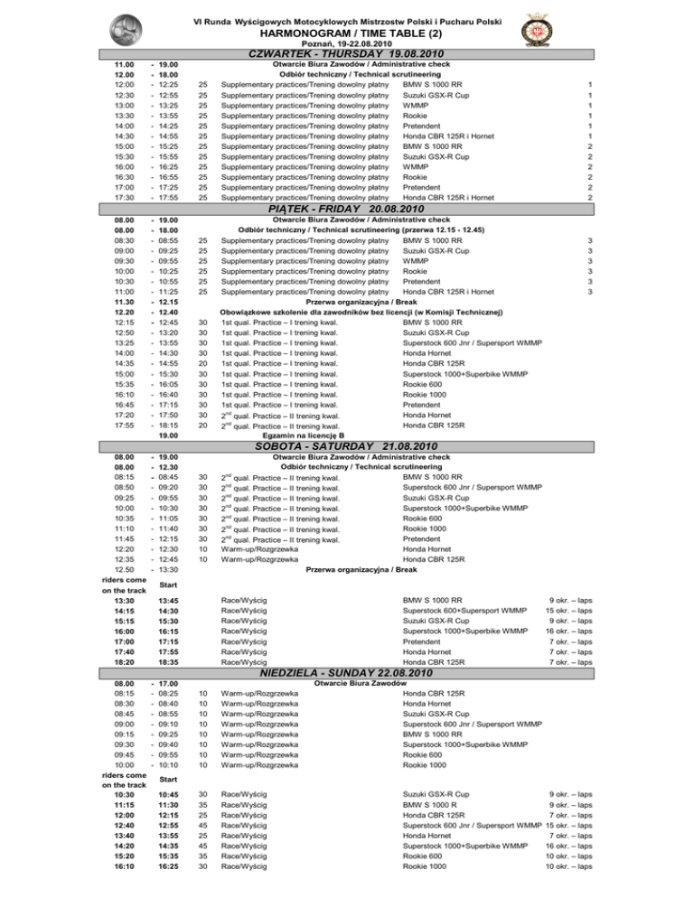 VI Runda Wyścigowych Motocyklowych Mistrzostw Polski i Pucharu Polski HARMONOGRAM / TIME TABLE (2) Poznań, 19-22.08.2010 CZWARTEK - THURSDAY 19.08.2010 11.00 12.00 12:00 12:30 13:00 13:30 14:00 14:30 15:00 15:30 16:00 16:30 17:00 17:30 - 19.00 18.00 12:25 12:55 13:25 13:55 14:25 14:55 15:25 15:55 16:25 16:55 17:25 17:55 08.00 08.00 08:30 09:00 09:30 10:00 10:30 11:00 11.30 12.20 12:15 12:50 13:25 14:00 14:35 15:00 15:35 16:10 16:45 17:20 17:55 - 19.00 18.00 08:55 09:25 09:55 10:25 10:55 11:25 12.15 12.40 12:45 13:20 13:55 14:30 14:55 15:30 16:05 16:40 17:15 17:50 18:15 19.00 08.00 08.00 08:15 08:50 09:25 10:00 10:35 11:10 11:45 12:20 12:35 12.50 riders come on the track 13:30 14:15 15:15 16:00 17:00 17:40 18:20 - 19.00 12.30 08:45 09:20 09:55 10:30 11:05 11:40 12:15 12:30 12:45 13:30 08.00 08:15 08:30 08:45 09:00 09:15 09:30 09:45 10:00 riders come on the track 10:30 11:15 12:00 12:40 13:40 14:20 15:20 16:10 - 25 25 25 25 25 25 25 25 25 25 25 25 Otwarcie Biura Zawodów / Administrative check Odbiór techniczny / Technical scrutineering Supplementary practices/Trening dowolny płatny BMW S 1000 RR Supplementary practices/Trening dowolny płatny Suzuki GSX-R Cup Supplementary practices/Trening dowolny płatny WMMP Supplementary practices/Trening dowolny płatny Rookie Supplementary practices/Trening dowolny płatny Pretendent Supplementary practices/Trening dowolny płatny Honda CBR 125R i Hornet Supplementary practices/Trening dowolny płatny BMW S 1000 RR Supplementary practices/Trening dowolny płatny Suzuki GSX-R Cup Supplementary practices/Trening dowolny płatny WMMP Supplementary practices/Trening dowolny płatny Rookie Supplementary practices/Trening dowolny płatny Pretendent Supplementary practices/Trening dowolny płatny Honda CBR 125R i Hornet 1 1 1 1 1 1 2 2 2 2 2 2 PIĄTEK - FRIDAY 20.08.2010 25 25 25 25 25 25 30 30 30 30 20 30 30 30 30 30 20 Otwarcie Biura Zawodów / Administrative check Odbiór techniczny / Technical scrutineering (przerwa 12.15 - 12.45) Supplementary practices/Trening dowolny płatny BMW S 1000 RR Supplementary practices/Trening dowolny płatny Suzuki GSX-R Cup Supplementary practices/Trening dowolny płatny WMMP Supplementary practices/Trening dowolny płatny Rookie Supplementary practices/Trening dowolny płatny Pretendent Supplementary practices/Trening dowolny płatny Honda CBR 125R i Hornet Przerwa organizacyjna / Break Obowiązkowe szkolenie dla zawodników bez licencji (w Komisji Technicznej) 1st qual. Practice – I trening kwal. BMW S 1000 RR 1st qual. Practice – I trening kwal. Suzuki GSX-R Cup 1st qual. Practice – I trening kwal. Superstock 600 Jnr / Supersport WMMP 1st qual. Practice – I trening kwal. Honda Hornet 1st qual. Practice – I trening kwal. Honda CBR 125R 1st qual. Practice – I trening kwal. Superstock 1000+Superbike WMMP 1st qual. Practice – I trening kwal. Rookie 600 1st qual. Practice – I trening kwal. Rookie 1000 1st qual. Practice – I trening kwal. Pretendent nd Honda Hornet 2 qual. Practice – II trening kwal. nd Honda CBR 125R 2 qual. Practice – II trening kwal. Egzamin na licencję B 3 3 3 3 3 3 SOBOTA - SATURDAY 21.08.2010 30 30 30 30 30 30 30 10 10 Otwarcie Biura Zawodów / Administrative check Odbiór techniczny / Technical scrutineering nd BMW S 1000 RR 2 qual. Practice – II trening kwal. nd Superstock 600 Jnr / Supersport WMMP 2 qual. Practice – II trening kwal. nd Suzuki GSX-R Cup 2 qual. Practice – II trening kwal. nd Superstock 1000+Superbike WMMP 2 qual. Practice – II trening kwal. nd Rookie 600 2 qual. Practice – II trening kwal. nd Rookie 1000 2 qual. Practice – II trening kwal. nd Pretendent 2 qual. Practice – II trening kwal. Warm-up/Rozgrzewka Honda Hornet Warm-up/Rozgrzewka Honda CBR 125R Przerwa organizacyjna / Break Start Race/Wyścig Race/Wyścig Race/Wyścig Race/Wyścig Race/Wyścig Race/Wyścig Race/Wyścig 13:45 14:30 15:30 16:15 17:15 17:55 18:35 BMW S 1000 RR Superstock 600+Supersport WMMP Suzuki GSX-R Cup Superstock 1000+Superbike WMMP Pretendent Honda Hornet Honda CBR 125R 9 okr. – laps 15 okr. – laps 9 okr. – laps 16 okr. – laps 7 okr. – laps 7 okr. – laps 7 okr. – laps NIEDZIELA - SUNDAY 22.08.2010 17.00 08:25 08:40 08:55 09:10 09:25 09:40 09:55 10:10 10 10 10 10 10 10 10 10 Warm-up/Rozgrzewka Warm-up/Rozgrzewka Warm-up/Rozgrzewka Warm-up/Rozgrzewka Warm-up/Rozgrzewka Warm-up/Rozgrzewka Warm-up/Rozgrzewka Warm-up/Rozgrzewka 30 35 25 45 25 45 35 30 Race/Wyścig Race/Wyścig Race/Wyścig Race/Wyścig Race/Wyścig Race/Wyścig Race/Wyścig Race/Wyścig Otwarcie Biura Zawodów Honda CBR 125R Honda Hornet Suzuki GSX-R Cup Superstock 600 Jnr / Supersport WMMP BMW S 1000 RR Superstock 1000+Superbike WMMP Rookie 600 Rookie 1000 Start 10:45 11:30 12:15 12:55 13:55 14:35 15:35 16:25 Suzuki GSX-R Cup BMW S 1000 R Honda CBR 125R Superstock 600 Jnr / Supersport WMMP Honda Hornet Superstock 1000+Superbike WMMP Rookie 600 Rookie 1000 9 okr. – laps 9 okr. – laps 7 okr. – laps 15 okr. – laps 7 okr. – laps 16 okr. – laps 10 okr. – laps 10 okr. – laps