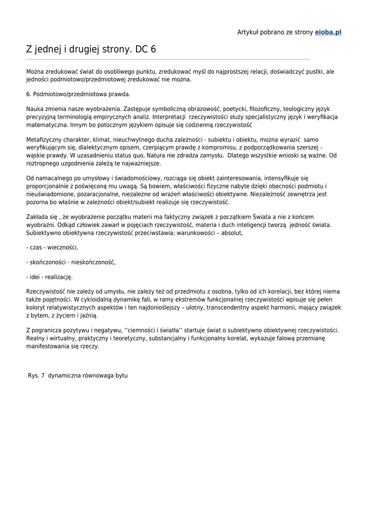 Artykuł pobrano ze strony eioba.pl Z jednej i drugiej strony. DC 6 Można zredukować świat do osobliwego punktu, zredukować myśl do najprostszej relacji, doświadczyć pustki, ale jedności podmiotowo/przedmiotowej zredukować nie można. 6. Podmiotowo/przedmiotowa prawda. Nauka zmienia nasze wyobrażenia. Zastępuje symboliczną obrazowość, poetycki, filozoficzny, teologiczny język precyzyjną terminologią empirycznych analiz. Interpretacji rzeczywistości służy specjalistyczny język i weryfikacja matematyczna. Innym bo potocznym językiem opisuje się codzienną rzeczywistość Metafizyczny charakter, klimat, nieuchwytnego ducha zależności - subiektu i obiektu, można wyrazić samo weryfikującym się, dialektycznym opisem, czerpiącym prawdę z kompromisu, z podporządkowania szerszej wąskie prawdy. W uzasadnieniu status quo, Natura nie zdradza zamysłu. Dlatego wszystkie wnioski są ważne. Od roztropnego uzgodnienia zależą te najważniejsze. Od namacalnego po umysłowy i świadomościowy, rozciąga się obiekt zainteresowania, intensyfikuje się proporcjonalnie z poświęconą mu uwagą. Są bowiem, właściwości fizyczne nabyte dzięki obecności podmiotu i nieuświadomione, pozaracjonalne, niezależne od wrażeń właściwości obiektywne. Niezależność zewnętrza jest pozorna bo właśnie w zależności obiekt/subiekt realizuje się rzeczywistość. Zakłada się , że wyobrażenie początku materii ma faktyczny związek z początkiem Świata a nie z końcem wyobraźni. Odkąd człowiek zawarł w pojęciach rzeczywistość, materia i duch inteligencji tworzą jedność świata. Subiektywno obiektywna rzeczywistość przeciwstawia; warunkowości – absolut, - czas - wieczności, - skończoności - nieskończoność, - idei - realizację. Rzeczywistość nie zależy od umysłu, nie zależy też od przedmiotu z osobna, tylko od ich korelacji, bez której niema także pojętności. W cykloidalną dynamikę fali, w ramy ekstremów funkcjonalnej rzeczywistości wpisuje się pełen koloryt relatywistycznych aspektów i ten najdonioślejszy – ulotny, transcendentny aspekt harmonii, mający związek z bytem, z życiem i jaźnią. Z pogranicza pozytywu i negatywu, ‘’ciemności i światła’’ startuje świat o subiektywno obiektywnej rzeczywistości. Realny i wirtualny, praktyczny i teoretyczny, substancjalny i funkcjonalny korelat, wykazuje falową przemianę manifestowania się rzeczy. Rys. 7 dynamiczna równowaga bytu zjawiskowe ekstremum negatywu Pojęte antytetycznie przesilenia w przemianie zawierają niezliczoną paletę aspektów i punktów widzenia. Razem opisują opozycyjną rzeczywistość. Dualizm sprzeczności tez i wniosków stanowi uzupełniające się wzajemnie opisy, synkretycznej i paradoksalnej rzeczywistości. Podobieństwa i różnice zasadniczo dwóch stron medalu implikują paradoksalną prawdę i pytania o relacyjną istotę rzeczywistości. Czy niekończące się aspekty i możliwe punkty widzenia są obiektywną rzeczywistością czy kompilacją subiektywnych wrażeń? Energia polaryzacji, konfliktu i paradoksu napędza zjawiskowość w kruchym kompromisie i syntezie, w przemianie bez granic. To w przedziale narodzin i śmierci pojawia się życie. Zjawiskowe, transcendentne, bo magiczne życie gwiazd i ludzi. Dynamiczna niepewność w miejscu równowagi, kompromisu kreuje byt o rzeczowym i formalnym znaczeniu. Rozwój bytu należy upatrywać w przesileniach, w doświadczeniu ekstremalnych zdarzeń. Dwuznaczność rzeczywistości jest błogosławieństwem i przekleństwem jednocześnie, ale jedynym sposobem na objawienie się doczesnego bytu i o nim pojęcia. W dialektycznym sporze i właściwej optymalizacji wyłania się złoty środek, akceptacja - ciągle spóźniona mądrość. Podmiot, wynosi rzeczywistość na wyżyny transcendentnego objawienia. Materialne przedstawienie i ponadczasowa treść idei zależnej od, jak się wydaje nierozumnego Ducha, Absolutu ma iście niezgłębiony sens. Oczywiście, naturalistyczny sens interesuje mnie najbardziej. Dlatego tradycję i kulturę pozostawiam specjalistom a w własnej mierze szkicuję obraz praktyka, uczonego na błędach w poszukiwaniu doczesnej transcendencji. Połączenie natury rzeczy z naturą umysłu, daje metafizyczną jakość rzeczywistości. Naturalizm i egocentryzm - jak jest, kontra - jak powinno być, stanowią oś odwiecznych poszukiwań prawdy. Chociaż potrzeba kompromisu w optimum zależności jest oczywista to, optimum pozostanie ruchome. Odpowiedzią na teoretyczność i naturalną łatwość projekcji własnych oczekiwań ma być bliska mi i przyjazna praktykom namacalność rzeczywistości. Niesłychanie ważne i tak samo trudne, jest odróżnianie tego, co subiektywne od obiektywnej rzeczywistości. Subiektywno/obiektywna jedność, odzwierciedlona w teorii panlogizmu i panteizmu, zbieżna jest z wnioskami zarówno nauki jak i filozofii. W indukcji wewnętrznych i zewnętrznych zależności skutki zdarzeń pozostają w relacji z otoczeniem. Stąd, nie ma jednej tajemniczej transcendentnej siły boskiej, lecz złożony wachlarz żywiołów; - ośrodka gwiazd i planet, - fizycznych oddziaływań materii, - funkcjonalnych właściwości rzeczy. Podmiot to osobliwe centrum, iskrzy synergią transcendentnej syntezy, napięcia, jakby przeniesionego z początków Arche – ducha idei i materii. Już wiadomo, że powodzenie takiego oglądu zależy od proporcji i harmonii bądź, co bądź absurdalnej mieszanki. Metafizyka rzeczywistości wymaga tyleż nauki co filozofii, teorii co praktyki, wiedzy i wiary. Jeśli mówimy o transcendencji to na pewno idzie o naszą najbliższą rzeczywistość a mniej o absolut. Bóg prosty jak bezwzględny absolut i złożony jak relatywistyczna rzeczywistość to ten którego szukamy. Tylko nabyta umiejętność obiektywizacji, - subiektywno/obiektywnej perspektywy, odda to co istotne, mianowicie; obraz harmonii przeciwieństw odpowi