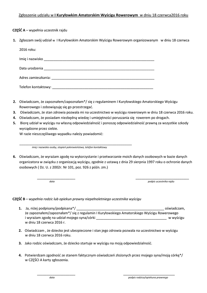 Zgłoszenie udziału w I Kuryłowkim Amatorskim Wyścigu Rowerowym w dniu 18 czerwca2016 roku CZĘŚĆ A – wypełnia uczestnik rajdu 1. Zgłaszam swój udział w I Kuryłowskim Amatorskim Wyścigu Rowerowym organizowanym w dniu 18 czerwca 2016 roku: Imię i nazwisko __________________________________________________________ Data urodzenia __________________________________________________________ Adres zamieszkania: ______________________________________________________ Telefon kontaktowy: _____________________________________________________ 2. Oświadczam, że zapoznałem/zapoznałam*/ się z regulaminem I Kuryłowskiego Amatorskiego Wyścigu Rowerowego i zobowiązuję się go przestrzegać. 3. Oświadczam, że stan zdrowia pozwala mi na uczestnictwo w wyścigu rowerowym w dniu 18 czerwca 2016 roku. 4. Oświadczam, że posiadam niezbędną wiedzę i umiejętności poruszania się rowerem po drogach. 5. Biorę udział w wyścigu na własną odpowiedzialność i ponoszę odpowiedzialność prawną za wszystkie szkody wyrządzone przez siebie. W razie nieszczęśliwego wypadku należy powiadomić: ___________________________________________________________ imię i nazwisko osoby, stopień pokrewieństwa, telefon kontaktowy 6. Oświadczam, że wyrażam zgodę na wykorzystanie i przetwarzanie moich danych osobowych w bazie danych organizatora w związku z organizacją wyścigu, zgodnie z ustawą z dnia 29 sierpnia 1997 roku o ochronie danych osobowych ( Dz. U. z 2002r. Nr 101, poz. 926 z późn. zm.) ____________________ ____________________________ data podpis uczestnika rajdu CZĘŚĆ B – wypełnia rodzic lub opiekun prawny niepełnoletniego uczestnika wyścigu 1. Ja, niżej podpisany/podpisana*/ ______________________________________________ oświadczam, że zapoznałem/zapoznałam*/ się z regulamin I Kuryłowskiego Amatorskiego Wyścigu Rowerowego i wyrażam zgodę na udział mojego syna/córki _____________________________________ w wyścigu w dniu 18 czerwca 2016 r. 2. Oświadczam , że dziecko jest ubezpieczone i stan jego zdrowia pozwala na uczestnictwo w wyścigu w dniu 18 czerwca 2016 roku. 3. Jako rodzic oświadczam, że dziecko startuje w wyścigu na moją odpowiedzialność. 4. Potwierdzam zgodność ze stanem faktycznym oświadczeń złożonych przez mojego syna/moją córkę*/ w CZĘŚCI A karty zgłoszenia. ____________________ data ___________________________ podpis rodzica/opiekuna prawnego