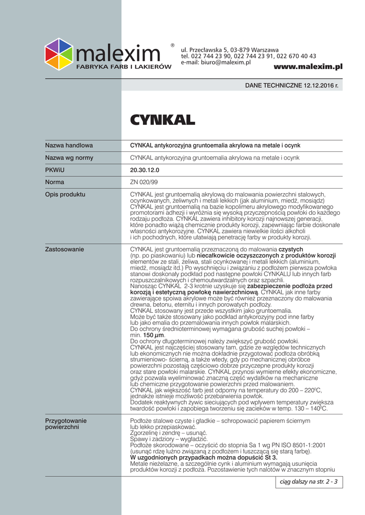 malexim ® FABRYKA FARB I LAKIERÓW ul. Przecławska 5, 03-879 Warszawa tel. 022 744 23 90, 022 744 23 91, 022 670 40 43 e-mail: [email protected] www.malexim.pl DANE TECHNICZNE 12.12.2016 r. CYNKAL Nazwa handlowa CYNKAL antykorozyjna gruntoemalia akrylowa na metale i ocynk Nazwa wg normy CYNKAL antykorozyjna gruntoemalia akrylowa na metale i ocynk PKWiU 20.30.12.0 Norma ZN 020/99 Opis produktu CYNKAL jest gruntoemalią akrylową do malowania powierzchni stalowych, ocynkowanych, żeliwnych i metali lekkich (jak aluminium, miedź, mosiądz) CYNKAL jest gruntoemalią na bazie kopolimeru akrylowego modyfikowanego promotorami adhezji i wyróżnia się wysoką przyczepnością powłoki do każdego rodzaju podłoża. CYNKAL zawiera inhibitory korozji najnowszej generacji, które ponadto wiążą chemicznie produkty korozji, zapewniając farbie doskonałe własności antykorozyjne. CYNKAL zawiera niewielkie ilości alkoholi i ich pochodnych, które ułatwiają penetrację farby w produkty korozji. Zastosowanie CYNKAL jest gruntoemalią przeznaczoną do malowania czystych (np. po piaskowaniu) lub niecałkowicie oczyszczonych z produktów korozji elementów ze stali, żeliwa, stali ocynkowanej i metali lekkich (aluminium, miedź, mosiądz itd.) Po wyschnięciu i związaniu z podłożem pierwsza powłoka stanowi doskonały podkład pod następne powłoki CYNKALU lub innych farb rozpuszczalnikowych i chemoutwardzalnych oraz szpachli. Nanosząc CYNKAL 2-3 krotnie uzyskuje się zabezpieczenie podłoża przed korozją i estetyczną powłokę nawierzchniową. CYNKAL jak inne farby zawierające spoiwa akrylowe może być również przeznaczony do malowania drewna, betonu, eternitu i innych porowatych podłoży. CYNKAL stosowany jest przede wszystkim jako gruntoemalia. Może być także stosowany jako podkład antykorozyjny pod inne farby lub jako emalia do przemalowania innych powłok malarskich. Do ochrony średnioterminowej wymagana grubość suchej powłoki – min. 150 µm. Do ochrony długoterminowej należy zwiększyć grubość powłoki. CYNKAL jest najczęściej stosowany tam, gdzie ze względów technicznych lub ekonomicznych nie można dokładnie przygotować podłoża obróbką strumieniowo- ścierną, a także wtedy, gdy po mechanicznej obróbce powierzchni pozostają częściowo dobrze przyczepne produkty korozji oraz stare powłoki malarskie. CYNKAL przynosi wymierne efekty ekonomiczne, gdyż pozwala wyeliminować znaczną część wydatków na mechaniczne lub chemiczne przygotowanie powierzchni przed malowaniem. CYNKAL jak większość farb jest odporny na temperatury do 200 – 2200C, jednakże istnieje możliwość przebarwienia powłok. Dodatek reaktywnych żywic sieciujących pod wpływem temperatury zwiększa twardość powłoki i zapobiega tworzeniu się zacieków w temp. 130 – 1400C. Przygotowanie powierzchni Podłoże stalowe czyste i gładkie – schropowacić papierem ściernym lub lekko przepiaskować. Zgorzelinę i zendrę – usunąć. Spawy i zadziory – wygładzić. Podłoże skorodowane – oczyścić do stopnia Sa 1 wg PN ISO 8501-1:2001 (usunąć rdzę luźno związaną z podłożem i łuszczącą się starą farbę). W uzgodnionych przypadkach można dopuścić St 3. Metale nieżelazne, a szczególnie cynk i aluminium wymagają usunięcia produktów korozji z podłoża. Pozostawienie tych nalotów w znacznym stopniu ciąg dalszy na str. 2 - 3 malexim ® FABRYKA FARB I LAKIERÓW CYNKAL Przygotowanie powierzchni Sposób użycia str. 2 obniża przyczepność powłok malarskich, powoduje ich zmarszczenie i odspajanie nawet po krótkim czasie eksploatacji. Produkty korozji można usunąć ręcznymi lub mechanicznymi szczotkami stalowymi lub poprzez delikatną obróbkę strumieniowo - ścierną tzw. omiatanie luźnym ścierniwem. Stare powłoki malarskie – starannie sprawdzić przyczepność starych powłok do podłoża zgodnie z PN EN ISO 2409, wykonując tzw. siatkę nacięć. Słabo przylegające powłoki usunąć, pozostałe zmyć roztworem EKOSOLWENTU i schropowacić (piaskowanie, szczotka druciana itp.). Przeprowadzić miejscowo próbne wymalowania w celu sprawdzenia czy nie nastąpi odspojenie całego systemu od podłoża. Mycie - każde podłoże przed malowaniem odtłuścić wodnym roztworem EKOSOLWENTU prod. MALEXIM i spłukać wodą. CYNKAL można nakładać na suche i czyste podłoże za pomocą pędzla, wałka, pistoletu lub przez zanurzenie. Przygotowanie farby: Farbę wymieszać przed użyciem. Do malowania pędzlem rozcieńczać w ilości do 10% rozcieńczalnikiem MALSOLWENT nr 1 prod. MALEXIM. Do malowania przez zanurzenie lub natryskiem należy stosować rozcieńczalnik MALSOLWENT nr 2 (w ilości 20-30%). Lepkości robocze: malowanie pędzlem - lepkość handlowa natrysk pneumatyczny - 20 – 40 s malowanie przez zanurzenie - 25 – 35 s Najkorzystniej jest malować w temperaturach 20 – 30 0C. Następne wymalowania: Krótki czas schnięcia farby zapewnia możliwość 2-krotnego malowania w ciągu jednego dnia, np. dużej konstrukcji nośnej, dachu, ogrodzenia. Następne powłoki CYNKALU lub innych farb można nakładać w dowolnych odstępach czasu, po wyschnięciu poprzedniej powłoki CYNKALU. Właściwości CYNKAL wiąże się z rdzą oraz podłożem metalicznym fizycznie i chemicznie.Posiada wysoką trwałość barwy i odporność na podwyższone temperatury. Tworzy powłoki charakteryzujące się bardzo dobrymi właściwościami mechanicznymi i świetną przyczepnością do podłoża. Kolor Gama kolorów oraz RAL, NCS lub według uzgodnień. Opakowania 0,2; 0,3; 0,7; 2,5; 10 litrów malexim ® FABRYKA FARB I LAKIERÓW CYNKAL str. 3 Wydajność Zawartość części stałych: 55 ± 2% obj. lub 65 ± 2% wag. Grubość warstwy powłoki mokrej, µm - 100 Grubość warstwy powłoki suchej, µm - 55 Zużycie teoretyczne przy grubości 100 µm suchej powłoki 0,18 dcm³/m² lub 0,23 kg/m². Zalecana ilość warstw: 2 Wydajność praktyczna uzależniona je