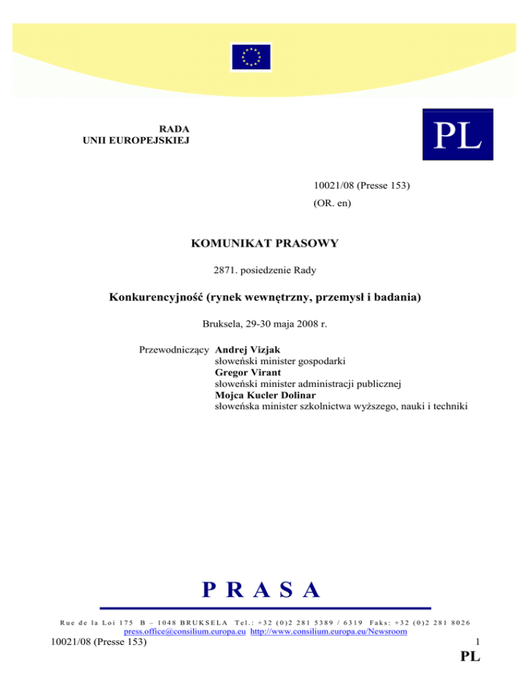 PL RADA UII EUROPEJSKIEJ 10021/08 (Presse 153) (OR. en) KOMUIKAT PRASOWY 2871. posiedzenie Rady Konkurencyjność (rynek wewnętrzny, przemysł i badania) Bruksela, 29-30 maja 2008 r. Przewodniczący Andrej Vizjak słoweński minister gospodarki Gregor Virant słoweński minister administracji publicznej Mojca Kucler Dolinar słoweńska minister szkolnictwa wyższego, nauki i techniki PRASA Rue de la Loi 175 B – 1048 BRUKSELA Tel.: +32 (0)2 281 5389 / 6319 Faks: +32 (0)2 281 8026 [email protected] http://www.consilium.europa.eu/Newsroom 10021/08 (Presse 153) 1 PL 29.-30.V.2008 Główne wyniki posiedzenia Rady Rada przyjęła konkluzje w sprawie konkurencyjności i innowacyjności przemysłu europejskiego. Przyjęła także konkluzje w sprawie lepszych uregulowań prawnych, a zwłaszcza zmniejszenia obciążeń administracyjnych wobec przedsiębiorców, upraszczania prawa oraz sporządzania ocen skutków regulacji. Rada przyjęła rozporządzenie ustanawiające wspólną inicjatywę technologiczną dotyczącą wodoru i ogniw paliwowych. Rada przyjęła rezolucję w sprawie zarządzania własnością intelektualną podczas transferu wiedzy. Przyjęła także konkluzje z zakresu badań naukowych, a mianowicie: • • • • konkluzje w sprawie europejskich infrastruktur badawczych i ich wymiaru regionalnego; konkluzje w sprawie sprzyjających życiu rodzinnemu ścieżek rozwoju dla naukowców; konkluzje w sprawie zapoczątkowania procesu lublańskiego (ku pełnemu urzeczywistnieniu europejskiej przestrzeni badawczej); konkluzje w sprawie oceny i monitorowania unijnych ramowych programów badań. 10021/08 (Presse 153) 2 PL 29.-30.V.2008 SPIS TREŚCI1 UCZESTICY ................................................................................................................................... 5 OMAWIAE PUKTY KONKURENCYJNOŚĆ I INNOWACYJNOŚĆ PRZEMYSŁU EUROPEJSKIEGO – konkluzje Rady ..................................................................................................................................... 7 PRZEGLĄD INICJATYWY DOTYCZĄCEJ LEPSZYCH UREGULOWAŃ PRAWNYCH – konkluzje Rady ..................................................................................................................................... 7 WŁASNOŚĆ INTELEKTUALNA: ULEPSZANIE SYSTEMU PATENTOWEGO W EUROPIE ........................................................................................................................................ 8 ZARZĄDZANIE WŁASNOŚCIĄ INTELEKTUALNĄ PODCZAS TRANSFERU WIEDZY – rezolucja Rady................................................................................................................................... 9 WSPÓLNA INICJATYWA TECHNOLOGICZNA DOTYCZĄCA WODORU I OGNIW PALIWOWYCH................................................................................................................................ 11 EUROPEJSKIE INFRASTRUKTURY BADAWCZE I ICH WYMIAR REGIONALNY – konkluzje Rady ................................................................................................................................... 13 BADANIA NAUKOWE A ŚCIEŻKI ROZWOJU NAUKOWCÓW – konkluzje Rady .................. 13 URZECZYWISTNIANIE EUROPEJSKIEJ PRZESTRZENI BADAWCZEJ: PROCES LUBLAŃSKI – konkluzje Rady......................................................................................................... 13 SPRAWY RÓŻNE............................................................................................................................. 14 IE ZATWIERDZOE PUKTY BADA+IA – Ocena unijnych ramowych programów badań: sprawozdanie 09/2007 Trybunału Obrachunkowego – konkluzje Rady....................................................................................................................................................... 17 WSPÓL+A POLITYKA ZAGRA+ICZ+A I BEZPIECZEŃSTWA – Poparcie UE dla globalnej inicjatywy na rzecz zwalczania terroryzmu jądrowego .............................................. 17 – Specjalny przedstawiciel UE przy Unii Afrykańskiej ........................................................................................... 17 1 Jeżeli deklaracje, konkluzje lub rezolucje zostały przez Radę formalnie przyjęte, jest to zaznaczone w tytule danego punktu, a tekst jest umieszczony w cudzysłowie. Dokumenty, do których odesłano w tekście, są dostępne na internetowej stronie Rady (http:/www.consilium.europa.eu). Gwiazdką oznaczono akty przyjęte wraz z oświadczeniami do protokołu Rady przeznaczonymi do wiadomości publicznej; oświadczenia te można znaleźć na wyżej wspomnianej internetowej stronie Rady lub uzyskać z biura prasowego. 10021/08 (Presse 153) 3 PL 29.-30.V.2008 RYBOŁÓWSTWO – Środki ochrony zasobów i egzekwowania prawa na obszarze NAFO................................................................... 18 10021/08 (Presse 153) 4 PL 29.-30.V.2008 UCZESTICY Rządy państw członkowskich oraz Komisja Europejska były reprezentowane przez następujące osoby: Belgia: Vincent VAN QUICKENBORNE Patricia CEYSENS minister przedsiębiorczości i uproszczeń administracyjnych minister gospodarki, przedsiębiorczości, nauki, innowacji i handlu zagranicznego Bułgaria: Nina RADEWA wiceminister gospodarki i energii Republika Czeska: Ondrzej LISZKA Martin TLAPA minister edukacji, młodzieży i sportu wiceminister przemysłu i handlu Dania: Helge SANDER Michael DITHMER minister nauki, techniki i rozwoju sekretarz stanu w Ministerstwie Gospodarki, Handlu i Przemysłu iemcy: Michael GLOS Brigitte ZYPRIES Annette SCHAVAN federalny minister gospodarki i techniki federalna minister sprawiedliwości federalna minister edukacji i badań naukowych Estonia: Tõnis LUKAS minister edukacji i nauki Irlandia: Mary COUGHLAN wicepremier i minister przedsiębiorczości, handlu i zatrudnienia Grecja: Christos FOLIAS minister rozwoju Hiszpania: Diego LÓPEZ GARRIDO Carlos MARTÍNEZ ALONSO sekretarz stanu ds. Unii Europejskiej 