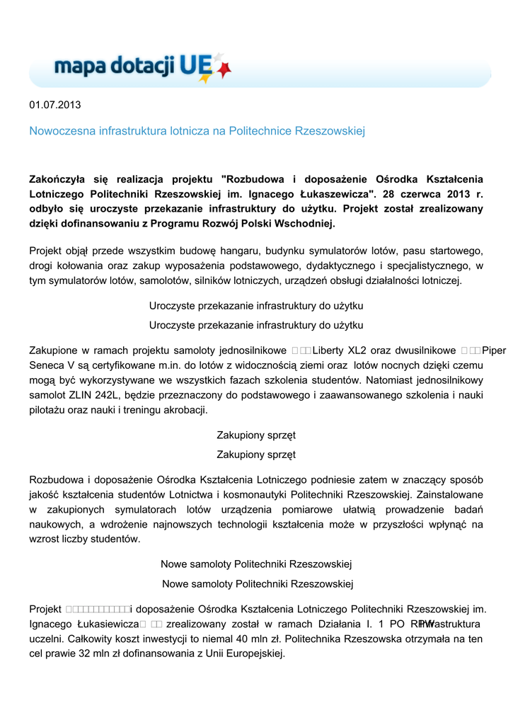 01.07.2013 Nowoczesna infrastruktura lotnicza na Politechnice Rzeszowskiej Zakończyła się realizacja projektu "Rozbudowa i doposażenie Ośrodka Kształcenia Lotniczego Politechniki Rzeszowskiej im. Ignacego Łukaszewicza". 28 czerwca 2013 r. odbyło się uroczyste przekazanie infrastruktury do użytku. Projekt został zrealizowany dzięki dofinansowaniu z Programu Rozwój Polski Wschodniej. Projekt objął przede wszystkim budowę hangaru, budynku symulatorów lotów, pasu startowego, drogi kołowania oraz zakup wyposażenia podstawowego, dydaktycznego i specjalistycznego, w tym symulatorów lotów, samolotów, silników lotniczych, urządzeń obsługi działalności lotniczej. Uroczyste przekazanie infrastruktury do użytku Uroczyste przekazanie infrastruktury do użytku Zakupione w ramach projektu samoloty jednosilnikowe ጀ Liberty XL2 oraz dwusilnikowe ጀ Piper Seneca V są certyfikowane m.in. do lotów z widocznością ziemi oraz lotów nocnych dzięki czemu mogą być wykorzystywane we wszystkich fazach szkolenia studentów. Natomiast jednosilnikowy samolot ZLIN 242L, będzie przeznaczony do podstawowego i zaawansowanego szkolenia i nauki pilotażu oraz nauki i treningu akrobacji. Zakupiony sprzęt Zakupiony sprzęt Rozbudowa i doposażenie Ośrodka Kształcenia Lotniczego podniesie zatem w znaczący sposób jakość kształcenia studentów Lotnictwa i kosmonautyki Politechniki Rzeszowskiej. Zainstalowane w zakupionych symulatorach lotów urządzenia pomiarowe ułatwią prowadzenie badań naukowych, a wdrożenie najnowszych technologii kształcenia może w przyszłości wpłynąć na wzrost liczby studentów. Nowe samoloty Politechniki Rzeszowskiej Nowe samoloty Politechniki Rzeszowskiej Projekt Ḁ刀漀稀戀甀搀漀眀愀 i doposażenie Ośrodka Kształcenia Lotniczego Politechniki Rzeszowskiej im. Ignacego Łukasiewicza ᴀ zrealizowany został w ramach Działania I. 1 PO RPW Infrastruktura uczelni. Całkowity koszt inwestycji to niemal 40 mln zł. Politechnika Rzeszowska otrzymała na ten cel prawie 32 mln zł dofinansowania z Unii Europejskiej. Więcej informacji o projekcie w zakładce Projekty w programie. Źródło zdjęć: Politechnika Rzeszowska, M. Kozioł