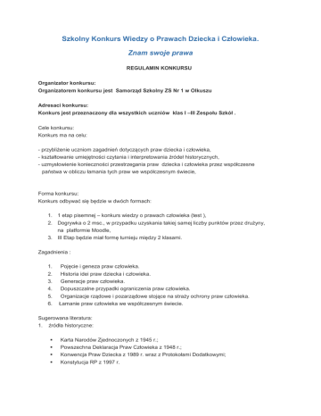 Szkolny Konkurs Wiedzy o Prawach Dziecka i Człowieka. Znam swoje prawa REGULAMIN KONKURSU Organizator konkursu: Organizatorem konkursu jest Samorząd Szkolny ZS Nr 1 w Olkuszu Adresaci konkursu: Konkurs jest przeznaczony dla wszystkich uczniów klas I –III Zespołu Szkół . Cele konkursu: Konkurs ma na celu: - przybliżenie uczniom zagadnień dotyczących praw dziecka i człowieka, - kształtowanie umiejętności czytania i interpretowania źródeł historycznych, - uzmysłowienie konieczności przestrzegania praw dziecka i człowieka przez współczesne państwa w obliczu łamania tych praw we współczesnym świecie, Forma konkursu: Konkurs odbywać się będzie w dwóch formach: 1. 1 etap pisemnej – konkurs wiedzy o prawach człowieka (test ), 2. Dogrywka o 2 msc., w przypadku uzyskania takiej samej liczby punktów przez drużyny, na platformie Moodle, 3. III Etap będzie miał formę turnieju między 2 klasami. Zagadnienia : 1. Pojęcie i geneza praw człowieka. 2. Historia idei praw dziecka i człowieka. 3. Generacje praw człowieka. 4. Dopuszczalne przypadki ograniczenia praw człowieka. 5. Organizacje rządowe i pozarządowe stojące na straży ochrony praw człowieka. 6. Łamanie praw człowieka we współczesnym świecie. Sugerowana literatura: 1. źródła historyczne: Karta Narodów Zjednoczonych z 1945 r.; Powszechna Deklaracja Praw Człowieka z 1948 r.; Konwencja Praw Dziecka z 1989 r. wraz z Protokołami Dodatkowymi; Konstytucja RP z 1997 r. 2. Podręcznik do wiedzy o społeczeństwie dla szkół ponadgimnazjalnych. Ocena prac konkursowych: 1. Test pisemny sprawdzać będzie trzyosobowa komisja, powołana przez organizatora konkursu według podanego klucza odpowiedzi. 2. Etap turniejowy będzie oceniała trzyosobowa komisja, powołana przez organizatora konkursu . Harmonogram konkursu: 1. Przewodniczący zgłaszają 2 osoby, które będą reprezentować klasy do opiekuna Samorządu do 23.10.2015. 2. Test pisemny – 27.10. 2015r. na 3 godzinie lekcyjnej. 3. II etap po uzgodnieniu terminu. 4. III etap 06.12.2015. Ogłoszenie wyników tego samego dnia. SERDECZNIE ZAPRASZAM DO WZIĘCIA UDZIAŁU W KONKURSIE.