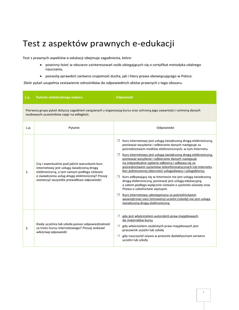 Test z aspektów prawnych e-edukacji Test z prawnych aspektów e-edukacji obejmuje zagadnienia, które: powinny leżeć w obszarze zainteresowań osób ubiegających się o certyfikat metodyka zdalnego nauczania, pozwolą sprawdzić zarówno znajomość ducha, jak i litery prawa obowiązującego w Polsce. Zbiór pytań uzupełnia zestawienie odnośników do odpowiednich aktów prawnych z tego obszaru. L.p. Pytanie wielokrotnego wyboru Odpowiedź Pierwsza grupa pytań dotyczy zagadnień związanych z organizacją kursu oraz ochroną jego zawartości i ochroną danych osobowych uczestników zajęć na odległość. L.p. Pytanie Odpowiedzi Kurs internetowy jest usługą świadczoną drogą elektroniczną, ponieważ wysyłanie i odbieranie danych następuje za pośrednictwem mediów elektronicznych, w tym Internetu. 1. Czy i ewentualnie pod jakimi warunkami kurs internetowy jest usługą świadczoną drogą elektroniczną, a tym samym podlega Ustawie o świadczeniu usług drogą elektroniczną? Proszę zaznaczyć wszystkie prawidłowe odpowiedzi. Kurs internetowy jest usługą świadczoną drogą elektroniczną, ponieważ wysyłanie i odbieranie danych następuje na indywidualne żądanie odbiorcy i odbywa się za pośrednictwem systemów teleinformatycznych lub Internetu bez jednoczesnej obecności usługodawcy i usługobiorcy. Kurs odbywający się w Internecie nie jest usługą świadczoną drogą elektroniczną, ponieważ jest usługą edukacyjną, a zatem podlega wyłącznie Ustawie o systemie oświaty oraz Prawu o szkolnictwie wyższym. Kurs internetowy udostępniany za pośrednictwem wewnętrznej sieci (intranetu) uczelni (szkoły) nie jest usługą świadczoną drogą elektroniczną. gdy jest właścicielem autorskich praw majątkowych do materiałów kursu 2. Kiedy uczelnia lub szkoła ponosi odpowiedzialność za treści kursu internetowego? Proszę wskazać właściwą odpowiedź. gdy właścicielem osobistych praw majątkowych jest pracownik uczelni lub szkoły gdy nauczyciel używa w procesie dydaktycznym serwera uczelni lub szkoły 1 Ustawa o świadczeniu usług drogą elektroniczną Ustawa Prawo telekomunikacyjne 3. Które ustawy zawierają przepisy dotyczące ochrony danych osobowych uczestników kursów internetowych? Proszę zaznaczyć wszystkie prawidłowe odpowiedzi. Ustawa o ochronie danych osobowych Ustawa o ochronie baz danych Ustawa o zwalczaniu nieuczciwej konkurencji Ustawa o prawie autorskim i prawach pokrewnych Ustawa o narodowym zasobie archiwalnym i archiwach uzyskanie jawnej zgody uczestników kursu 4. Co stanowi wystarczający warunek, aby organizator kursu internetowego mógł przetwarzać dane osobowe jego uczestników? Proszę wskazać właściwą odpowiedź. rejestracja uczestników na zajęciach podpisanie umowy z uczestnikiem kursu o świadczeniu usługi edukacyjnej umieszczenie odpowiedniej informacji w regulaminie korzystania z kursu informacje jednoznacznie identyfikujące instytucję organizującą kurs informacje o możliwych zagrożeniach związanych z korzystaniem z kursu 5. Jakie informacje muszą bezwzględnie znaleźć się w regulaminie korzystania z kursu internetowego? Proszę zaznaczyć wszystkie prawidłowe odpowiedzi. informacje na temat wymagań dotyczących specjalistycznego oprogramowania wykorzystywanego w trakcie realizacji kursu informacje dotyczące zapewnienia bezpiecznego korzystania z kursu dane identyfikujące autora kursu bądź materiałów dydaktycznych dane identyfikujące nauczyciela prowadzącego kurs informacje dotyczące sposobu wyrażenia zgody oraz zakresu, czasu i celu przetwarzania danych osobowych przed zapisaniem się na kurs 6. Kiedy należy zapoznać uczestników z regulaminem kursu internetowego? Proszę wskazać właściwą odpowiedź. przed udostępnieniem loginu i hasła, tj. przed stałym dostępem do kursu w trakcie pierwszych dni trwania kursu 2 Druga grupa pytań dotyczy ochrony praw autorskich twórców kursu. 7. Z jakich powodów kurs internetowy podlega ochronie z tytułu Ustawy o prawie autorskim i prawach pokrewnych? Proszę zaznaczyć wszystkie prawidłowe odpowiedzi. ponieważ jest przejawem działalności twórczej o indywidualnym charakterze ponieważ ma utrwaloną postać ponieważ jest przeznaczony do rozpowszechniania ponieważ ma wartość rynkową akty normatywne lub ich urzędowe projekty proste informacje prasowe grafiki komputerowe eseje ćwiczeniowe 8. Które z wymienionych rezultatów ludzkiej twórczości nie są przedmiotem prawa autorskiego? Proszę zaznaczyć wszystkie prawidłowe odpowiedzi. skrypty akademickie fotografie materiały dydaktyczne urzędowe dokumenty, materiały, znaki i symbole instrukcje do ćwiczeń opublikowane opisy patentowe lub ochronne wzory sprawozdań programy komputerowe w chwili powzięcia zamiaru stworzenia kursu po spełnieniu wymagań formalnych po zakończeniu prac nad kursem 9. Kiedy autor kursu internetowego nabywa prawa autorskie? Proszę wskazać właściwą odpowiedź. w momencie rozpoczęcia utrwalenia utworu w momencie rozpowszechnienia kursu w momencie udostępnienia utworu osobom trzecim w momencie zawarcia umowy z wydawcą (producentem) 10. Czy autor kursu internetowego może zrzec się osobistych praw autorskich do swojego utworu lub przekazać je innej osobie (fizycznej lub prawnej)? Proszę wskazać właściwą odpowiedź. tak nie nigdy 11. Kiedy wygasają osobiste prawa autorskie twórcy kursu internetowego? Proszę wskazać właściwą odpowiedź. bezpośrednio po śmierci autora po 70 latach od śmierci autora po przekazaniu ich wydawcy (producentowi) po zrzeczeniu się ich przez autora 3 tak, bez żadnych warunków poza warunkiem powiadomienia o zbyciu pierwotnego nabywcy 12. Czy autor kursu internetowego może przekazać materialne prawa autorskie więcej niż jednemu nabywcy? Proszę zaznaczyć wszystkie prawidłowe odpowiedzi. tak, o ile każdy z nabywców wyrazi na to zgodę tak, o ile każdy z nabywców nabywa prawa do innych pó