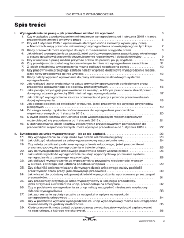 100 PYTAŃ O WYNAGRODZENIA Spis treści I. Wynagrodzenia za pracę – jak prawidłowo ustalać ich wysokość . . . . . . . . . . . . . . . . . . . . . . . . 1. Czy w związku z podwyższeniem minimalnego wynagrodzenia od 1 stycznia 2015 r. trzeba pracownikom zmienić umowy o pracę . . . . . . . . . . . . . . . . . . . . . . . . . . . . . . . . . . . . . . . . . . . 2. Czy od 1 stycznia 2015 r. opiekunowie starszych osób i kierowcy wykonujący pracę w Niemczech mają prawo do minimalnego wynagrodzenia obowiązującego w tym kraju 3. Kiedy pracownik może wystąpić do sądu z roszczeniem o wypłatę premii . . . . . . . . . . . . . 4. Jak obliczyć wynagrodzenie za przestój, jeżeli oprócz wynagrodzenia zasadniczego określonego w stawce godzinowej pracownik otrzymuje premię regulaminową i dodatek funkcyjny . . . . . . . . . 5. Czy w umowie o pracę można przyznać prawo do prowizji po jej wypłacie . . . . . . . . . . . . . 6. Czy prowizja może zostać wypłacona w innym terminie niż wynagrodzenie zasadnicze . . . . 7. Z jakich składników wynagrodzenia można odliczyć nadpłaconą pensję . . . . . . . . . . . . . . . 8. Czy pracownikom przejętego zakładu należy wypłacić dodatkowe wynagrodzenie roczne, jeżeli nowy pracodawca go nie wypłaca . . . . . . . . . . . . . . . . . . . . . . . . . . . . . . . . . . . . . . . . . . 9. Kiedy należy wypłacić wyrównanie do płacy minimalnej w akordowym systemie wynagradzania . . . . . . . . . . . . . . . . . . . . . . . . . . . . . . . . . . . . . . . . . . . . . . . . . . . . . . . . . . . . . . . 10. Jak rozliczyć zwrot wydatków na zakup artykułów spożywczych poniesionych przez pracownika uprawnionego do posiłków profilaktycznych . . . . . . . . . . . . . . . . . . . . . . . . . . . . 11. Jaka pensja przysługuje pracownikowi za miesiąc, w którym pracodawca stracił prawo do wynagradzania go kwotą 80% minimalnego wynagrodzenia . . . . . . . . . . . . . . . . . . . . . . . 12. Jak obliczyć wynagrodzenie za czas odsunięcia od pracy z powodu przeciwwskazań do jej wykonywania . . . . . . . . . . . . . . . . . . . . . . . . . . . . . . . . . . . . . . . . . . . . . . . . . . . . . . . . . . . 13. Jak pobrać podatek od świadczeń w naturze, jeżeli pracownik nie uzyskuje przychodów pieniężnych . . . . . . . . . . . . . . . . . . . . . . . . . . . . . . . . . . . . . . . . . . . . . . . . . . . . . . . . . . . . . . . . . . 14. Od czego zależy uzyskanie dofinansowania do wynagrodzeń pracowników niepełnosprawnych od 1 stycznia 2015 r. . . . . . . . . . . . . . . . . . . . . . . . . . . . . . . . . . . . . . . . . . 15. O zwrot jakich kosztów zatrudnienia osób wspomagających niepełnosprawnych może ubiegać się pracodawca od 1 stycznia 2015 r. . . . . . . . . . . . . . . . . . . . . . . . . . . . . . . . . 16. O dofinansowanie jakich kosztów związanych z przystosowaniem pomieszczeń dla pracowników niepełnosprawnych może wystąpić pracodawca od 1 stycznia 2015 r. . . . . II. Świadczenia za urlop wypoczynkowy – jak za nie zapłacić. . . . . . . . . . . . . . . . . . . . . . . . . . . . . . 17. Czy wynagrodzenie za urlop może być niższe od minimalnej płacy . . . . . . . . . . . . . . . . . . . 18. Jak obliczyć ekwiwalent za urlop wypoczynkowy na przełomie roku . . . . . . . . . . . . . . . . . . 19. Czy należy przeliczać podstawę wynagrodzenia urlopowego, jeżeli pracownikowi przyznano podwyżkę wynagrodzenia w trakcie urlopu . . . . . . . . . . . . . . . . . . . . . . . . . . . . . . 20. Czy do wynagrodzenia urlopowego pracownika należy wliczać premie . . . . . . . . . . . . . . . . 21. Jak ustalić wysokość wynagrodzenia za urlop wypoczynkowy po zmianie systemu wynagradzania z czasowego na prowizyjny . . . . . . . . . . . . . . . . . . . . . . . . . . . . . . . . . . . . . 22. Jak obliczyć wynagrodzenie za wypoczynek w przypadku nieobecności w pracy w okresie, z którego jest ustalana podstawa urlopowa . . . . . . . . . . . . . . . . . . . . . . . . . . . . . 23. Czy składniki zmienne wliczane do wynagrodzenia urlopowego należy podzielić przez wymiar czasu pracy, jaki obowiązuje pracownika . . . . . . . . . . . . . . . . . . . . . . . . . . . . . 24. Jak wliczać do podstawy urlopowej składniki wynagrodzenia wypracowane przez zespół pracowników. . . . . . . . . . . . . . . . . . . . . . . . . . . . . . . . . . . . . . . . . . . . . . . . . . . . . . . . . . . . . . . . . 25. Czy pracownicy przysługuje urlop wypoczynkowy u kolejnego pracodawcy, jeżeli otrzymała ekwiwalent za urlop, przechodząc na emeryturę . . . . . . . . . . . . . . . . . . . . . 26. Czy w podstawie wynagrodzenia za urlop należy uwzględnić niesłusznie wypłacony składnik wynagrodzenia . . . . . . . . . . . . . . . . . . . . . . . . . . . . . . . . . . . . . . . . . . . . . . . . . . . . . . . 27. Jak zaprzestanie wypłaty ryczałtu za nadgodziny wpływa na wysokość wynagrodzenia urlopowego . . . . . . . . . . . . . . . . . . . . . . . . . . . . . . . . . . . . . . . . . . . . . . . . . . . . 28. Czy w podstawie wymiaru wynagrodzenia za urlop wypoczynkowy można nie uwzględniać rekompensaty za godziny nadliczbowe. . . . . . . . . . . . . . . . . . . . . . . . . . . . . . . . . . . . . . . . . . . 29. Kiedy pracownik może żądać od pracodawcy zwrotu kosztów wycieczki zaplanowanej na czas urlopu, z którego nie skorzystał . . . . . . . . . . . . . . . . . . . . . . . . . . . . . . . . . . . . . . . . . . WWW.INFOR.PL 6 6 7 8 9 10 11 12 13 14 16 17 18 19 20 21 22 23 23 24 25 26 28 29 30 31 32 33 34 35 36 3 100 PYTAŃ O WYNAGRODZENIA III. Godziny nadliczbowe – jak je zrekompensować . . . . . . . . . . . . . . . . . . . . . . . . . . . . . . . . . . . . . 30. Jak podwyżka pensji wpływa na ryczałt za nadgodziny . . . . . . . . . . . . . . . . . . . . . . . . . . . . . 31. Jak wynagradzać pracownika za nadgodziny wypracowane w Polsce i za granicą . . . . . . . . . . 32. Kiedy należy p