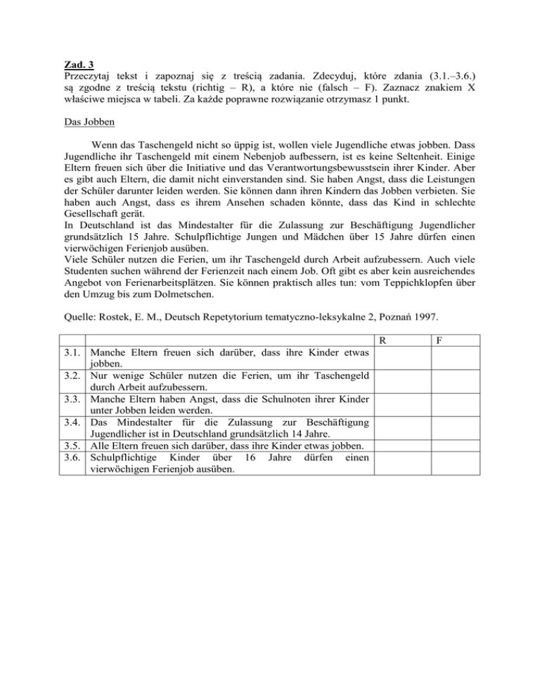 Zad. 3 Przeczytaj tekst i zapoznaj się z treścią zadania. Zdecyduj, które zdania (3.1.–3.6.) są zgodne z treścią tekstu (richtig – R), a które nie (falsch – F). Zaznacz znakiem X właściwe miejsca w tabeli. Za każde poprawne rozwiązanie otrzymasz 1 punkt. Das Jobben Wenn das Taschengeld nicht so üppig ist, wollen viele Jugendliche etwas jobben. Dass Jugendliche ihr Taschengeld mit einem Nebenjob aufbessern, ist es keine Seltenheit. Einige Eltern freuen sich über die Initiative und das Verantwortungsbewusstsein ihrer Kinder. Aber es gibt auch Eltern, die damit nicht einverstanden sind. Sie haben Angst, dass die Leistungen der Schüler darunter leiden werden. Sie können dann ihren Kindern das Jobben verbieten. Sie haben auch Angst, dass es ihrem Ansehen schaden könnte, dass das Kind in schlechte Gesellschaft gerät. In Deutschland ist das Mindestalter für die Zulassung zur Beschäftigung Jugendlicher grundsätzlich 15 Jahre. Schulpflichtige Jungen und Mädchen über 15 Jahre dürfen einen vierwöchigen Ferienjob ausüben. Viele Schüler nutzen die Ferien, um ihr Taschengeld durch Arbeit aufzubessern. Auch viele Studenten suchen während der Ferienzeit nach einem Job. Oft gibt es aber kein ausreichendes Angebot von Ferienarbeitsplätzen. Sie können praktisch alles tun: vom Teppichklopfen über den Umzug bis zum Dolmetschen. Quelle: Rostek, E. M., Deutsch Repetytorium tematyczno-leksykalne 2, Poznań 1997. R 3.1. Manche Eltern freuen sich darüber, dass ihre Kinder etwas jobben. 3.2. Nur wenige Schüler nutzen die Ferien, um ihr Taschengeld durch Arbeit aufzubessern. 3.3. Manche Eltern haben Angst, dass die Schulnoten ihrer Kinder unter Jobben leiden werden. 3.4. Das Mindestalter für die Zulassung zur Beschäftigung Jugendlicher ist in Deutschland grundsätzlich 14 Jahre. 3.5. Alle Eltern freuen sich darüber, dass ihre Kinder etwas jobben. 3.6. Schulpflichtige Kinder über 16 Jahre dürfen einen vierwöchigen Ferienjob ausüben. F