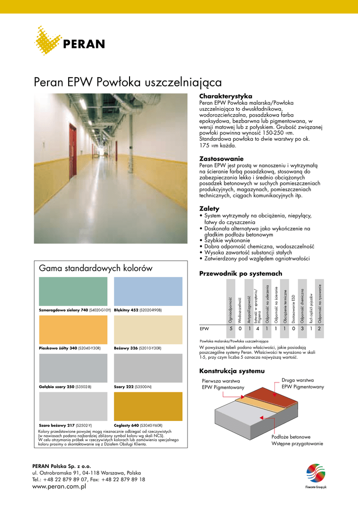 PERAN Peran EPW Powłoka uszczelniająca Charakterystyka Peran EPW Powłoka malarska/Powłoka uszczelniająca to dwuskładnikowa, wodorozcieńczalna, posadzkowa farba epoksydowa, bezbarwna lub pigmentowana, w wersji matowej lub z połyskiem. Grubość związanej powłoki powinna wynosić 150-250 µm. Standardowa powłoka to dwie warstwy po ok. 175 µm każda. Zastosowanie Peran EPW jest prostą w nanoszeniu i wytrzymałą na ścieranie farbą posadzkową, stosowaną do zabezpieczania lekko i średnio obciążonych posadzek betonowych w suchych pomieszczeniach produkcyjnych, magazynach, pomieszczeniach technicznych, ciągach komunikacyjnych itp. Zalety • System wytrzymały na obciążenia, niepylący, łatwy do czyszczenia • Doskonała alternatywa jako wykończenie na gładkim podłożu betonowym • Szybkie wykonanie • Dobra odporność chemiczna, wodoszczelność • Wysoka zawartość substancji stałych • Zatwierdzony pod względem ogniotrwałości Piaskowo żółty 340 (S2040-Y30R) Beżowy 326 (S2010-Y30R) Odporność na rysowanie Ruch ciężkich pojazdów Odporność chemiczna Dostosowanie ESD Obciążenie termiczne Odporność na ścieranie Odporność na uderzenia Łatwość w sprzątaniu/ Higiena Antypoślizgowość Wodoszczelność Szmaragdowo zielony 740 (S4020-G10Y) Błękitny 452 (S2020-R90B) Przewodnik po systemach Ognioodporność Gama standardowych kolorów W powyższej tabeli podano właściwości, jakie posiadają poszczególne systemy Peran. Właściwości te wyrażono w skali 1-5, przy czym liczba 5 oznacza najwyższą wartość. Konstrukcja systemu Gołębio szary 250 (S3502-B) Szary 222 (S3500-N) Szaro beżowy 217 (S2502-Y) Ceglasty 640 (S3040-Y60R) Kolory przedstawione powyżej mogą nieznacznie odbiegać od rzeczywistych (w nawiasach podano najbardziej zbliżony symbol koloru wg skali NCS). W celu otrzymania próbek w rzeczywistych kolorach lub zamówienia specjalnego koloru prosimy o skontaktowanie się z Działem Obsługi Klienta. PERAN Polska Sp. z o.o. ul. Ostrobramska 91, 04-118 Warszawa, Polska Tel.: +48 22 879 89 07, Fax: +48 22 879 89 18 www.peran.com.pl Pierwsza warstwa EPW Pigmentowany Druga warstwa EPW Pigmentowany Podłoże betonowe Wstępne przygotowanie Nowe posadzki betonowe: Usunąć warstwę mleczka cementowego, np. szlifierką z tarczą diamentową. Stare posadzki betonowe, posadzki ze zniszczoną lub słabo przylegającą farbą: W razie potrzeby powierzchnię należy dokładnie umyć oraz szlifować tarczą diamentową aż do uzyskania czystej powierzchni betonowej. Stare powłoki/powłoki malarskie epoksydowe lub akrylowe o dobrej przyczepności do podłoża: Powierzchnię należy umyć, przeszlifować np. tarczą diamentową i dokładnie odkurzyć. Prosimy pamiętać o tym, że: Jakość podłoża betonowego powinna odpowiadać obowiązującej klasie tolerancji oraz wymogom stawianym pomieszczeniu z uwagi na prowadzoną w nim działalność. W przypadku zanieczyszczenia podłoża betonowego np. substancjami olejowymi lub innymi środkami, w celu uzyskania fachowej porady, należy skontaktować się z dostawcą. Jeżeli podłoże betonowe posadowione jest na gruncie, należy zawsze wykonać pomiary wilgotności podłoża. Prawidłowo wykonany drenaż oraz/lub izolacja przeciwwilgociowa zabezpieczają przed przenikaniem wilgoci w reakcji kapilarnej lub jako ciśnienia pary wodnej. • W razie potrzeby szpachlowanie należy wykonywać przy zastosowaniu zaprawy epoksydowej Peran z odpowiednim wypełniaczem lub specjalnej, mineralnej szpachlówki Peran. Należy sprawdzić prawidłowość wykonania spadków podłoża. • Maksymalna, dopuszczalna wilgotność względna podłoża wynosi 97%. Zastosowanie i warunki techniczne Peran EPW Powłoka uszczelniająca Dostawca: PERAN Polska Sp.z o.o. Dzia∏ Obs∏ugi Klienta Tel.:+48 22 879 89 07 Kolor nr xxx. Grubość jednej warstwy 175 µm. Powierzchnia z połyskiem lub matowa. Prace wstępne i sposób wykonania zgodnie ze wskazówkami dostawcy. Prace powinny zostać przeprowadzone przez Autoryzowanego Wykonawcę oraz udokumentowane zgodnie z procedurami systemu zapewnienia jakości i kontroli wykonania systemów Peran. Renowację uszkodzonych fragmentów powierzchni posadzki powinien przeprowadzić Autoryzowany Wykonawca systemów Peran. Wpływ na środowisko Produkt końcowy uważany jest za nieszkodliwy dla zdrowia i środowiska. Bezspoinowość i doskonała przyczepność do podłoża powodują, że system spełnia wymagania higieniczne i ochrony środowiska. Powłoka jest łatwa do utrzymania w czystości i wymaga tylko w minimalnym zakresie stosowania środków chemicznych. Dzięki dużej przyczepności do podłoża i odporności na ścieranie powłoka jest trwała i nie wymaga wielu napraw ani zabiegów renowacyjnych. W przypadku konieczności renowacji istniejąca powierzchnia powłoki, po uprzednim przygotowaniu, stanowi doskonałe podłoże dla nowych systemów i powłok renowacyjnych Peran. Dane techniczne Temperatura eksploatacji (po całkowitym utwardzeniu) od –20°C do +60°C. Peran EPW Bezbarwny Następną warstwę można nakładać po upływie 6 godzin w temperaturze 18°C. Ruch pieszy po 12 godzinach wiązania w temperaturze 18°C. Produkt ulega całkowitemu utwardzeniu po upływie 5-7 dni. Peran EPW Pigmentowany Następną warstwę można nakładać po upływie 12 godzin w temperaturze 18°C Ruch pieszy po 12 godzinach wiązania w temperaturze 18°C. Produkt ulega całkowitemu utwardzeniu po upływie 5-7 dni. Objętościowa zawartość substancji stałych Peran EPW Bezbarwny z połyskiem Peran EPW Pigmentowany z połyskiem Peran EPW Pigmentowany matowy Produkty wchodzące w skład systemu Peran EPW Bezbarwny lub Peran EPW Pigmentowany Czyszczenie i renowacja Powierzchnię można zamiatać, odkurzać, przecierać na mokro lub sprzątać przy użyciu maszyny czyszczącej wyposażonej w miękką tarczę szczotkową. Można stosować środki czyszczące o wartości pH od 4 do 11. N