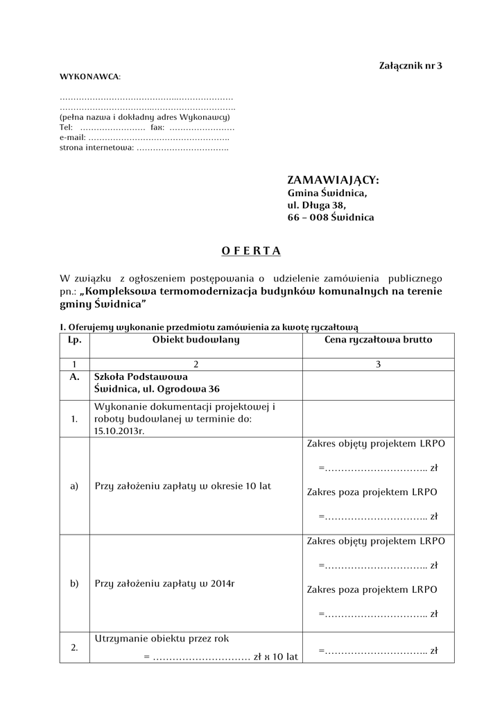 Załącznik nr 3 WYKONAWCA: …………………………………….………………… …………………………….…………………………. (pełna nazwa i dokładny adres Wykonawcy) Tel: …………………… fax: …………………… e-mail: ……………………………………………. strona internetowa: ……………………………. ZAMAWIAJĄCY: Gmina Świdnica, ul. Długa 38, 66 – 008 Świdnica OFERTA W związku z ogłoszeniem postępowania o udzielenie zamówienia publicznego pn.: „Kompleksowa termomodernizacja budynków komunalnych na terenie gminy Świdnica” I. Oferujemy wykonanie przedmiotu zamówienia za kwotę ryczałtową Lp. 1 A. 1. Obiekt budowlany 2 Szkoła Podstawowa Świdnica, ul. Ogrodowa 36 Cena ryczałtowa brutto 3 Wykonanie dokumentacji projektowej i roboty budowlanej w terminie do: 15.10.2013r. Zakres objęty projektem LRPO =………………………….. zł a) Przy założeniu zapłaty w okresie 10 lat Zakres poza projektem LRPO =………………………….. zł Zakres objęty projektem LRPO =………………………….. zł b) Przy założeniu zapłaty w 2014r Zakres poza projektem LRPO =………………………….. zł 2. Utrzymanie obiektu przez rok = ………………………… zł x 10 lat =………………………….. zł B. 1. Suma A.a: ................................................ Suma A.b: ................................................ Szkoła Podstawowa, Koźla 117 Wykonanie dokumentacji projektowej i roboty budowlanej w terminie do 15.10.2013r Zakres objęty projektem LRPO =………………………….. zł a) Przy założeniu zapłaty w okresie 10 lat Zakres poza projektem LRPO =………………………….. zł Zakres objęty projektem LRPO =………………………….. zł b) Przy założeniu zapłaty w 2014r Zakres poza projektem LRPO =………………………….. zł 2. C. 1. Utrzymanie obiektu przez rok = ………………………… zł x 10 lat =………………………….. zł Suma B.a: ............................................... Suma B.b: Szkoła Podstawowa, Słone , ul. Szkolna 1 ............................................... Wykonanie dokumentacji projektowej i roboty budowlanej w terminie do 15.10.2013r Zakres objęty projektem LRPO =………………………….. zł a) Przy założeniu zapłaty w okresie 10 lat Zakres poza projektem LRPO =………………………….. zł Zakres objęty projektem LRPO b) Przy założeniu zapłaty w 2014r =………………………….. zł Zakres poza projektem LRPO =………………………….. zł 2. Utrzymanie obiektu przez rok = ………………………… zł x 10 lat Suma C.a: D. 1. 2. 1. 2. 1. 2. Wykonanie dokumentacji projektowej i roboty budowlanej w terminie do 15.10.2013r Utrzymanie obiektu przez rok 1. 2. H 1. ............................................................. = ………………………… zł x 10 lat ............................................................. Sala wiejska Koźla Wykonanie dokumentacji projektowej i roboty budowlanej w terminie do 15.10.2013r Utrzymanie obiektu przez rok ................................................. ............................................................. = ………………………… zł x 10 lat ............................................................. Suma F: G. ............................................... Sala wiejska Letnica Suma E: F. ................................................ Suma C.b: ................................................ Budynek administracyjny, Świdnica ul. Długa 25 Wykonanie dokumentacji projektowej i roboty budowlanej w terminie do ............................................................. 15.10.2013r Utrzymanie obiektu przez rok = ………………………… zł x 10 lat ............................................................. Suma D: E. =………………………….. zł Sala wiejska Grabowiec Wykonanie dokumentacji projektowej i roboty budowlanej w terminie do 15.10.2013r Utrzymanie obiektu przez rok ............................................... ............................................................. = ………………………… zł x 10 lat ............................................................. Sala wiejska Lipno Wykonanie dokumentacji projektowej i roboty budowlanej w terminie do 15 =………………………….. zł 2. I. 1. 2. J. 1. 2. października 2013r. Utrzymanie obiektu przez rok = ……………………… zł x 10 lat Suma H: Sala wiejska, Drzonów 9 Wykonanie dokumentacji projektowej i roboty budowlanej w terminie do 15 października 2013r. Utrzymanie obiektu przez rok = ……………………… zł x 10 lat =………………………….. zł Suma I: ………………………….. zł Sala wiejska, Słone ul. Słoneczna 44 Wykonanie dokumentacji projektowej i roboty budowlanej w terminie do 15 października 2013r. Utrzymanie obiektu przez rok = ……………………… zł x 10 lat Suma J: K. 1. 2. L. 1. 2. Ł. 1. 2. M 1. =………………………….. zł Sala wiejska, Buchałów Wykonanie dokumentacji projektowej i roboty budowlanej w terminie do 15 października 2013r. Utrzymanie obiektu przez rok = ……………………… zł x 10 lat Suma K: Sala wiejska, Piaski 12 Wykonanie dokumentacji projektowej i roboty budowlanej w terminie do 15 października 2013r. Utrzymanie obiektu przez rok = ……………………… zł x 10 lat ………………………….. zł =………………………….. zł =………………………….. zł =………………………….. zł ………………………….. zł =………………………….. zł =………………………….. zł ………………………….. zł =………………………….. zł =………………………….. zł Suma L: Sala wiejska , Wilkanowo, ul. Szkolna 3 Wykonanie dokumentacji projektowej i roboty budowlanej w terminie do