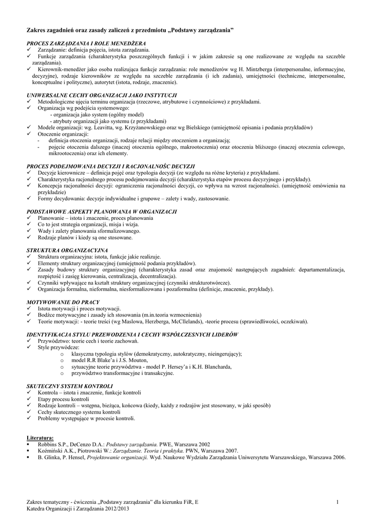 Zakres zagadnień oraz zasady zaliczeń z przedmiotu „Podstawy zarządzania” PROCES ZARZĄDZANIA I ROLE MENEDŻERA Zarządzanie: definicja pojęcia, istota zarządzania. Funkcje zarządzania (charakterystyka poszczególnych funkcji i w jakim zakresie są one realizowane ze względu na szczeble zarządzania). Kierownik-menedżer jako osoba realizująca funkcje zarządzania: role menedżerów wg H. Mintzberga (interpersonalne, informacyjne, decyzyjne), rodzaje kierowników ze względu na szczeble zarządzania (i ich zadania), umiejętności (techniczne, interpersonalne, konceptualne i polityczne), autorytet (istota, rodzaje, znaczenie). UNIWERSALNE CECHY ORGANIZACJI JAKO INSTYTUCJI Metodologiczne ujęcia terminu organizacja (rzeczowe, atrybutowe i czynnościowe) z przykładami. Organizacja wg podejścia systemowego: - organizacja jako system (ogólny model) - atrybuty organizacji jako systemu (z przykładami) Modele organizacji: wg. Leavitta, wg. Krzyżanowskiego oraz wg Bielskiego (umiejętność opisania i podania przykładów) Otoczenie organizacji: definicja otoczenia organizacji, rodzaje relacji między otoczeniem a organizacją; pojęcie otoczenia dalszego (inaczej otoczenia ogólnego, makrootoczenia) oraz otoczenia bliższego (inaczej otoczenia celowego, mikrootoczenia) oraz ich elementy. PROCES PODEJMOWANIA DECYZJI I RACJONALNOŚC DECYZJI Decyzje kierownicze – definicja pojęć oraz typologia decyzji (ze względu na różne kryteria) z przykładami. Charakterystyka racjonalnego procesu podejmowania decyzji (charakterystyka etapów procesu decyzyjnego i przykłady). Koncepcja racjonalności decyzji: ograniczenia racjonalności decyzji, co wpływa na wzrost racjonalności. (umiejętność omówienia na przykładzie) Formy decydowania: decyzje indywidualne i grupowe – zalety i wady, zastosowanie. PODSTAWOWE ASPEKTY PLANOWANIA W ORGANIZACJI Planowanie – istota i znaczenie, proces planowania Co to jest strategia organizacji, misja i wizja. Wady i zalety planowania sformalizowanego. Rodzaje planów i kiedy są one stosowane. STRUKTURA ORGANIZACYJNA Struktura organizacyjna: istota, funkcje jakie realizuje. Elementy struktury organizacyjnej (umiejętność podania przykładów). Zasady budowy struktury organizacyjnej (charakterystyka zasad oraz znajomość następujących zagadnień: departamentalizacja, rozpiętość i zasięg kierowania, centralizacja, decentralizacja). Czynniki wpływające na kształt struktury organizacyjnej (czynniki strukturotwórcze). Organizacja formalna, nieformalna, niesformalizowana i pozaformalna (definicje, znaczenie, przykłady). MOTYWOWANIE DO PRACY Istota motywacji i proces motywacji. Bodźce motywacyjne i zasady ich stosowania (m.in.teoria wzmocnienia) Teorie motywacji: - teorie treści (wg Maslowa, Herzberga, McCllelands), -teorie procesu (sprawiedliwości, oczekiwań). IDENTYFIKACJA STYLU PRZEWODZENIA I CECHY WSPÓŁCZESNYCH LIDERÓW Przywództwo: teorie cech i teorie zachowań. Style przywódcze: o klasyczna typologia stylów (demokratyczny, autokratyczny, nieingerujący); o model R.R Blake’a i J.S. Mouton, o sytuacyjne teorie przywództwa - model P. Hersey’a i K.H. Blancharda, o przywództwo transformacyjne i transakcyjne. SKUTECZNY SYSTEM KONTROLI Kontrola – istota i znaczenie, funkcje kontroli Etapy procesu kontroli Rodzaje kontroli – wstępna, bieżąca, końcowa (kiedy, każdy z rodzajów jest stosowany, w jaki sposób) Cechy skutecznego systemu kontroli Problemy występujące w procesie kontroli. Literatura: Robbins S.P., DeCenzo D.A.: Podstawy zarządzania. PWE, Warszawa 2002 Koźmiński A.K., Piotrowski W.: Zarządzanie. Teoria i praktyka. PWN, Warszawa 2007. B. Glinka, P. Hensel, Projektowanie organizacji. Wyd. Naukowe Wydziału Zarządzania Uniwersytetu Warszawskiego, Warszawa 2006. Zakres tematyczny - ćwiczenia „Podstawy zarządzania” dla kierunku FiR, E Katedra Organizacji i Zarządzania 2012/2013 1 Konsultacje, semestr zimowy 2012/2013: - mgr Malwina Szarek e-mail: [email protected] pn. 13.00-14.00 oraz 16.00-17.00 pokój P1 Sekretariat Katedry: pokój 336 Podstawy zaliczenia - Podstawą zaliczenia jest kolokwium w formie pisemnej oraz zadania realizowane podczas zajęć jak i w formie pracy domowej. - Termin kolokwium został podany w poniższej tabeli. Terminy są wiążące. Kolokwium będzie oceniane w skali 0-40 punktów. - Kolokwium można poprawiać tylko raz. Nieusprawiedliwiona nieobecność na kolokwium = 0 punktów. O ewentualnej nieobecności proszę informować przed kolokwium. - Dodatkowo student będzie zobowiązany do wykonania zadań/ćwiczeń, za które może uzyskać w sumie 10 punktów. Zadania będą przyjmowane tylko w terminie wyznaczonym podczas zajęć. - Ocena z ćwiczeń = punkty z kolokwium + punkty za ćwiczenia + punkty dodatkowe. - Maksymalnie można uzyskać 50 punktów. - Zamiana punktów na ocenę: do 29 – ndst 30-33 – dst 34-37 – dst+ 38-41 – db 42-45 – db+ od 46 – bdb Terminy kolokwiów Grupa 123 120, 124 113 121, 122 Kolokwium 8 stycznia 11 stycznia 14 stycznia 18 stycznia Zakres tematyczny - ćwiczenia „Podstawy zarządzania” dla kierunku FiR, E Katedra Organizacji i Zarządzania 2012/2013 2