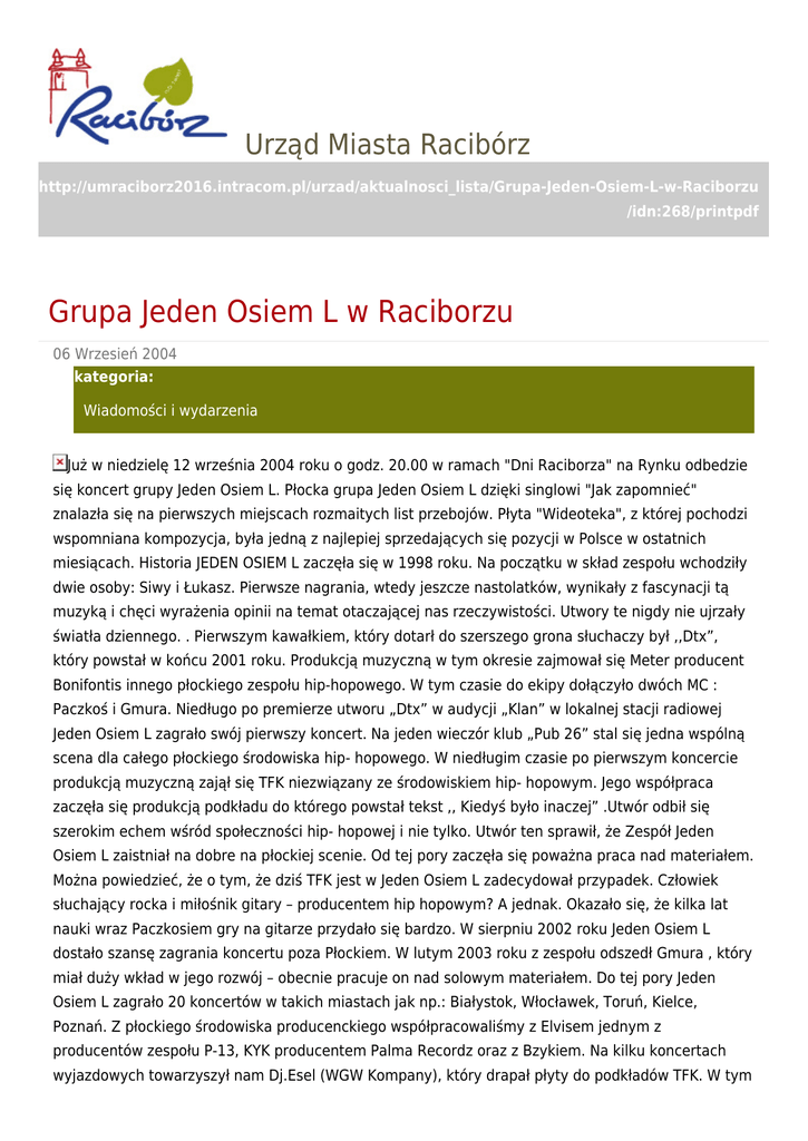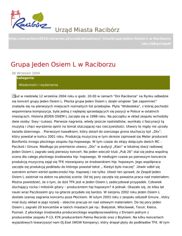 Urząd Miasta Racibórz http://umraciborz2016.intracom.pl/urzad/aktualnosci_lista/Grupa-Jeden-Osiem-L-w-Raciborzu /idn:268/printpdf Grupa Jeden Osiem L w Raciborzu 06 Wrzesień 2004 kategoria: Wiadomości i wydarzenia Już w niedzielę 12 września 2004 roku o godz. 20.00 w ramach "Dni Raciborza" na Rynku odbedzie się koncert grupy Jeden Osiem L. Płocka grupa Jeden Osiem L dzięki singlowi "Jak zapomnieć" znalazła się na pierwszych miejscach rozmaitych list przebojów. Płyta "Wideoteka", z której pochodzi wspomniana kompozycja, była jedną z najlepiej sprzedających się pozycji w Polsce w ostatnich miesiącach. Historia JEDEN OSIEM L zaczęła się w 1998 roku. Na początku w skład zespołu wchodziły dwie osoby: Siwy i Łukasz. Pierwsze nagrania, wtedy jeszcze nastolatków, wynikały z fascynacji tą muzyką i chęci wyrażenia opinii na temat otaczającej nas rzeczywistości. Utwory te nigdy nie ujrzały światła dziennego. . Pierwszym kawałkiem, który dotarł do szerszego grona słuchaczy był ,,Dtx”, który powstał w końcu 2001 roku. Produkcją muzyczną w tym okresie zajmował się Meter producent Bonifontis innego płockiego zespołu hip-hopowego. W tym czasie do ekipy dołączyło dwóch MC : Paczkoś i Gmura. Niedługo po premierze utworu „Dtx” w audycji „Klan” w lokalnej stacji radiowej Jeden Osiem L zagrało swój pierwszy koncert. Na jeden wieczór klub „Pub 26” stal się jedna wspólną scena dla całego płockiego środowiska hip- hopowego. W niedługim czasie po pierwszym koncercie produkcją muzyczną zajął się TFK niezwiązany ze środowiskiem hip- hopowym. Jego współpraca zaczęła się produkcją podkładu do którego powstał tekst ,, Kiedyś było inaczej” .Utwór odbił się szerokim echem wśród społeczności hip- hopowej i nie tylko. Utwór ten sprawił, że Zespół Jeden Osiem L zaistniał na dobre na płockiej scenie. Od tej pory zaczęła się poważna praca nad materiałem. Można powiedzieć, że o tym, że dziś TFK jest w Jeden Osiem L zadecydował przypadek. Człowiek słuchający rocka i miłośnik gitary – producentem hip hopowym? A jednak. Okazało się, że kilka lat nauki wraz Paczkosiem gry na gitarze przydało się bardzo. W sierpniu 2002 roku Jeden Osiem L dostało szansę zagrania koncertu poza Płockiem. W lutym 2003 roku z zespołu odszedł Gmura , który miał duży wkład w jego rozwój – obecnie pracuje on nad solowym materiałem. Do tej pory Jeden Osiem L zagrało 20 koncertów w takich miastach jak np.: Białystok, Włocławek, Toruń, Kielce, Poznań. Z płockiego środowiska producenckiego współpracowaliśmy z Elvisem jednym z producentów zespołu P-13, KYK producentem Palma Recordz oraz z Bzykiem. Na kilku koncertach wyjazdowych towarzyszył nam Dj.Esel (WGW Kompany), który drapał płyty do podkładów TFK. W tym miejscu należy również wspomnieć o Oli, która na kilku koncertach ubarwiała nasze kawałki swoim wokalem. Utwór „wszystkie te chwile” w jej wykonaniu to naszym zdaniem- mistrzostwo. To był dla nas okres nauki, zarówno tego jak dobrze robić muzykę, jak i tego jak zachowywać się na scenie. Kilka miesięcy temu zainteresowała się nami poznańska wytwórnia UMC Records. Wtedy to praca nad materiałem nabrała dużego tempa. Materiał jest już gotowy i ukaże się w listopadzie 2003. Wszystkie wokale oraz mastering zostały zrealizowane w Dillegal Studio- Oborniki WLKP.(wielkie dzięki dla Donia ( Ascetoholix) za gościnę oraz pomoc przy realizacji naszej płyty. Płyta zatytułowana jest „Wideoteka”. Tytuł płyty bardzo dobrze odzwierciedla zawartość krążka. Znajdują się na nim zarówno starsze produkcje jak i te najnowsze. Pierwszym singlem promującym krążek będzie utwór „Jak zapomnieć”. Klip do utworu jest już gotowy i jego premiera odbędzie się na początku listopada. Na płycie gościnnie udział wzięła: Sandra- ( utwór „czasem bywa tak). Scratche na płycie –Dj Hen. Dziś możemy bez wątpienia powiedzieć, że Jeden Osiem L to zespół przyjaciół z jednej ulicy, którym los dał szanse. Informacje ze strony Jeden Osiem L